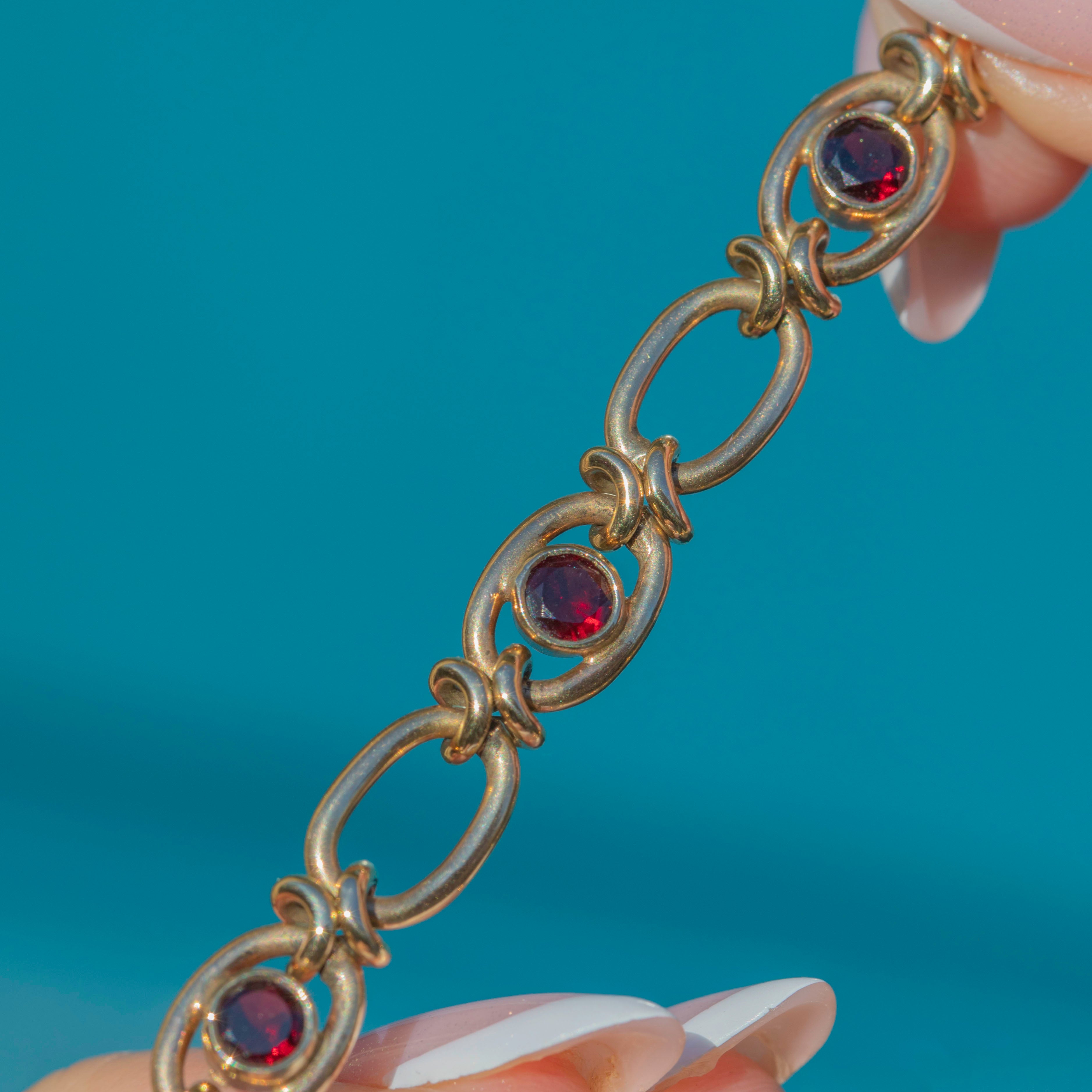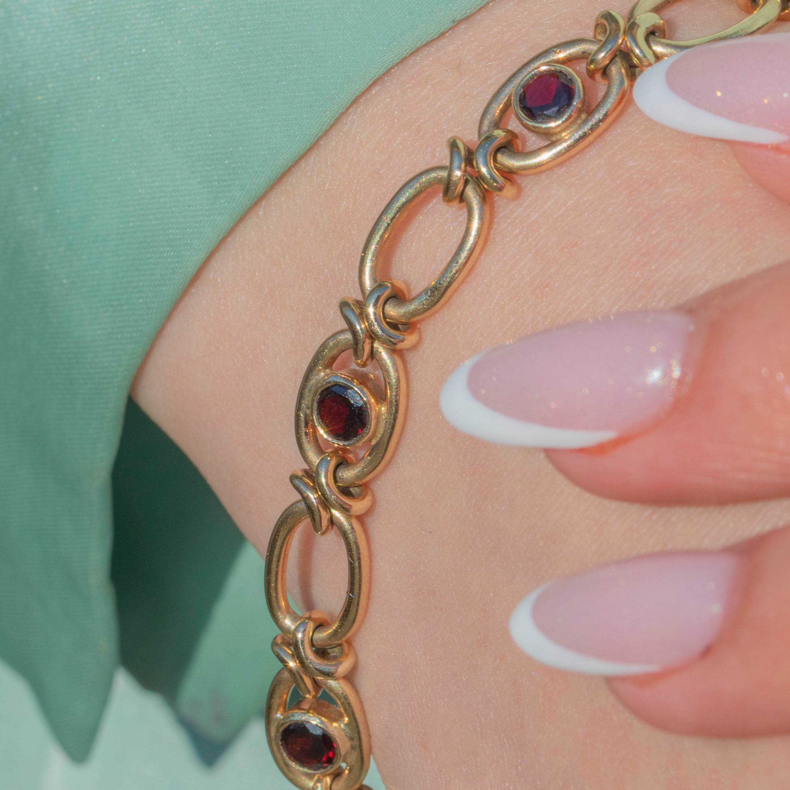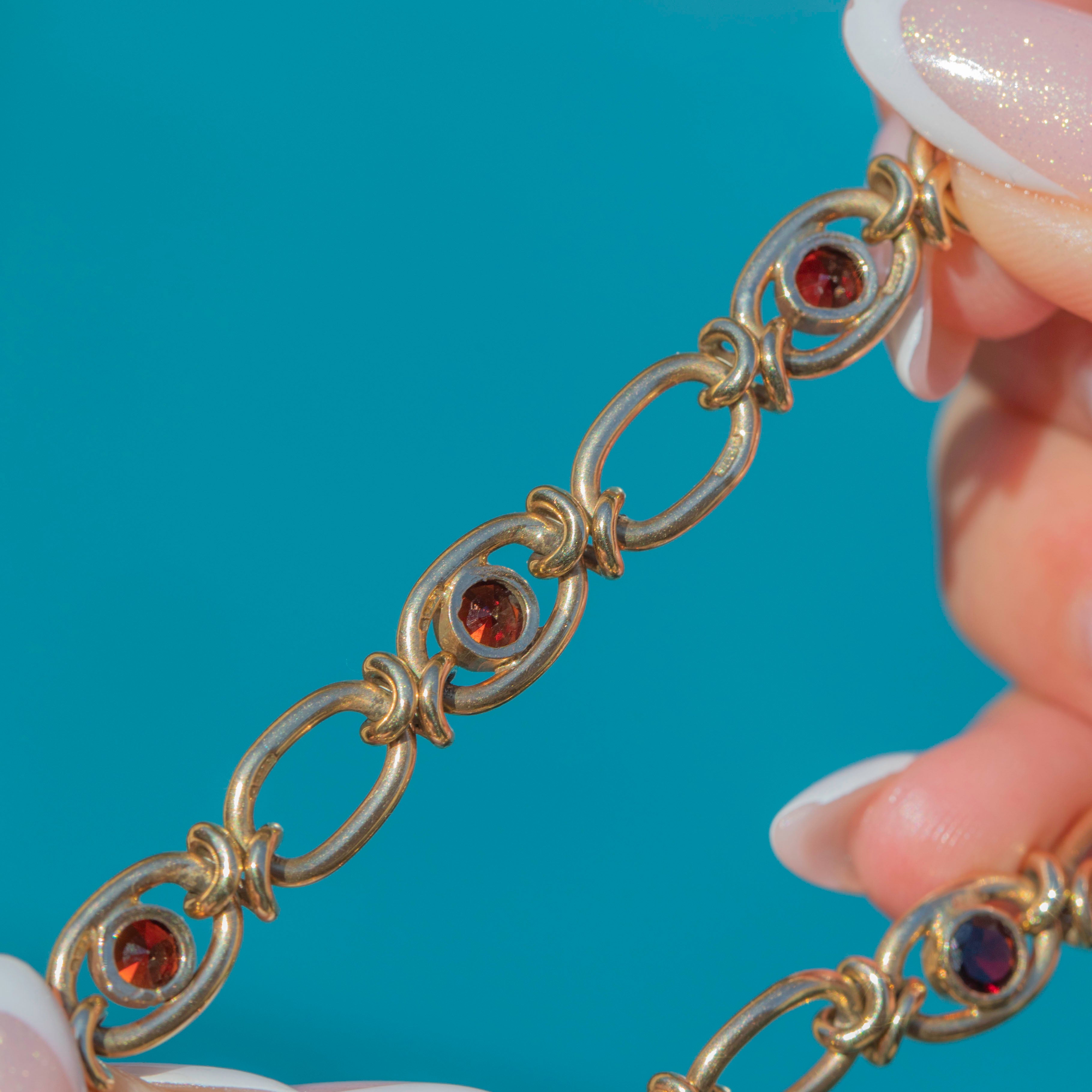 EXCELLENT: This 9ct Gold Garnet fancy link bracelet is in excellent condition. Each of her links is uniform and secure, and her Garnets are radiant with no chips or scuffs. With a safety chain for added security, this vintage Garnet bracelet can be worn with the utmost confidence!