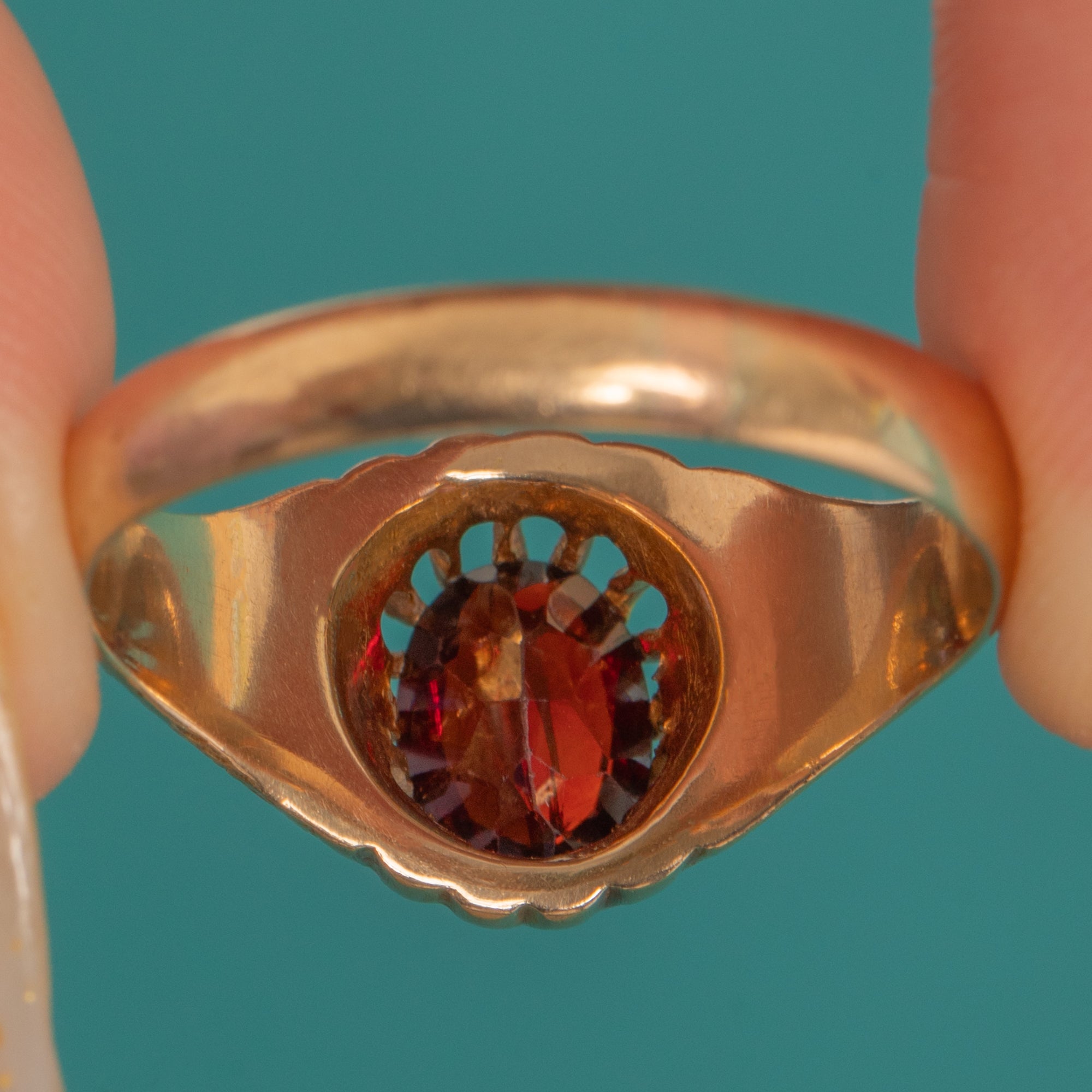 EXCELLENT: The Garnet is bright with only minor facet/rub wear visible under close inspection and no chips or cracks. The buttercup setting, engraved shoulders and shank are crisp with light surface wear to the high points; claws are secure and the ring is sturdy and in round. No evidence of resizing or repairs observed.
