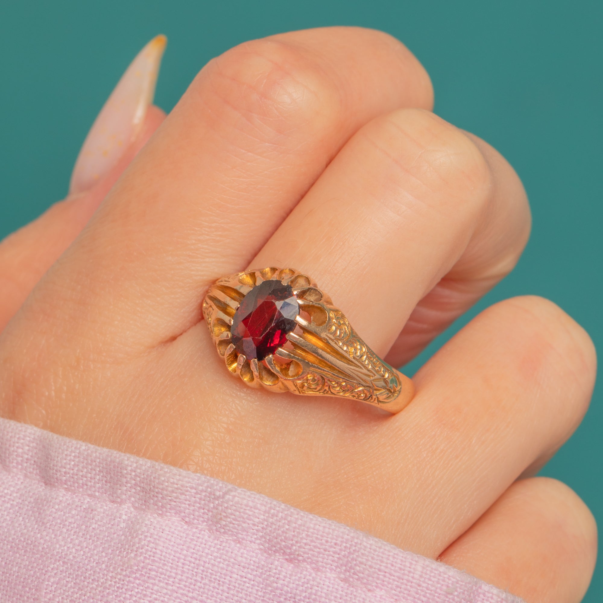 A romantic buttercup ring in warm 9ct Gold, set with a deep wine-red oval Garnet that glows beautifully against its scalloped floral setting. The shoulders are richly adorned with radiating flutes and foliate engraving, flowing into a solid tapering shank for an ornate yet wearable silhouette.