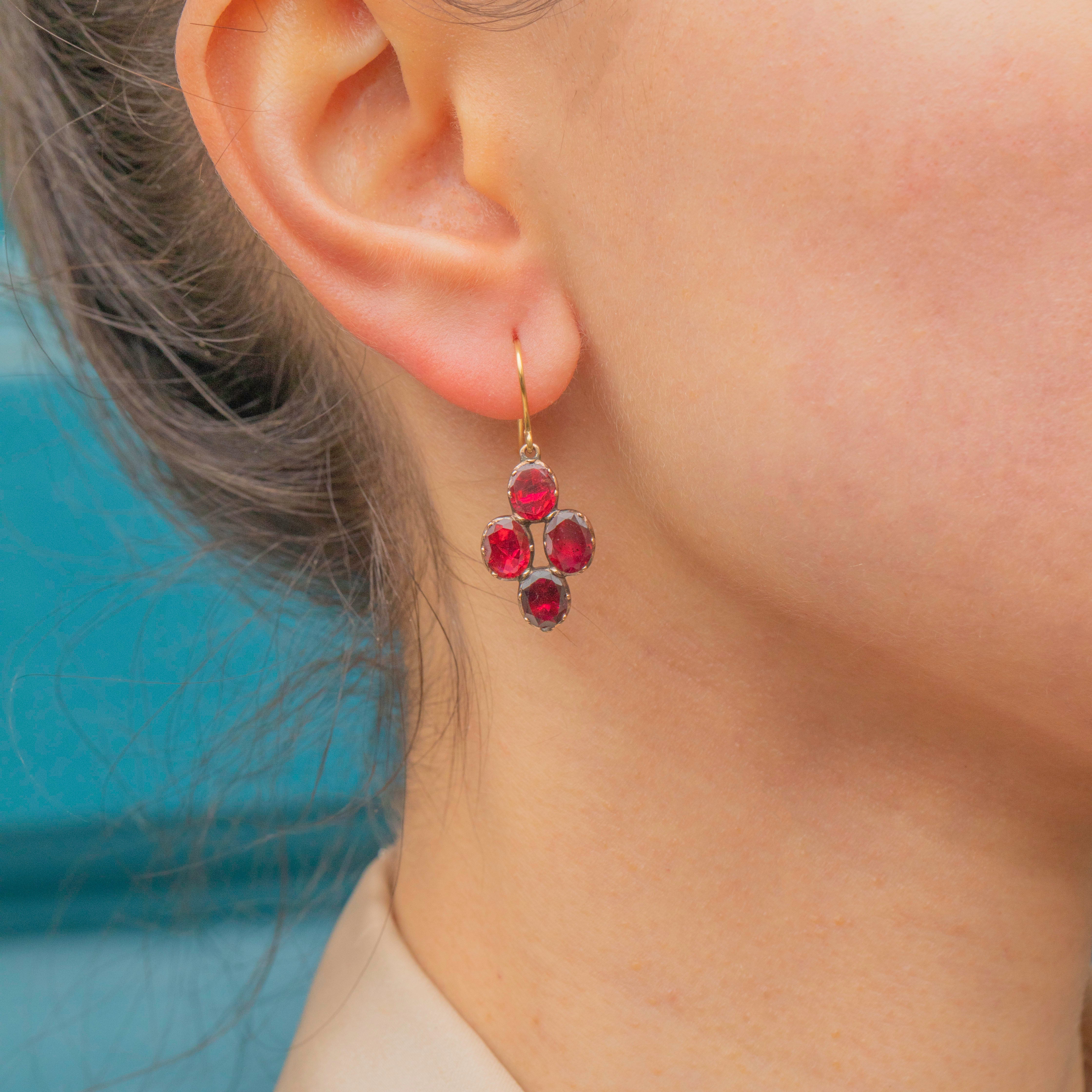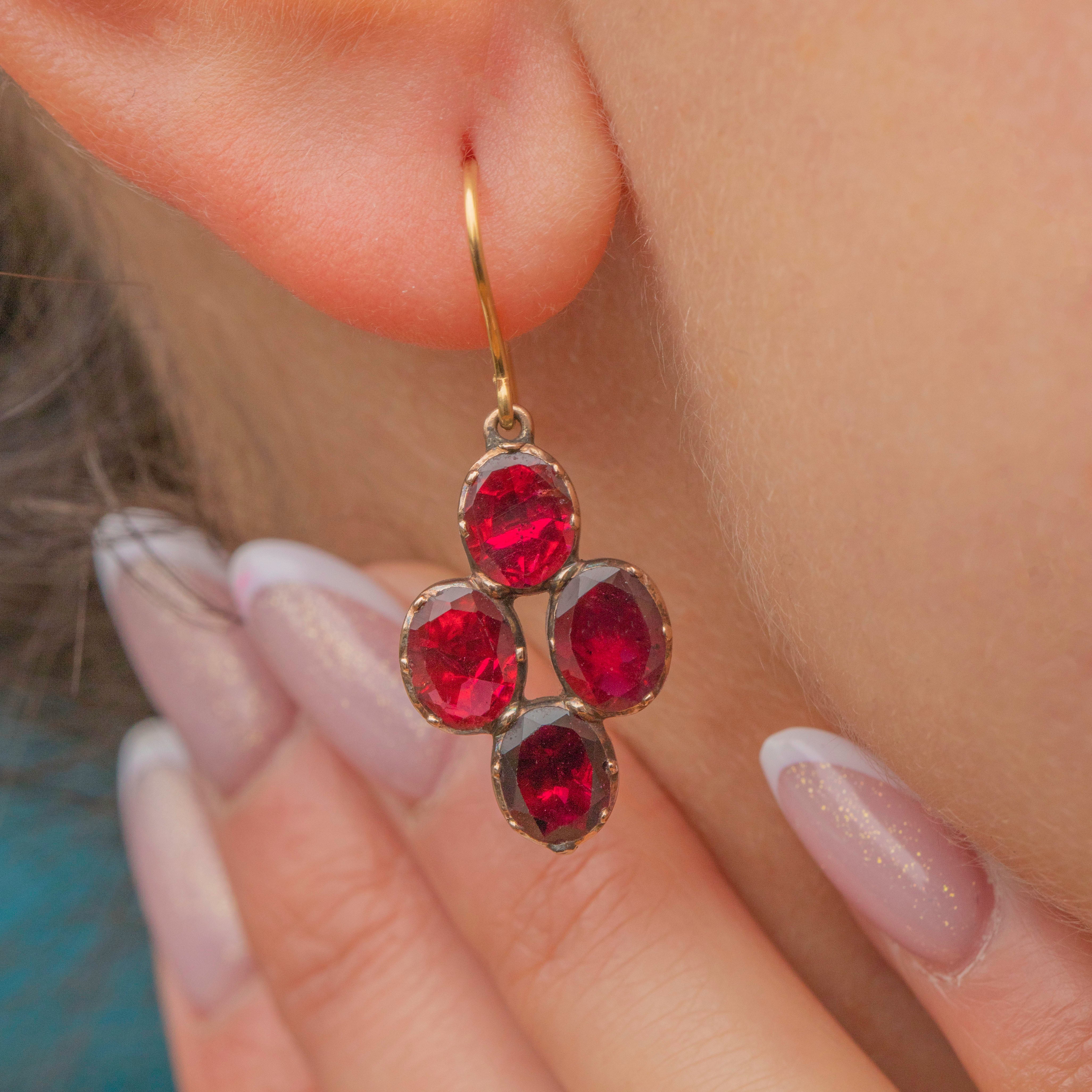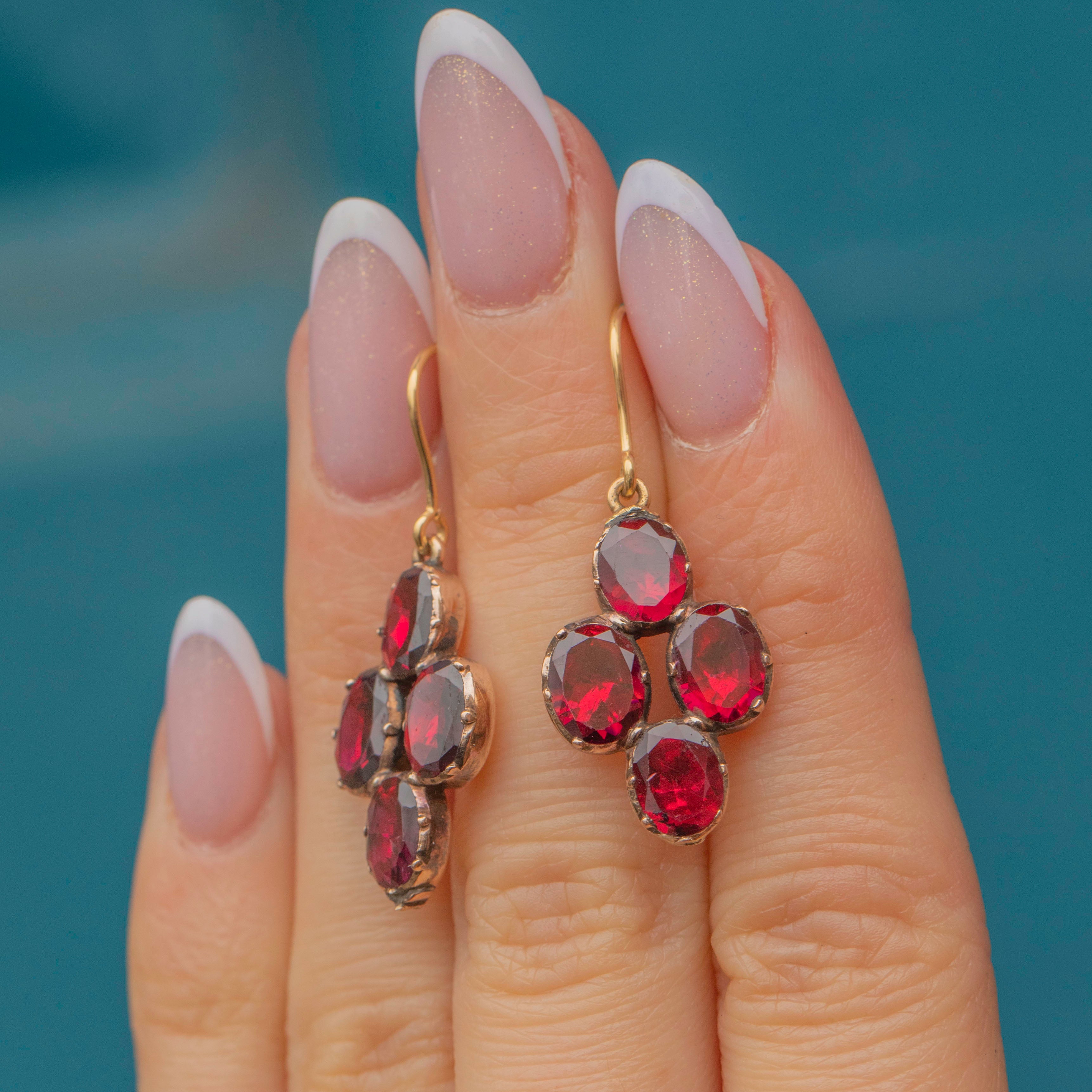 These Georgian 9ct Gold flat-cut Garnet drop earrings are an elegant pair! Rich with sparkly scarlet tones, these earrings will complete your outfit.