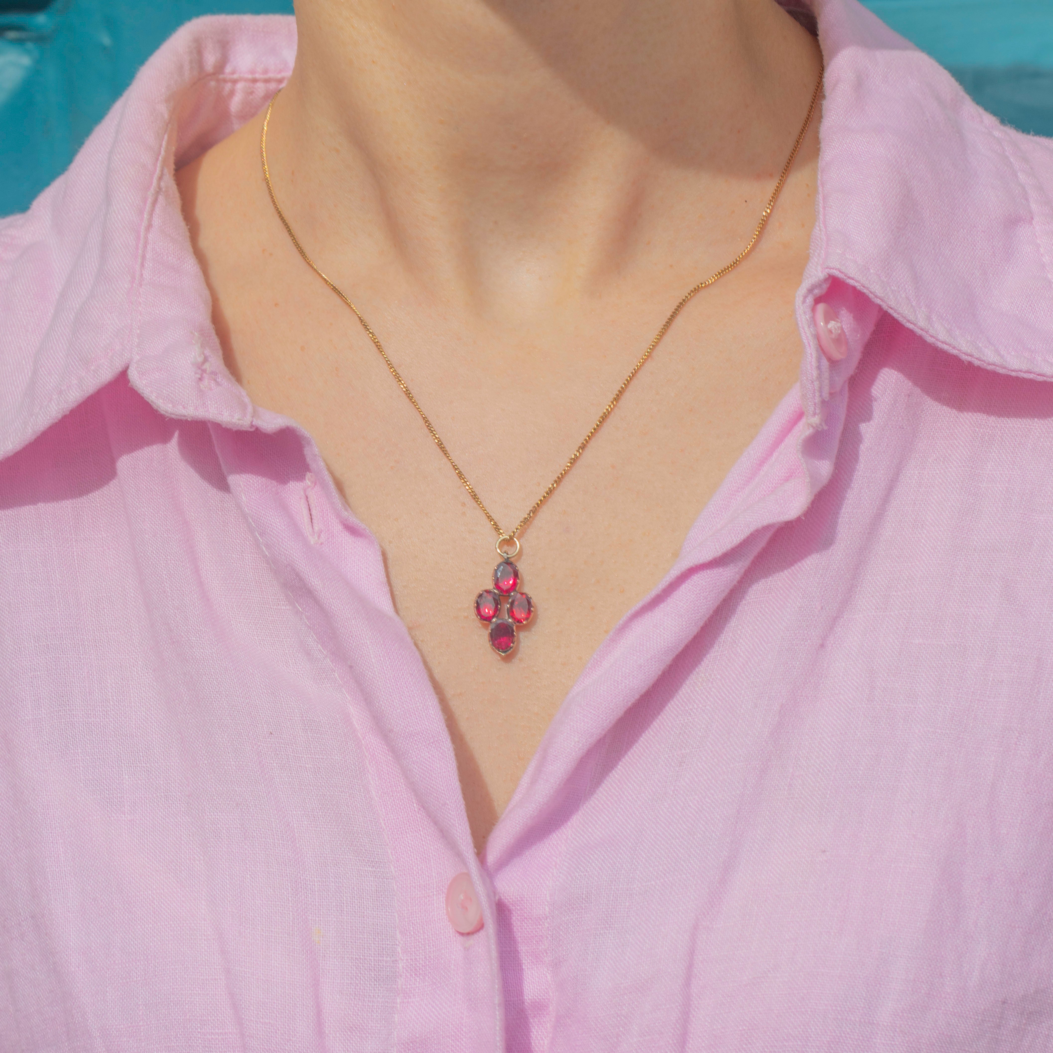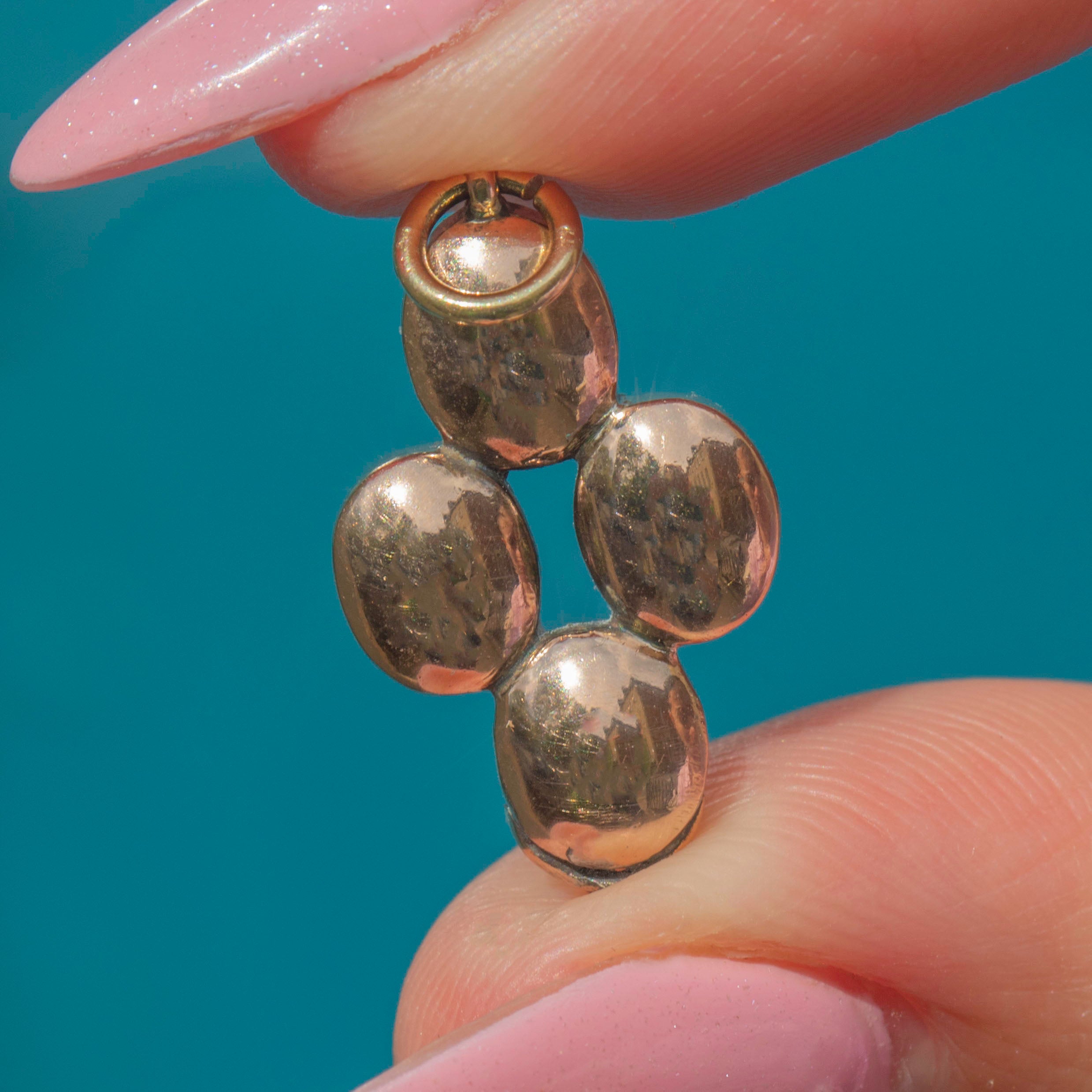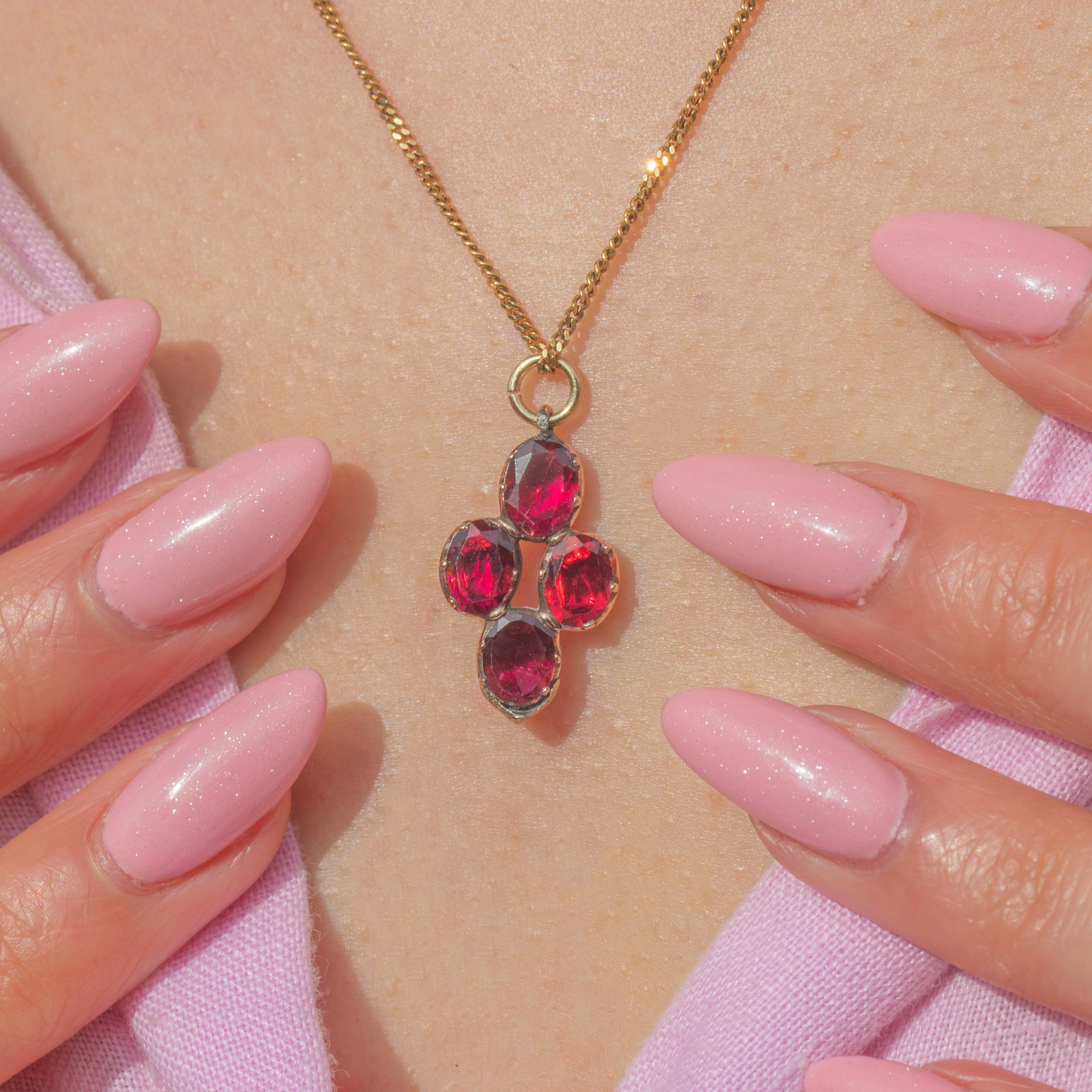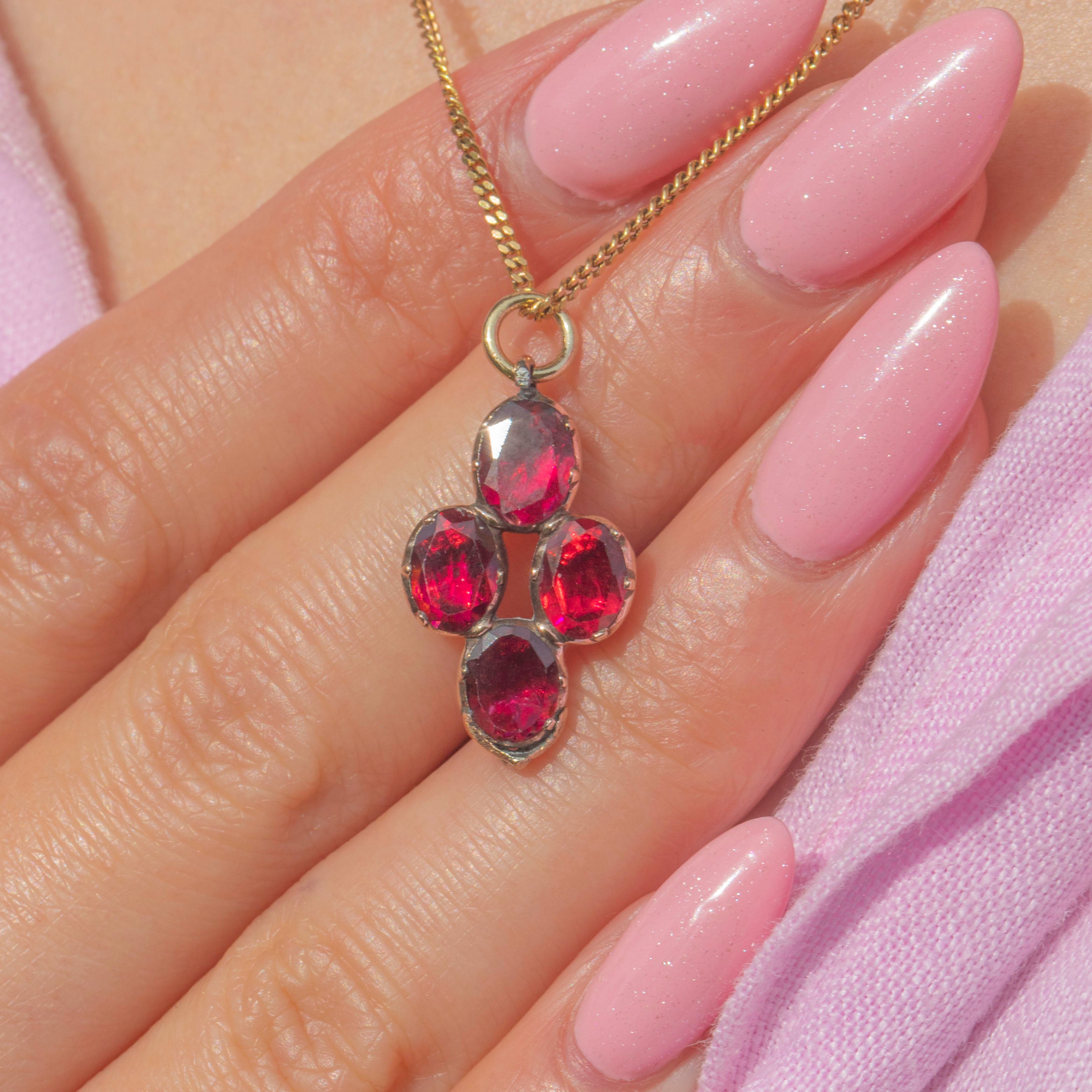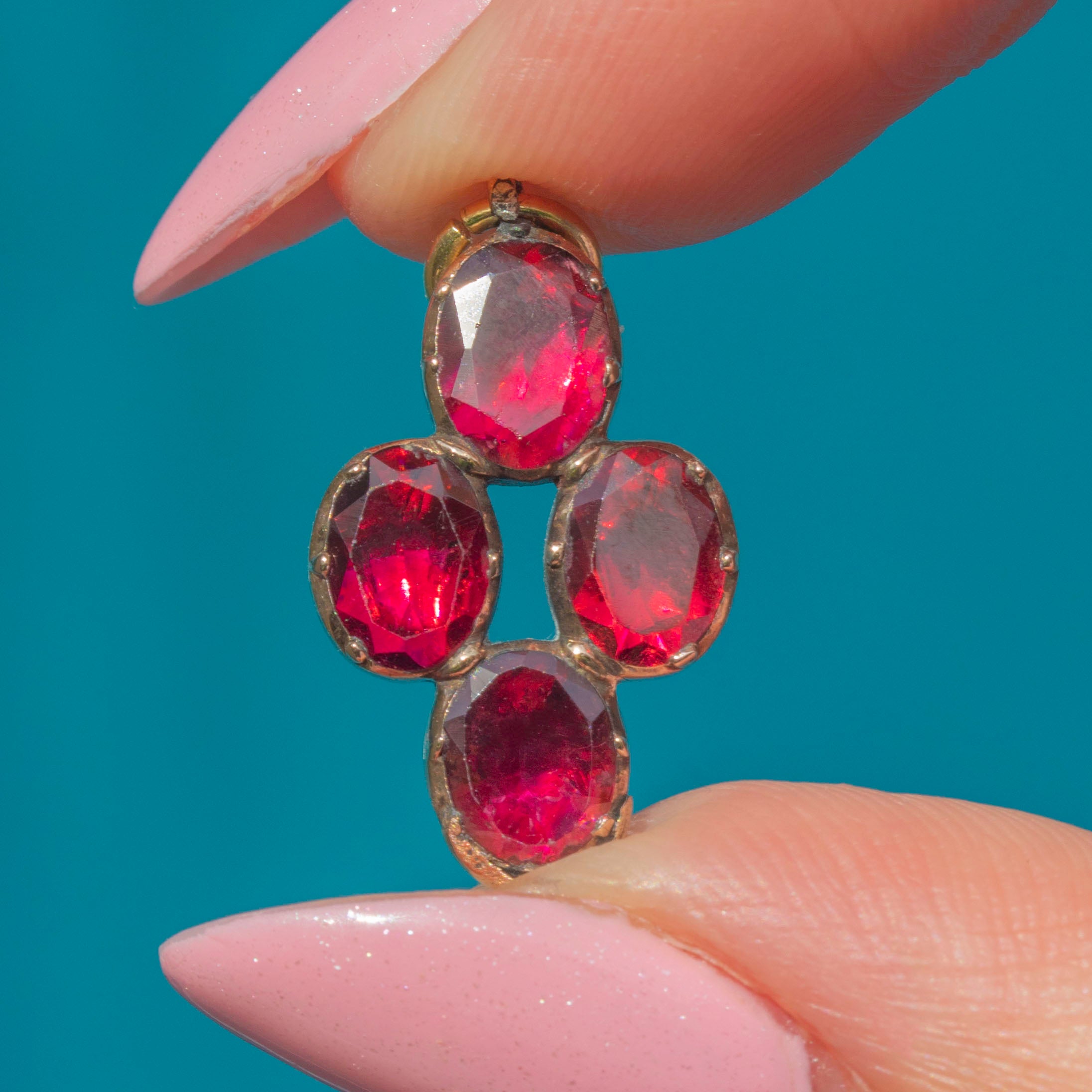 A beautiful 9ct Gold Georgian Garnet charm full of crimson hues and fire! Showcasing four Georgian flat-cut Garnets arranged in a simple quartet formation, she simply glows with fire from within!