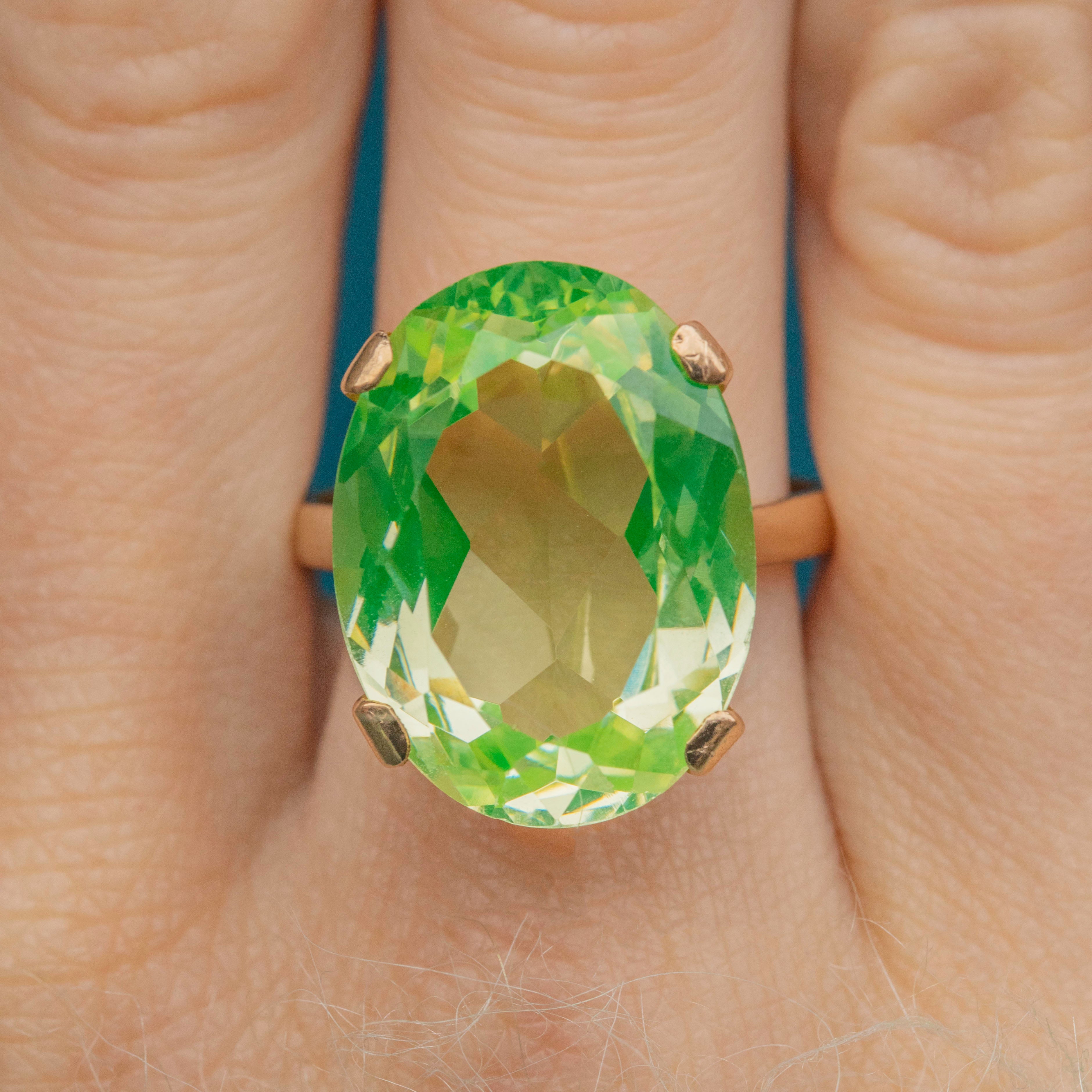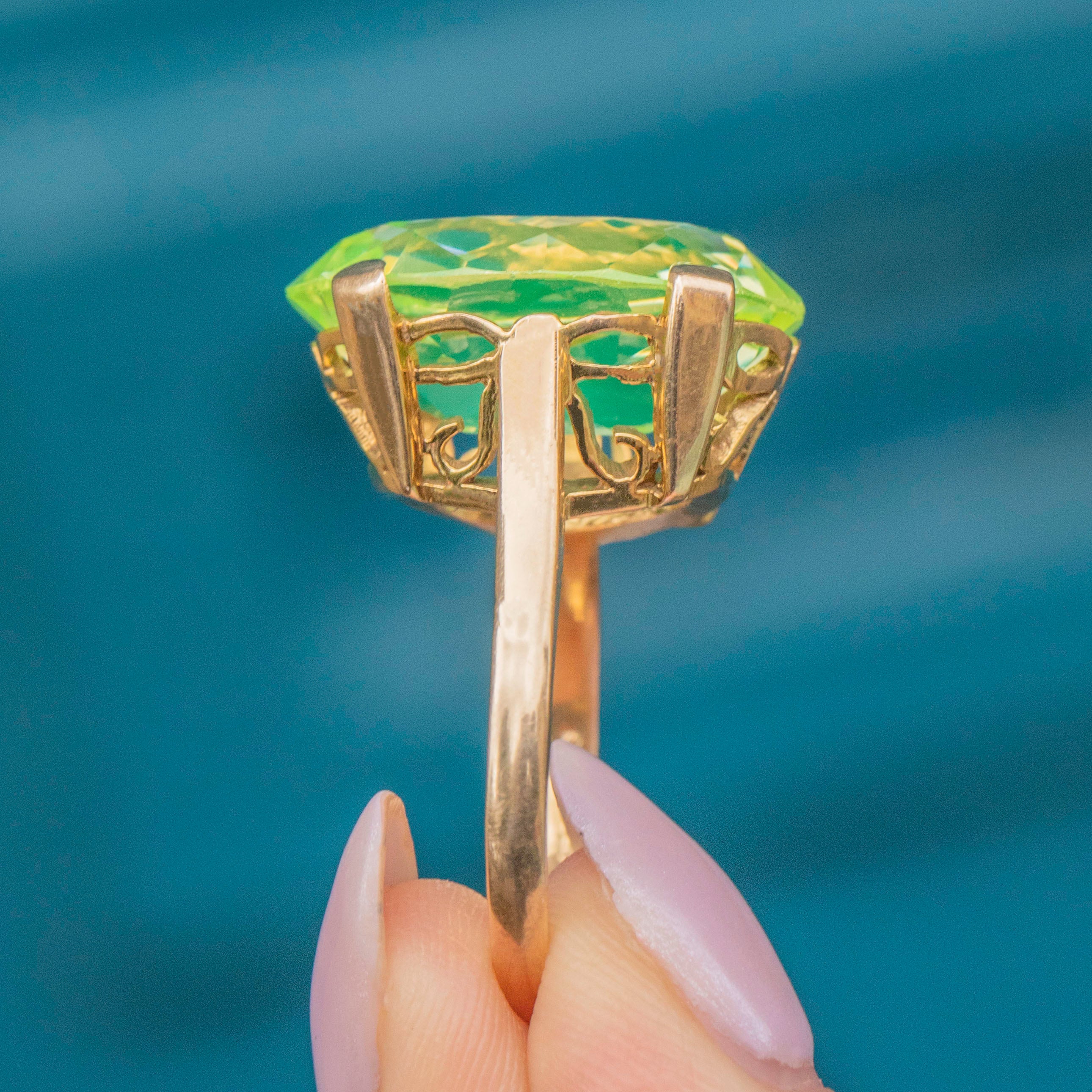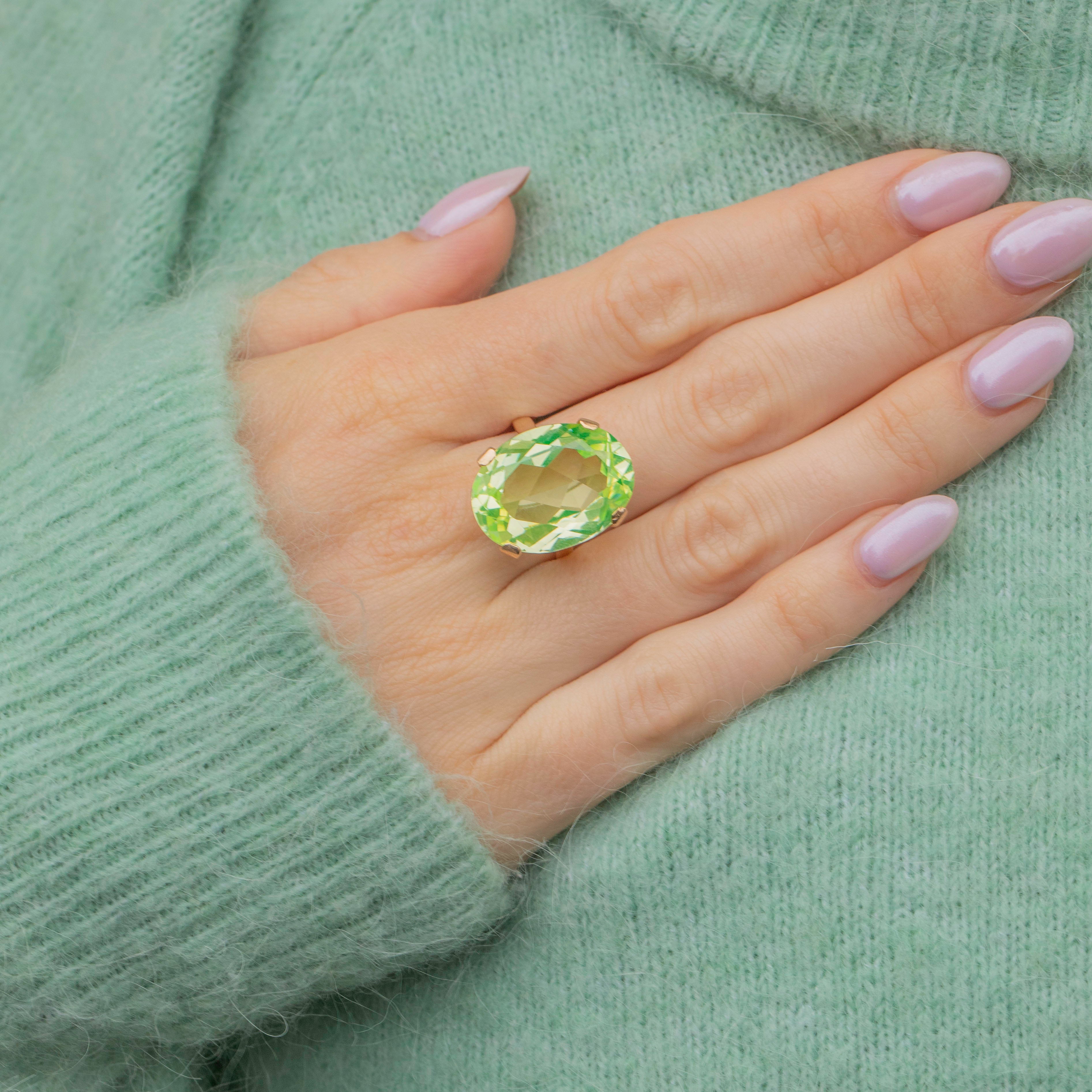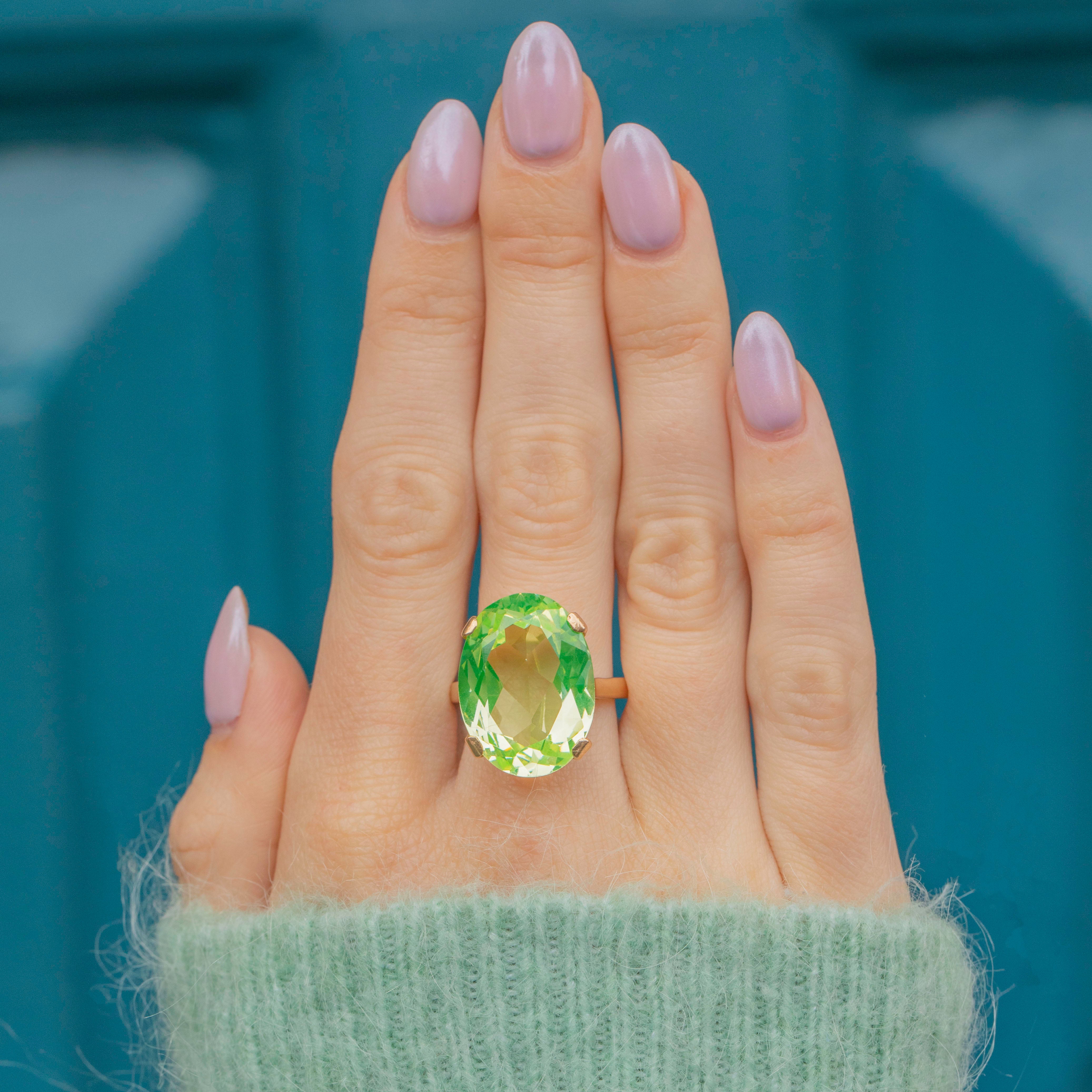 Bring some zest into your jewellery collection with this 9ct Gold green Spinel oval cocktail ring! A whopping 18.15ct Spinel, flaunting refreshing lime green hues, provides excellent finger coverage, and elevated 10.5mm above your finger, this Vintage Gold ring is the ultimate statement piece.