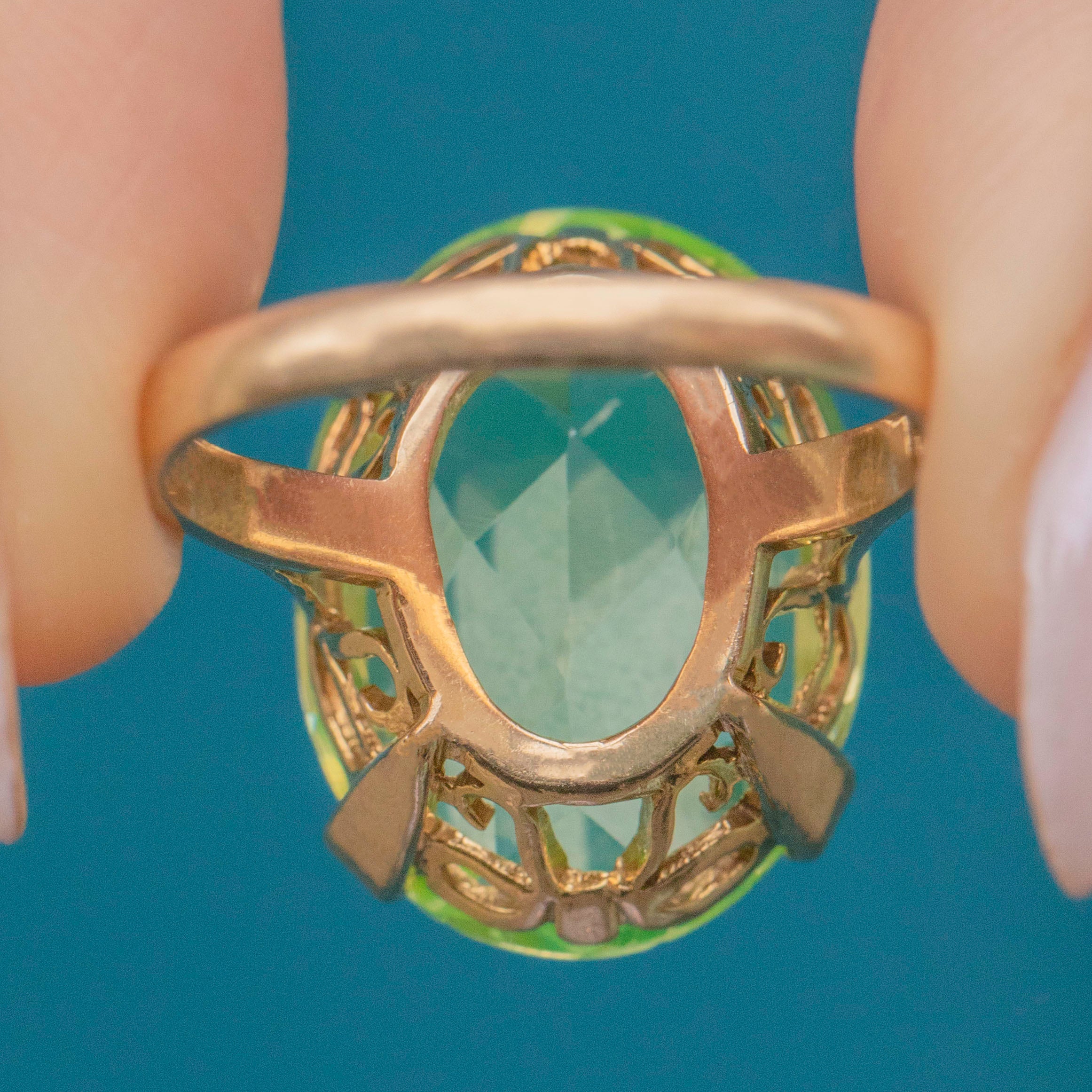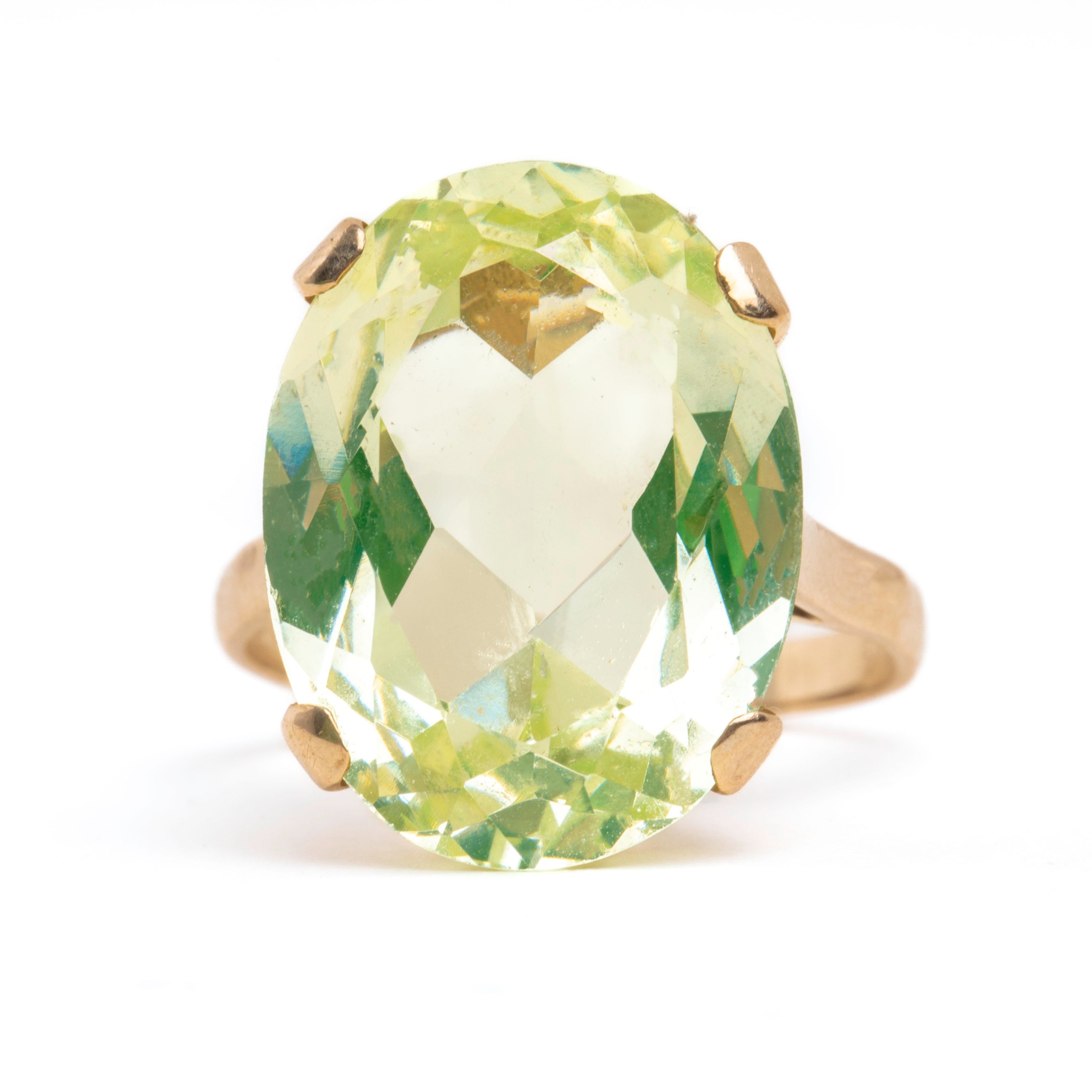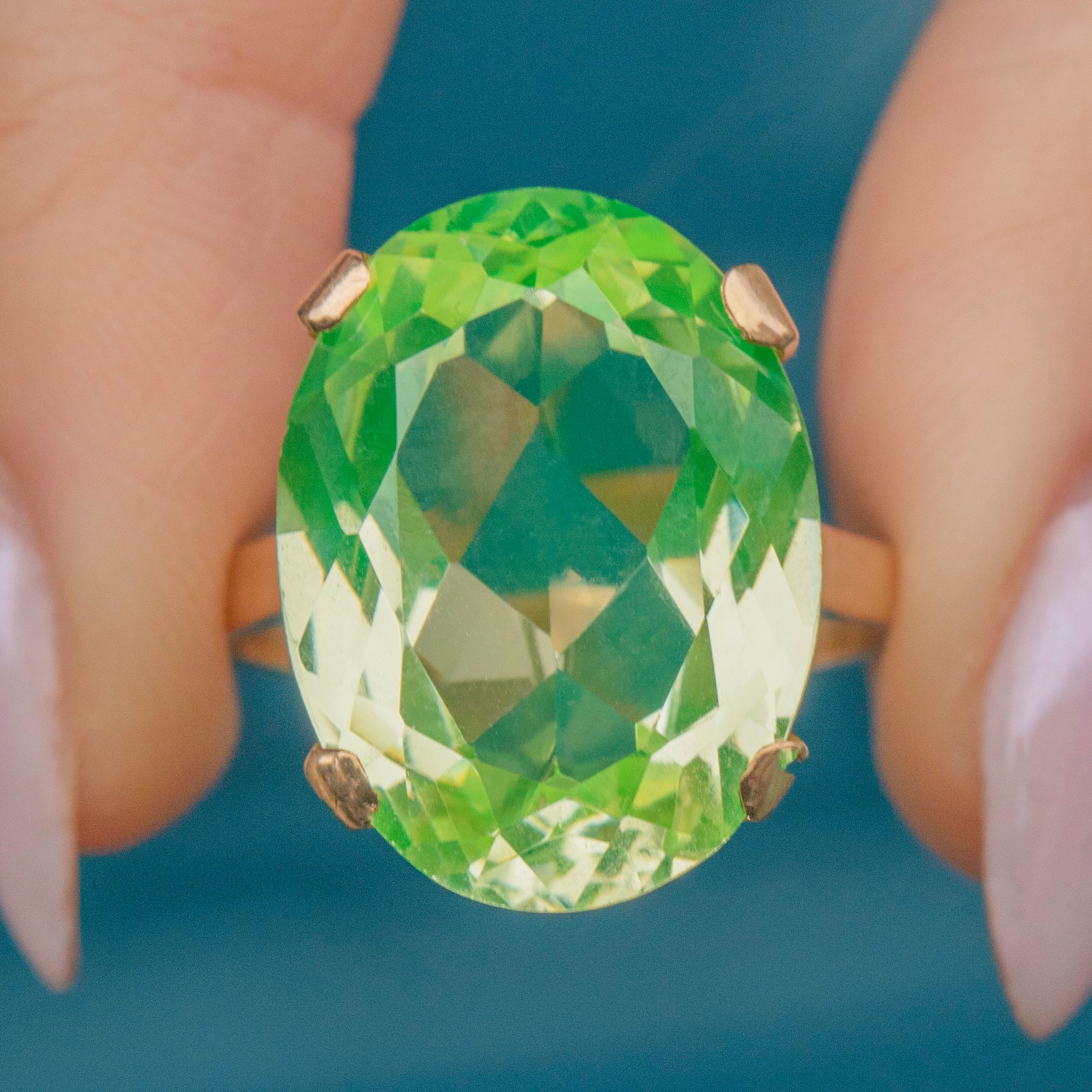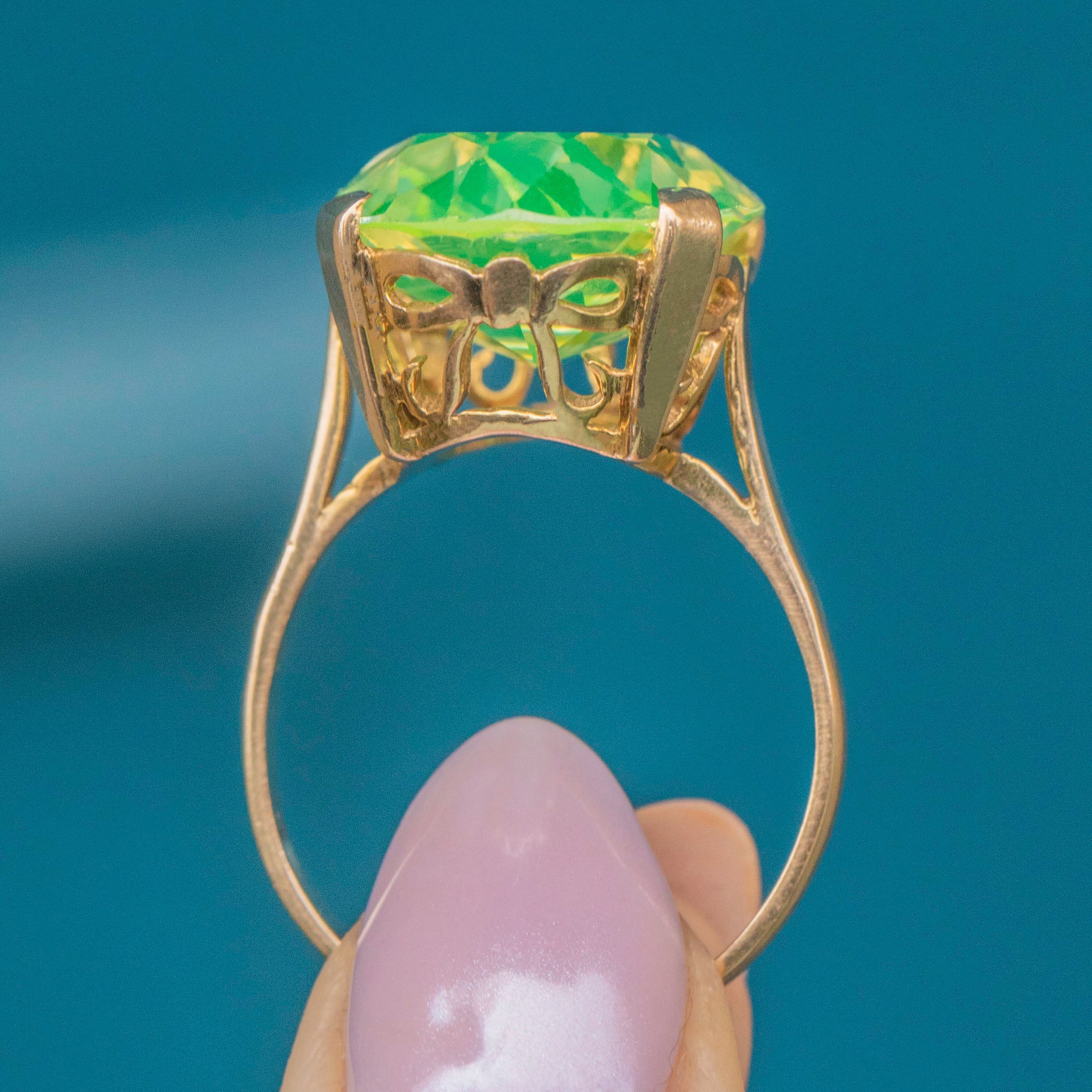 Bring some zest into your jewellery collection with this 9ct Gold green Spinel oval cocktail ring! A whopping 18.15ct Spinel, flaunting refreshing lime green hues, provides excellent finger coverage, and elevated 10.5mm above your finger, this Vintage Gold ring is the ultimate statement piece.