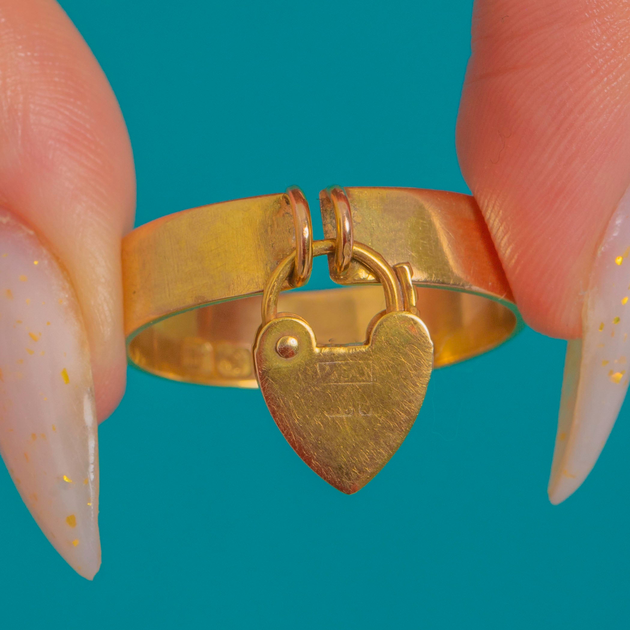 Sweet, symbolic and wonderfully wearable, this 9ct Gold heart padlock ring captures the language of love in a sleek, everyday silhouette. The polished flat band is adorned with a dainty articulated heart, detailed with a tiny keyhole and neat rivet motifs for that authentic love‑token charm.