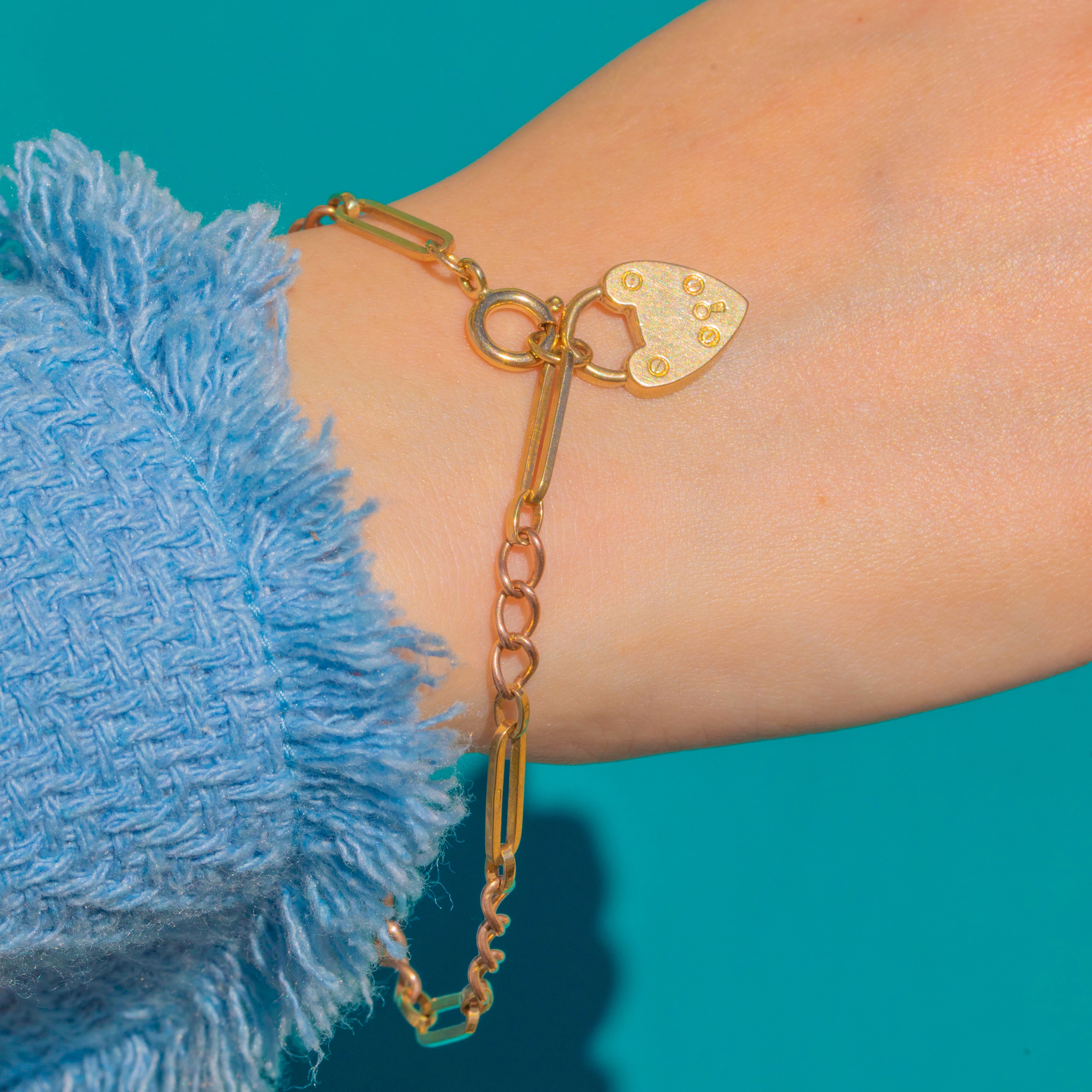 EXZELLENT: Dieses Herz-Vorhängeschloss-Armband aus 9ct Gold befindet sich in exzellentem Zustand. Die Kettenglieder haben ihre Form bewahrt, jedes sicher befestigt mit warmem Goldton; das Vorhängeschloss zeigt nur minimale Gebrauchsspuren und ist frei von Dellen. Die Verschlusskomponenten funktionieren einwandfrei und sorgen für einen sicheren, angenehmen Sitz.