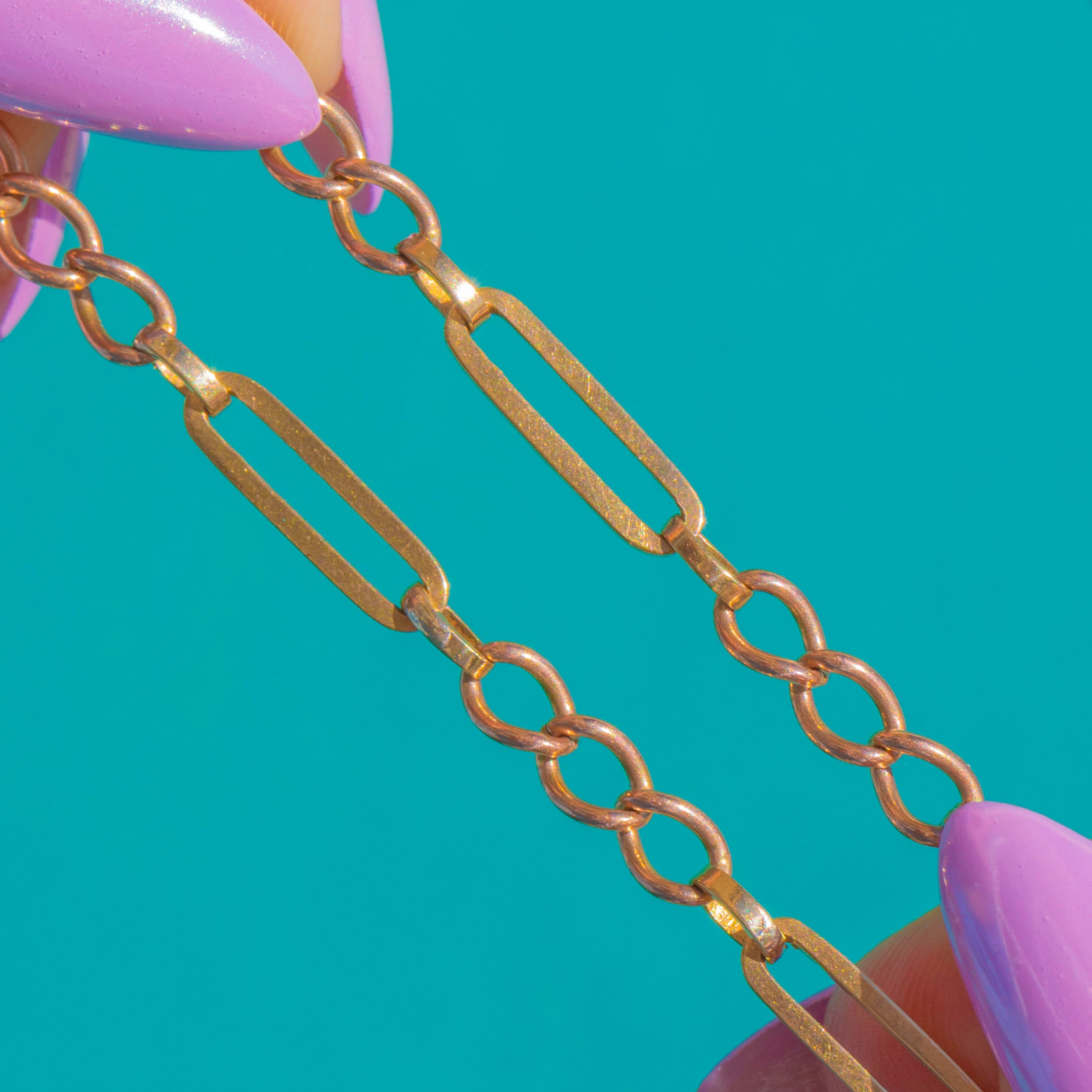 Ein klassisches Herz-Vorhängeschloss trifft auf elegante Trombone-Glieder in diesem Vintage-Armband aus 9ct Gold, um 1963. Die abwechselnd länglichen Glieder und kleineren Verbindungsstücke schaffen einen architektonischen, eleganten Rhythmus, während das zierliche Vorhängeschloss – komplett mit Schlüsselloch und vier erhabenen Nieten – einen Hauch von Mid-Century-Romantik verleiht.
