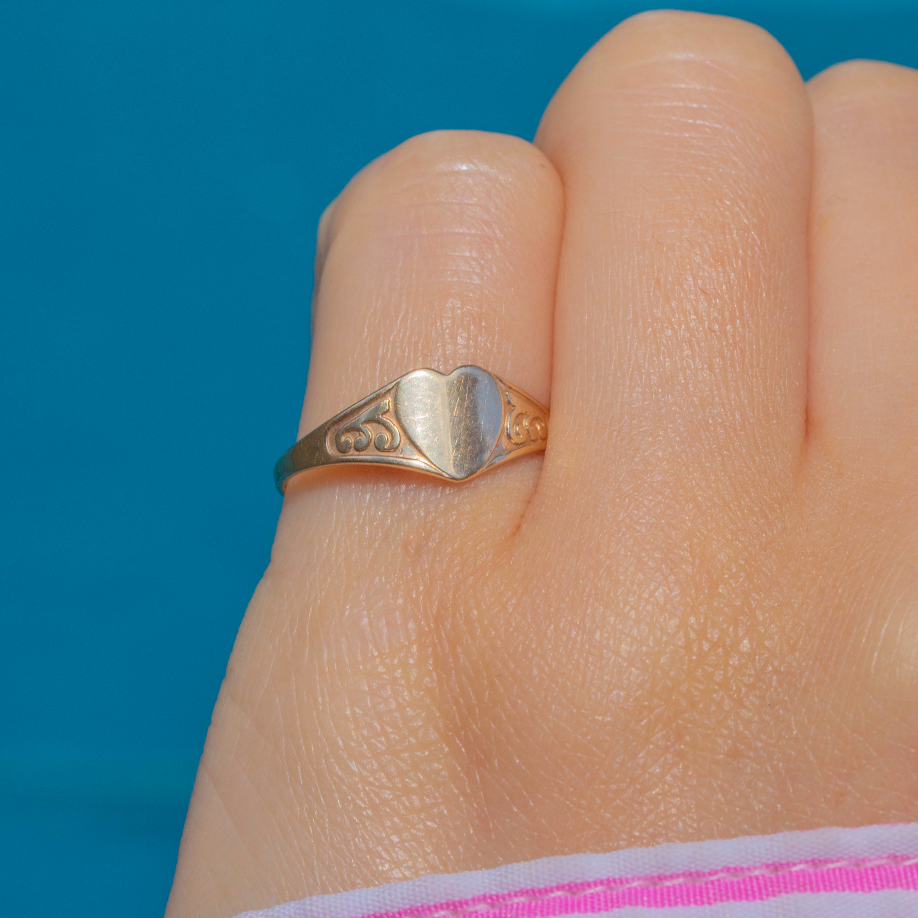 This adorable vintage heart signet ring is a dainty delight! With a sweet heart centre decorated with engraved details, this glossy slab of Gold is a unique signet ring perfect for everyday wear.