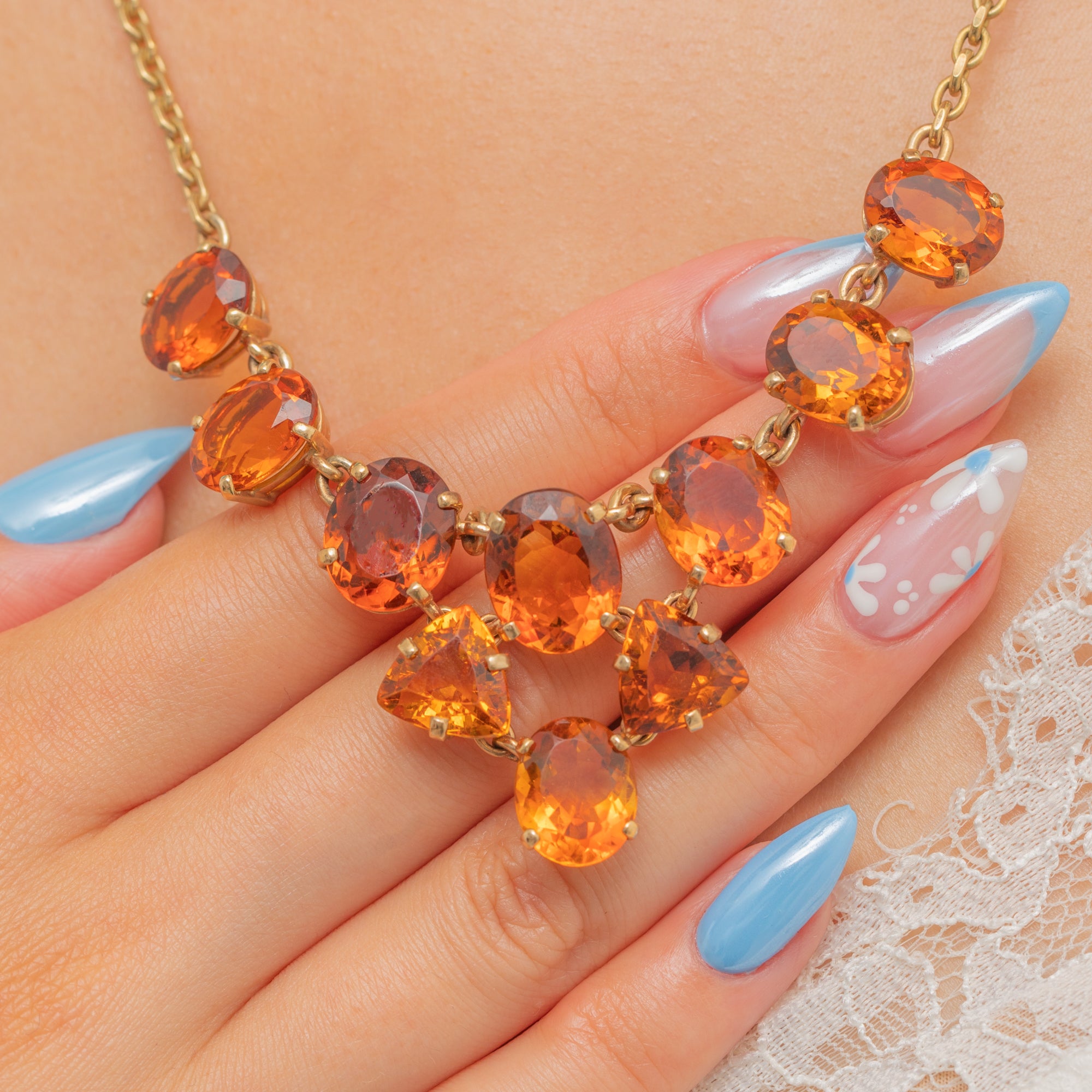 Crafted from glossy 9ct Gold, this stunning vintage necklace flaunts ten plump Madeira Citrines, faceted beautifully and boasting 27.20 carats combined. Madeira Citrines are distinguishable by their vibrant, fiery hues, and these saturated gemstones are no exception, with each one boasting a deep caramel hue.