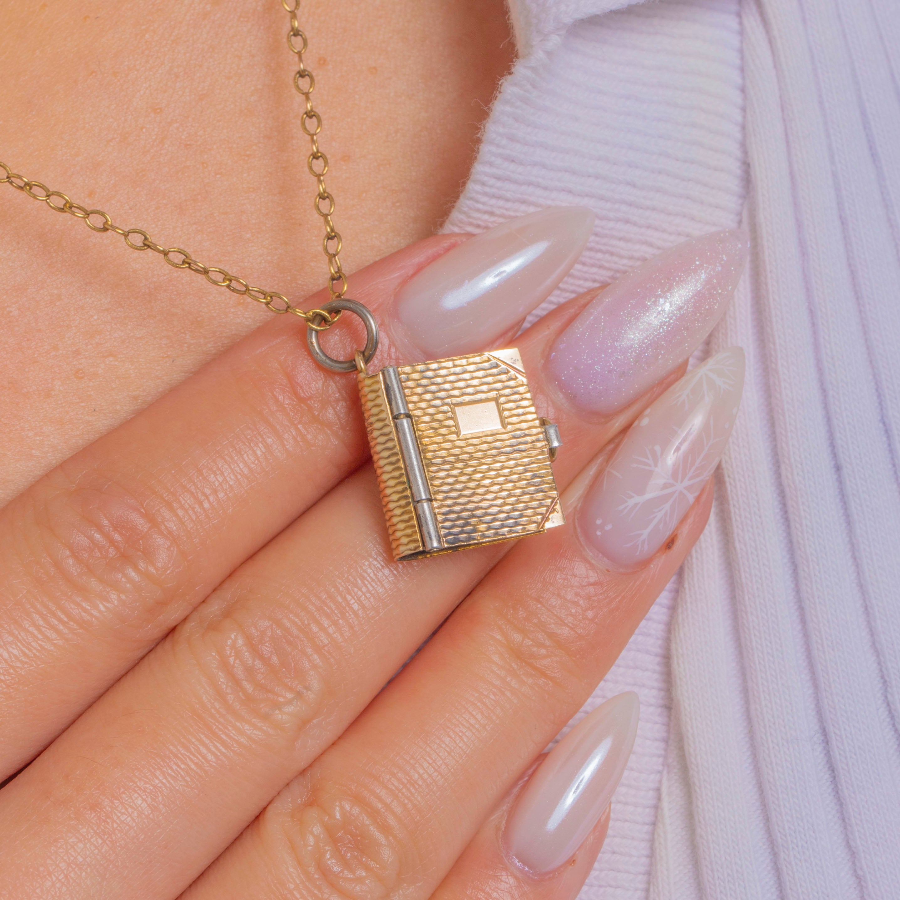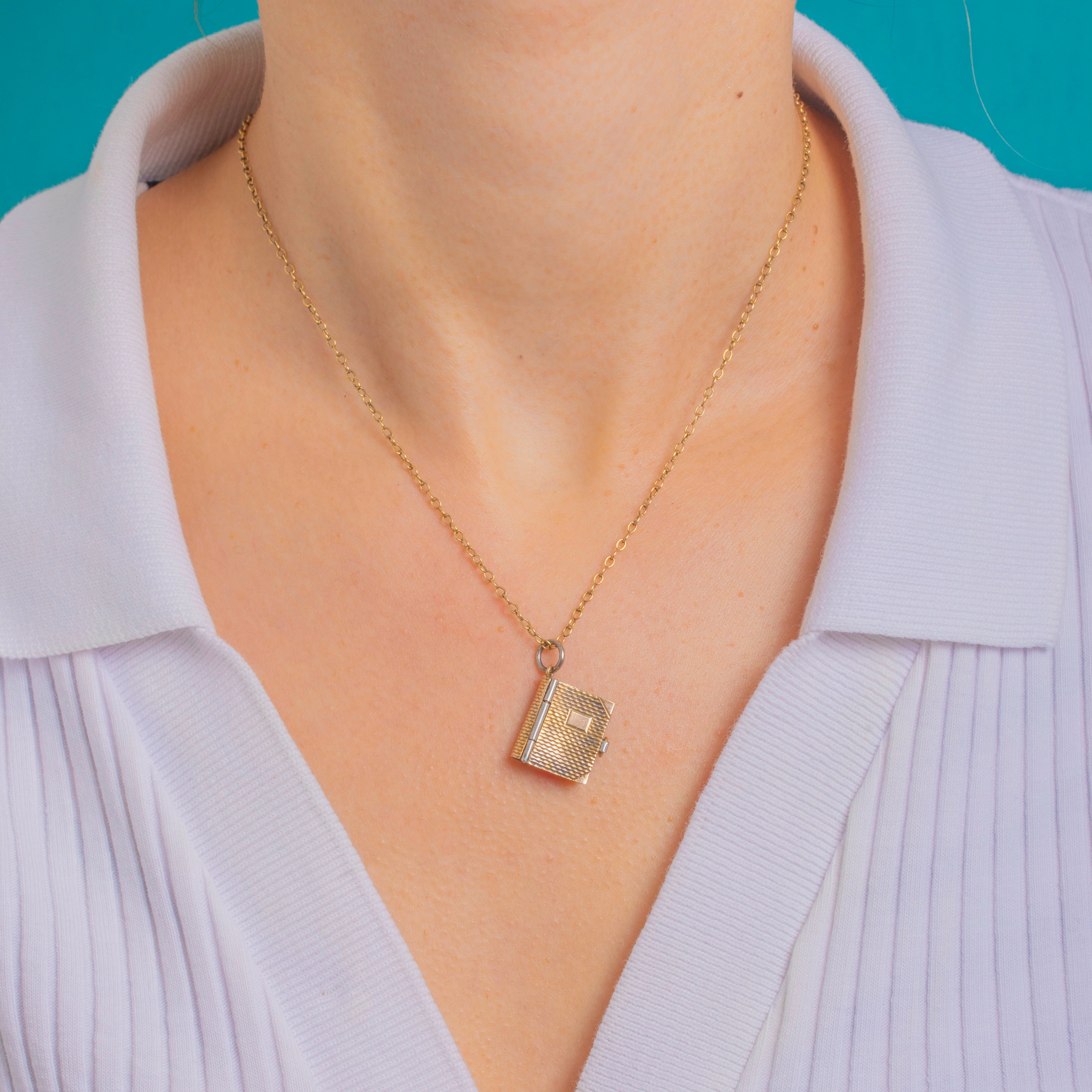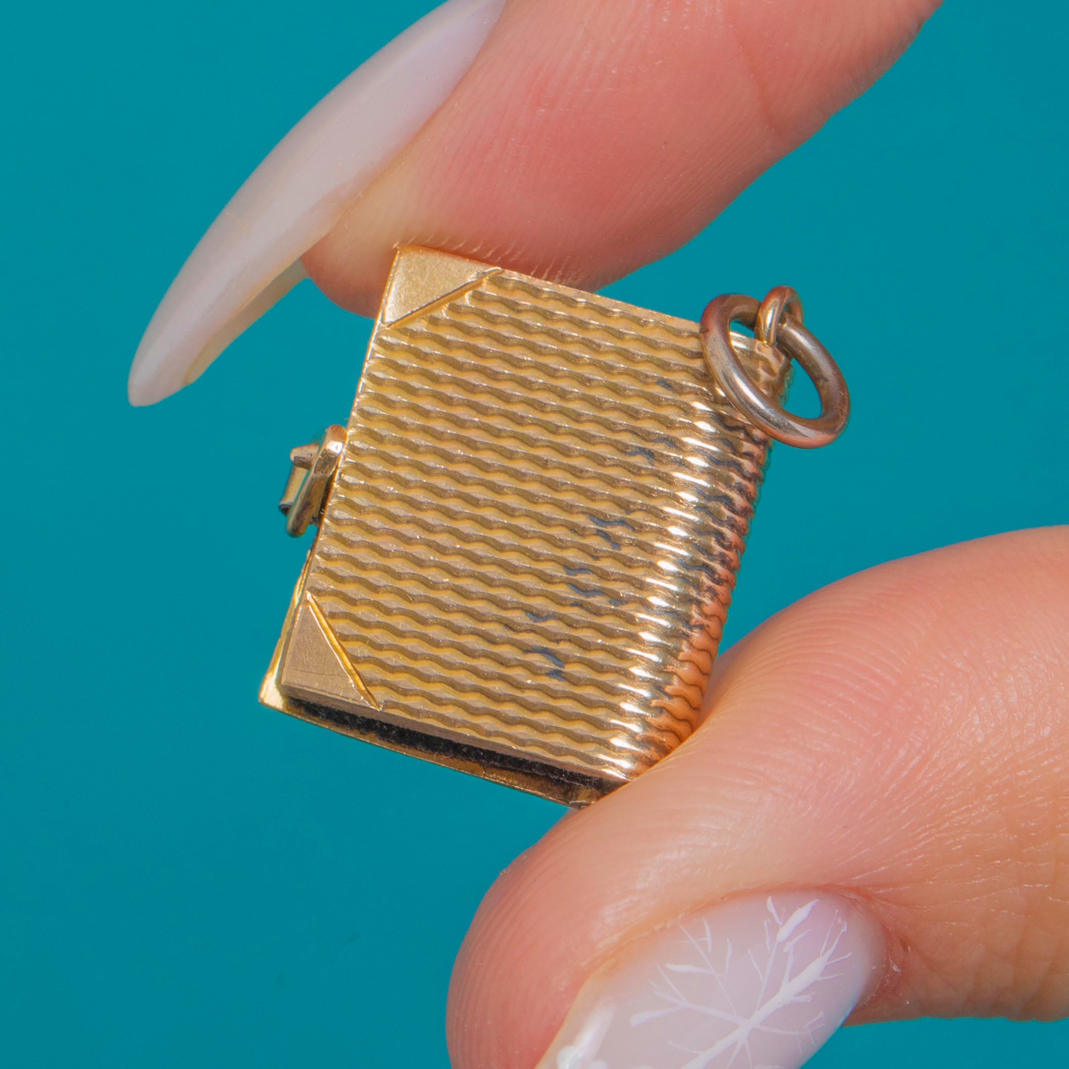 A delightful Victorian 9ct Gold book charm, its petite covers finished with crisp engine-turned detailing and an applied rectangular cartouche for a refined, tailored look. Chamfered corner strap accents frame the design, with a neat side thumb tab that completes the miniature “diary” silhouette with elegant precision.