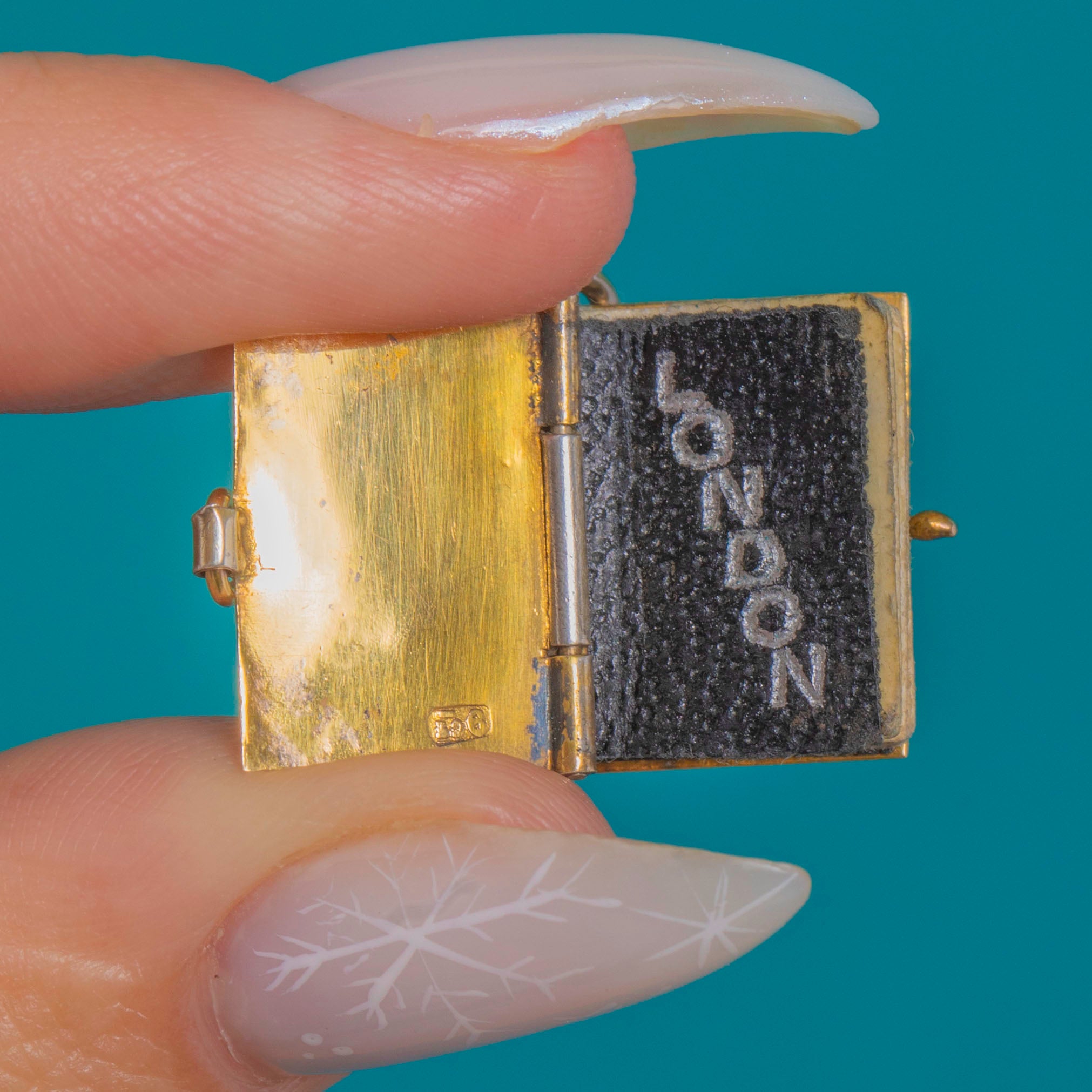 Open it to reveal a charming souvenir interior: a monochrome “HOUSES OF PARLIAMENT” view opposite a raised “LONDON” insert. Whimsical yet beautifully made, this tiny treasure is a sweet ode to the Grand Tour and the romance of London—perfect to add character to your favourite fine chain or charm bracelet.
