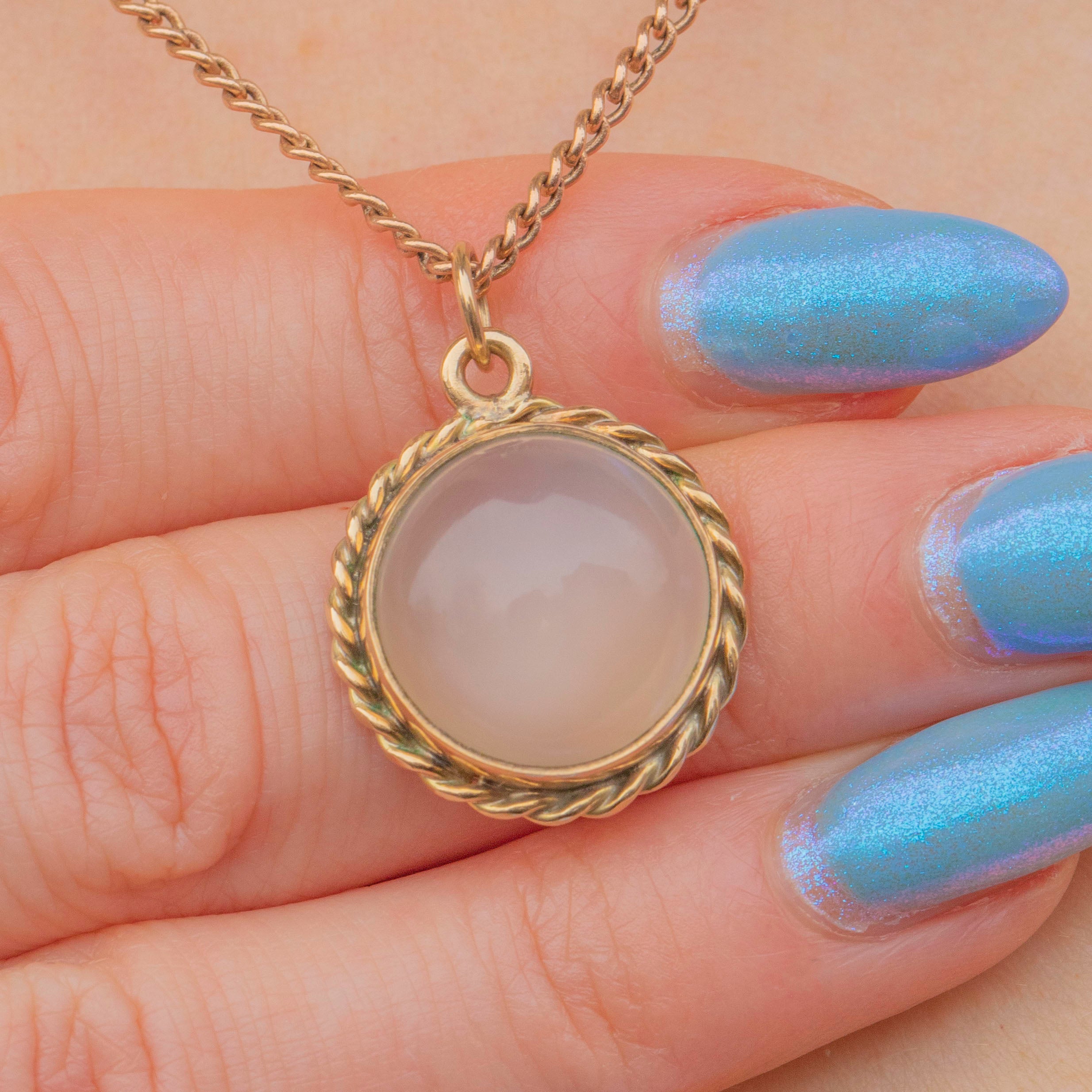 The cabochon cut of the stone offers a smooth and polished finish and is accentuated by the neat rope border providing a decorative finish. This vintage Moonstone pendant is the perfect size for everyday wear and will instantly elevate your outfit!