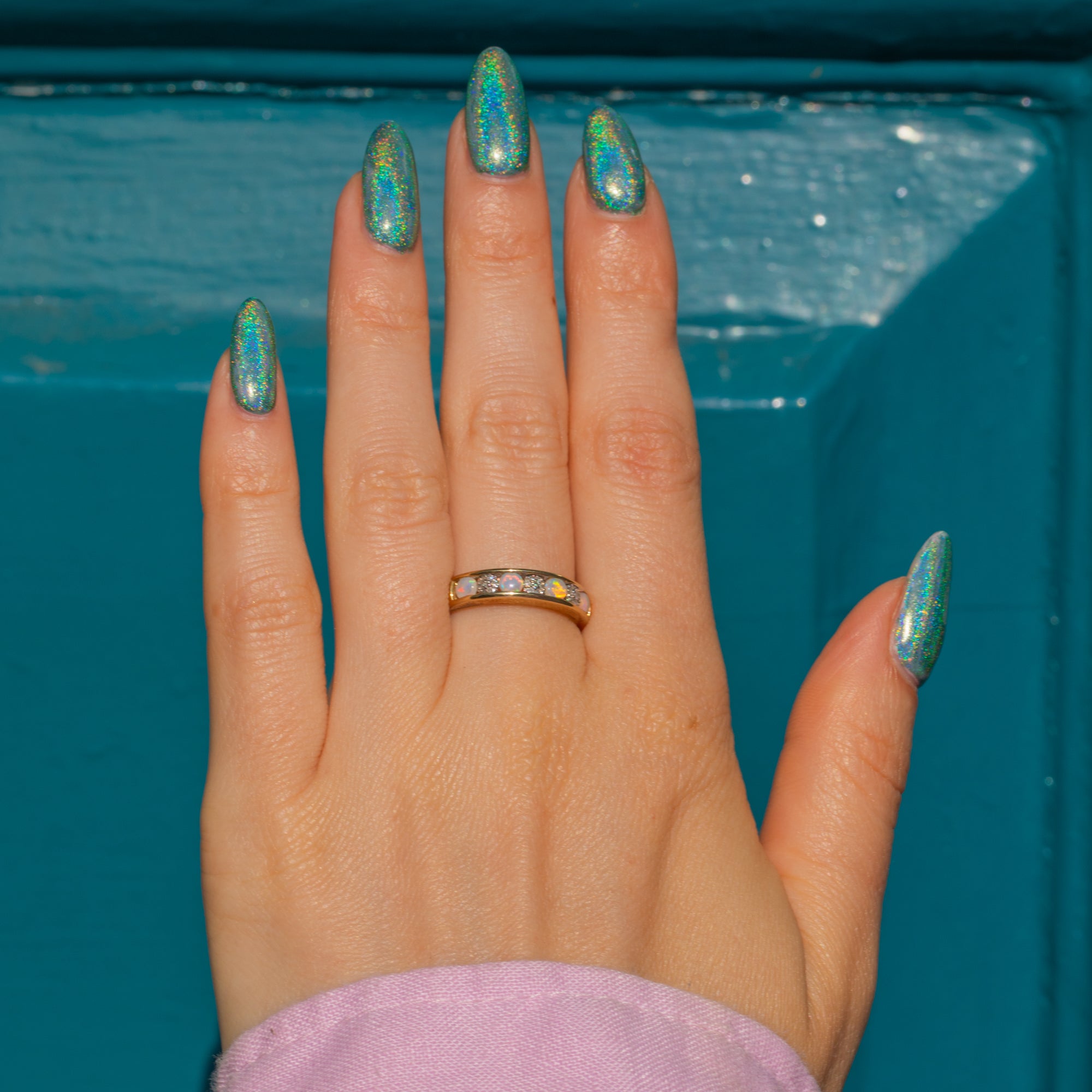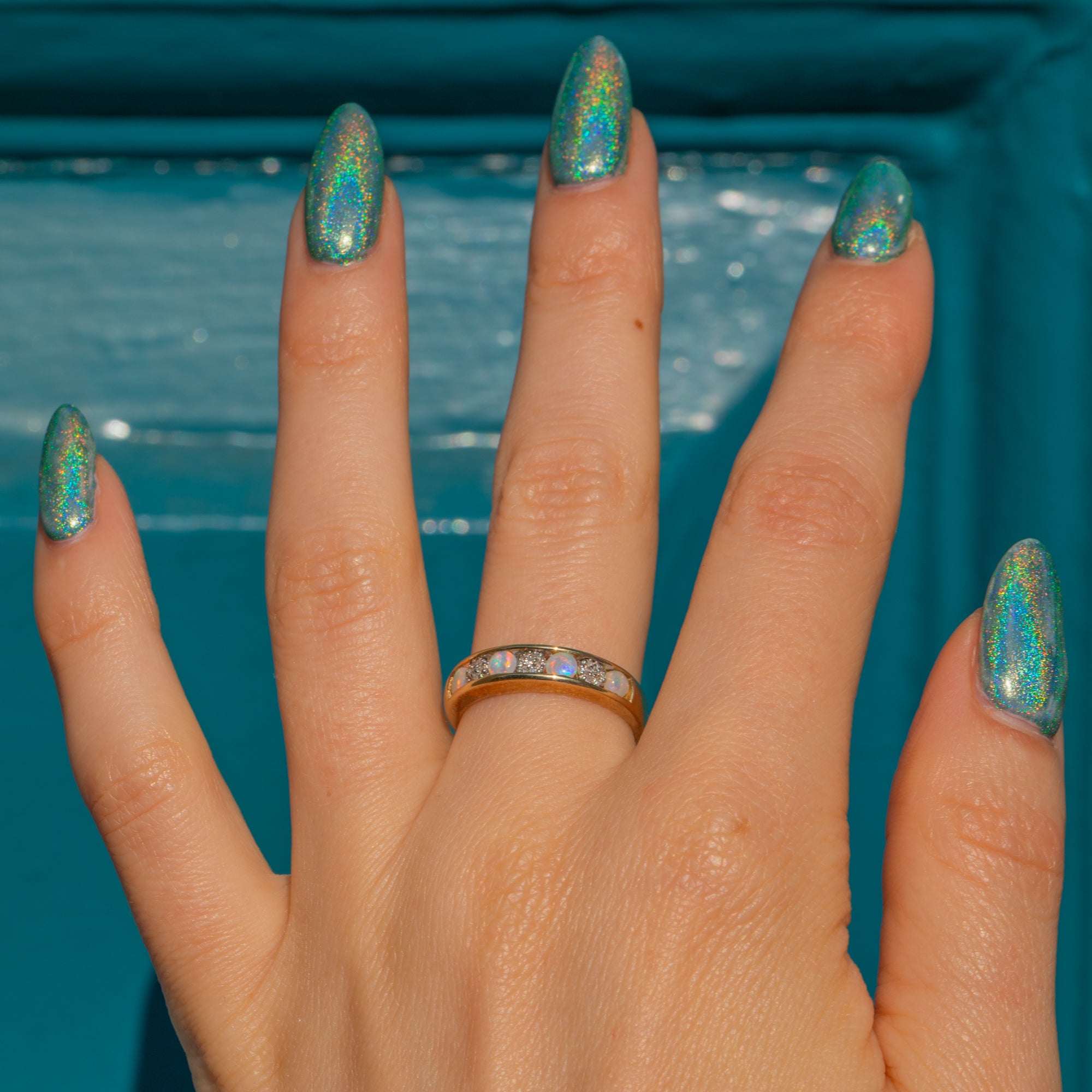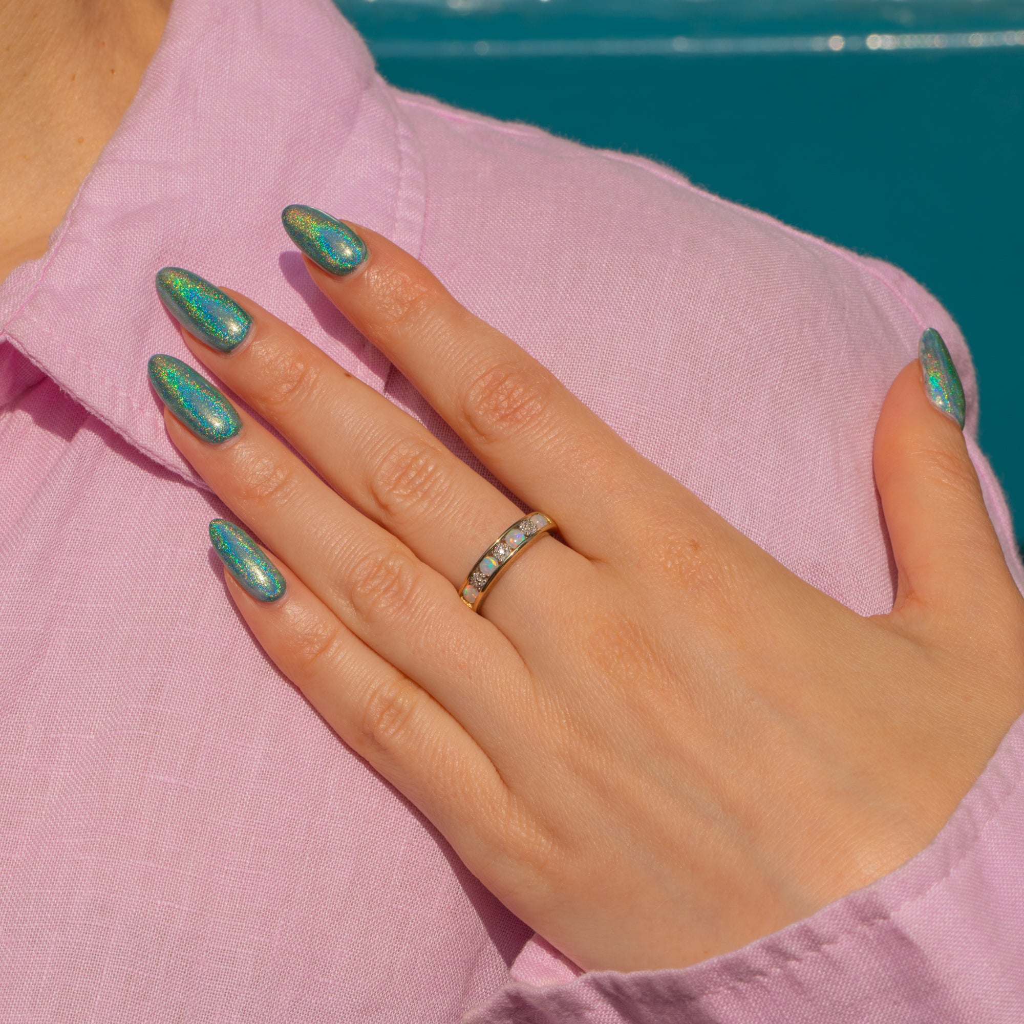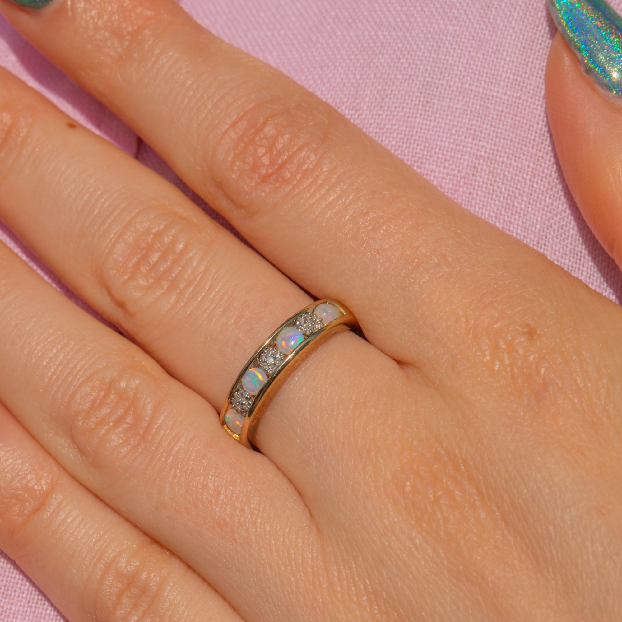 Channel set into buttery 9ct Gold, this Opal Diamond ring is sleek in design and chic in style. Eternity rings are renowned for symbolising never-ending love between two people, so what better way to showcase your love than with this Vintage half eternity ring.
