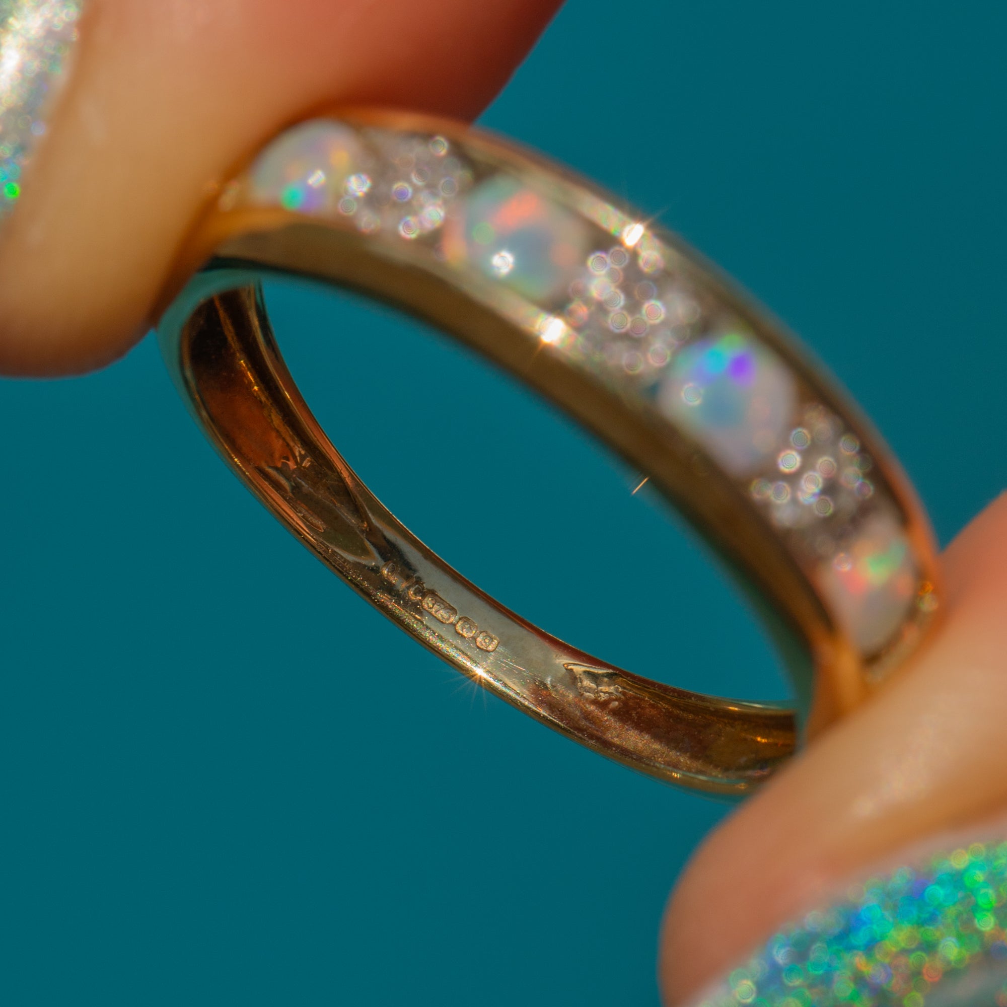 EXCELLENT. This 9ct Gold Opal Diamond half eternity ring is in excellent condition. Both the Opals and Diamonds are secure within their settings and the Gold throughout has a saturated hue and the perfectly formed band glides onto your hand a dream. We know you'll fall for her just as quickly as we did!