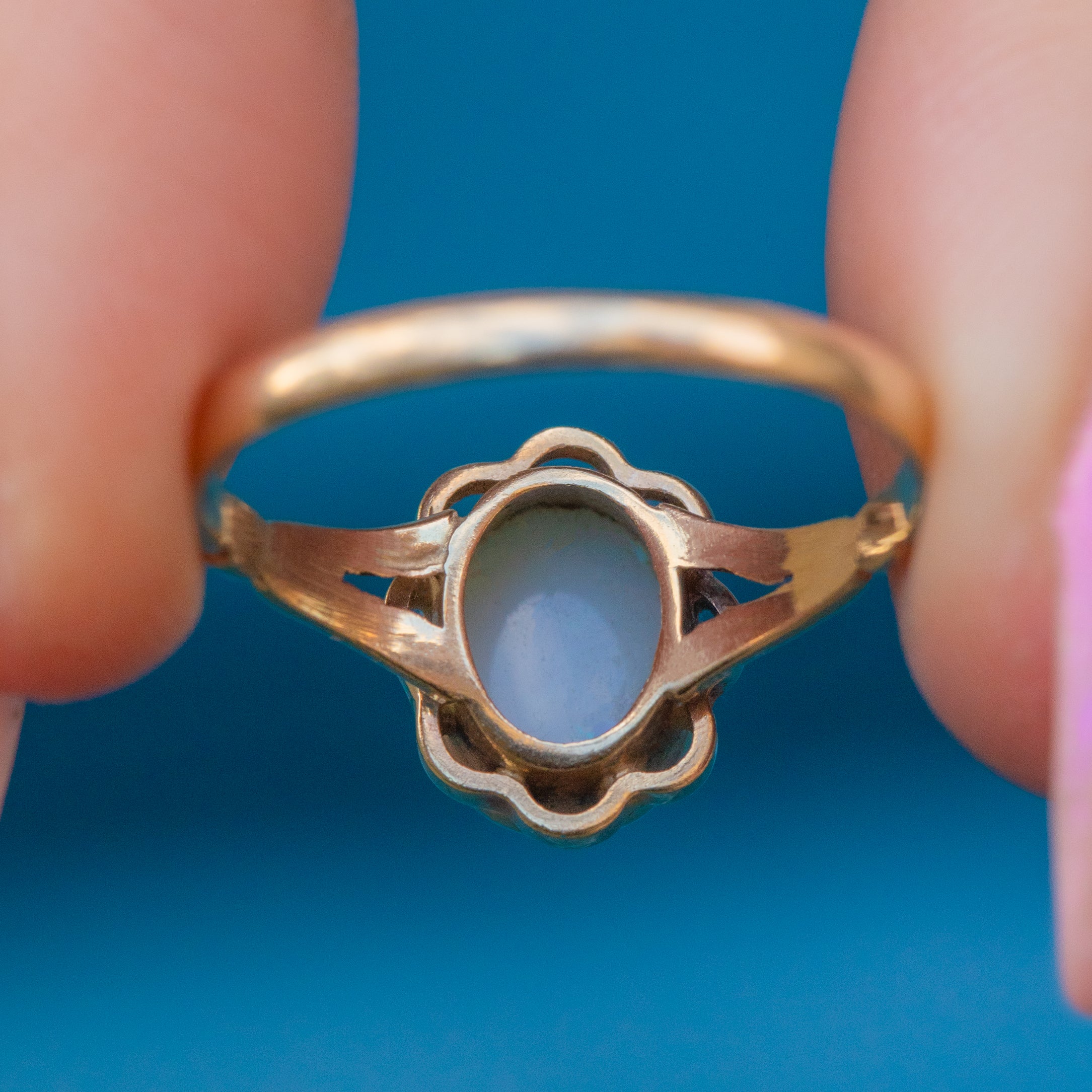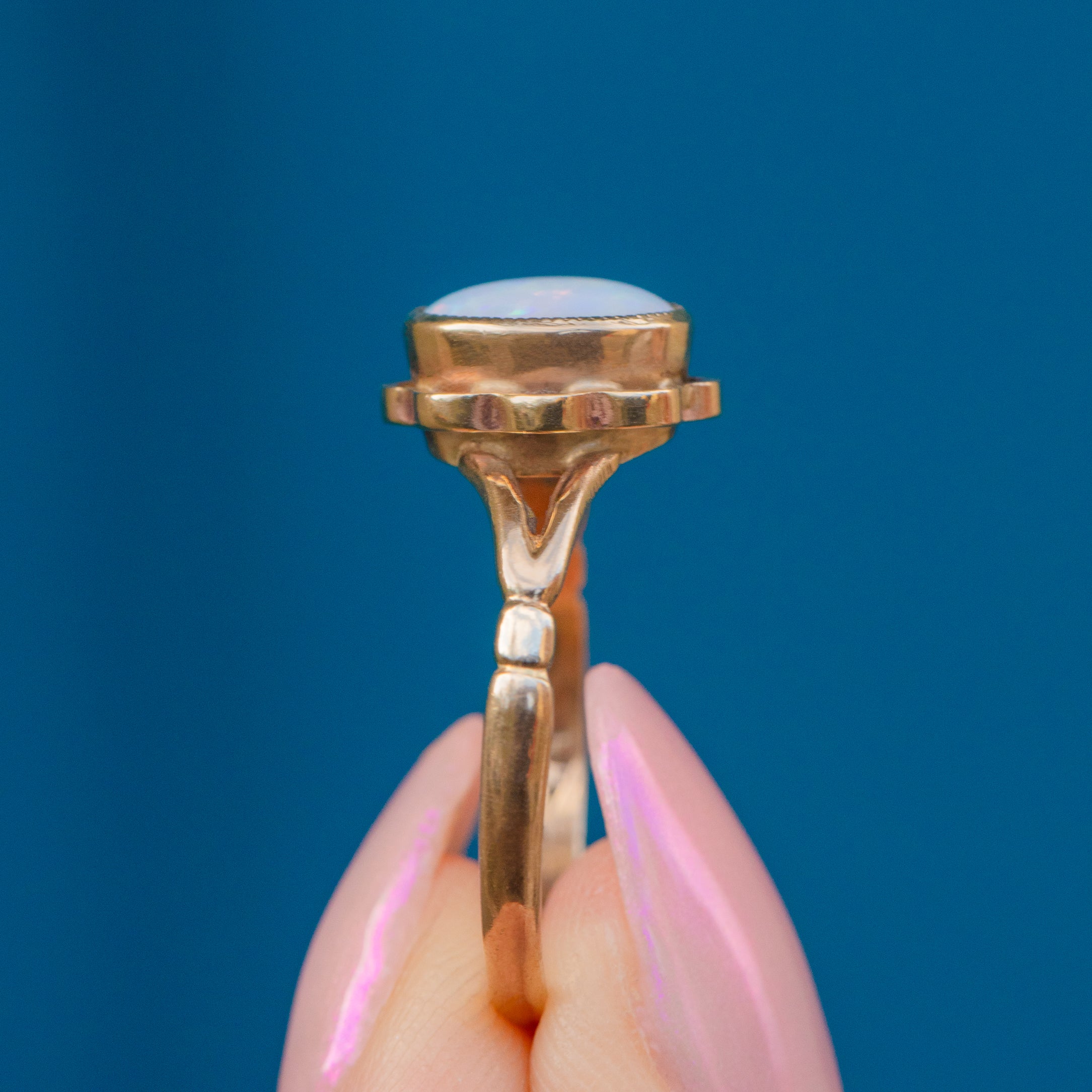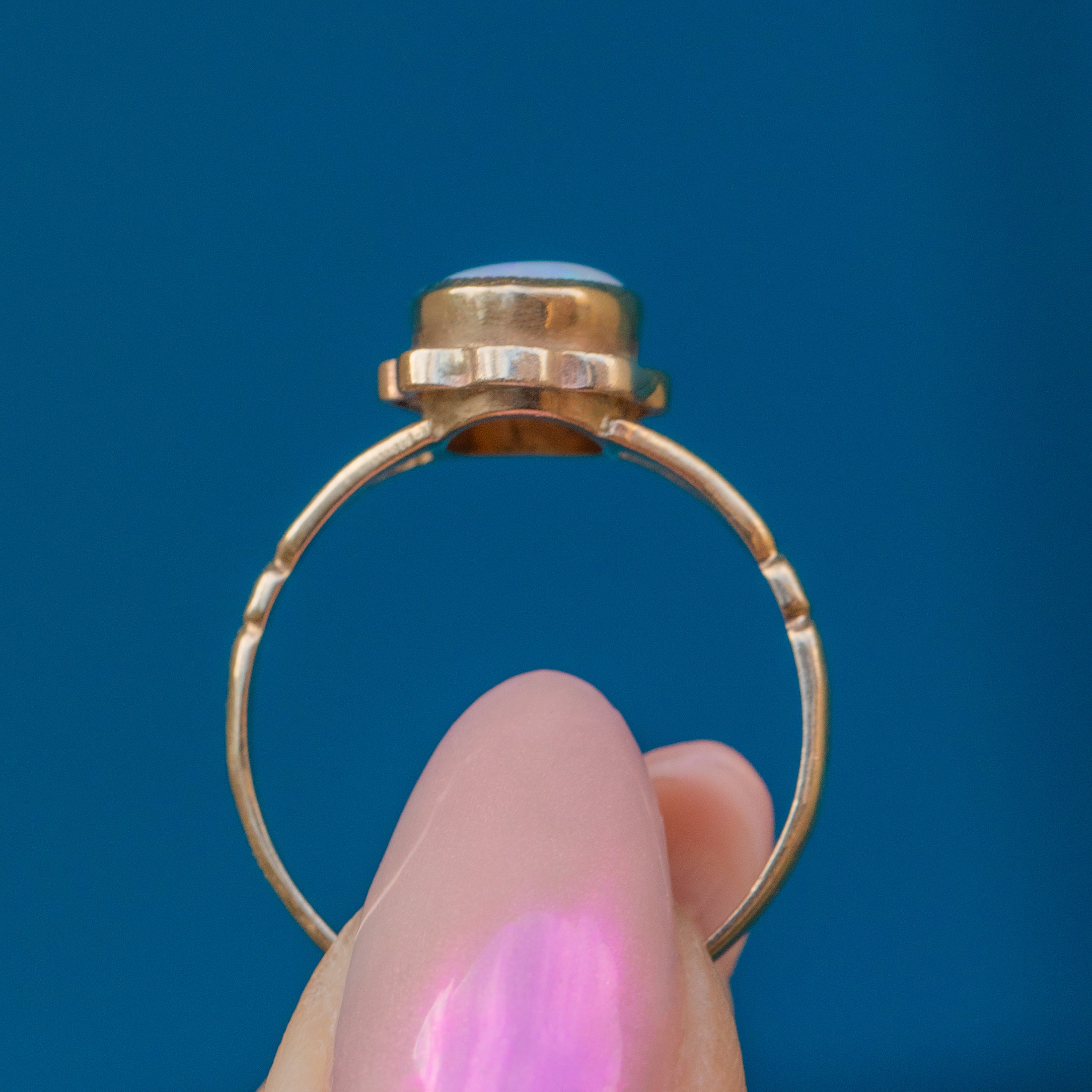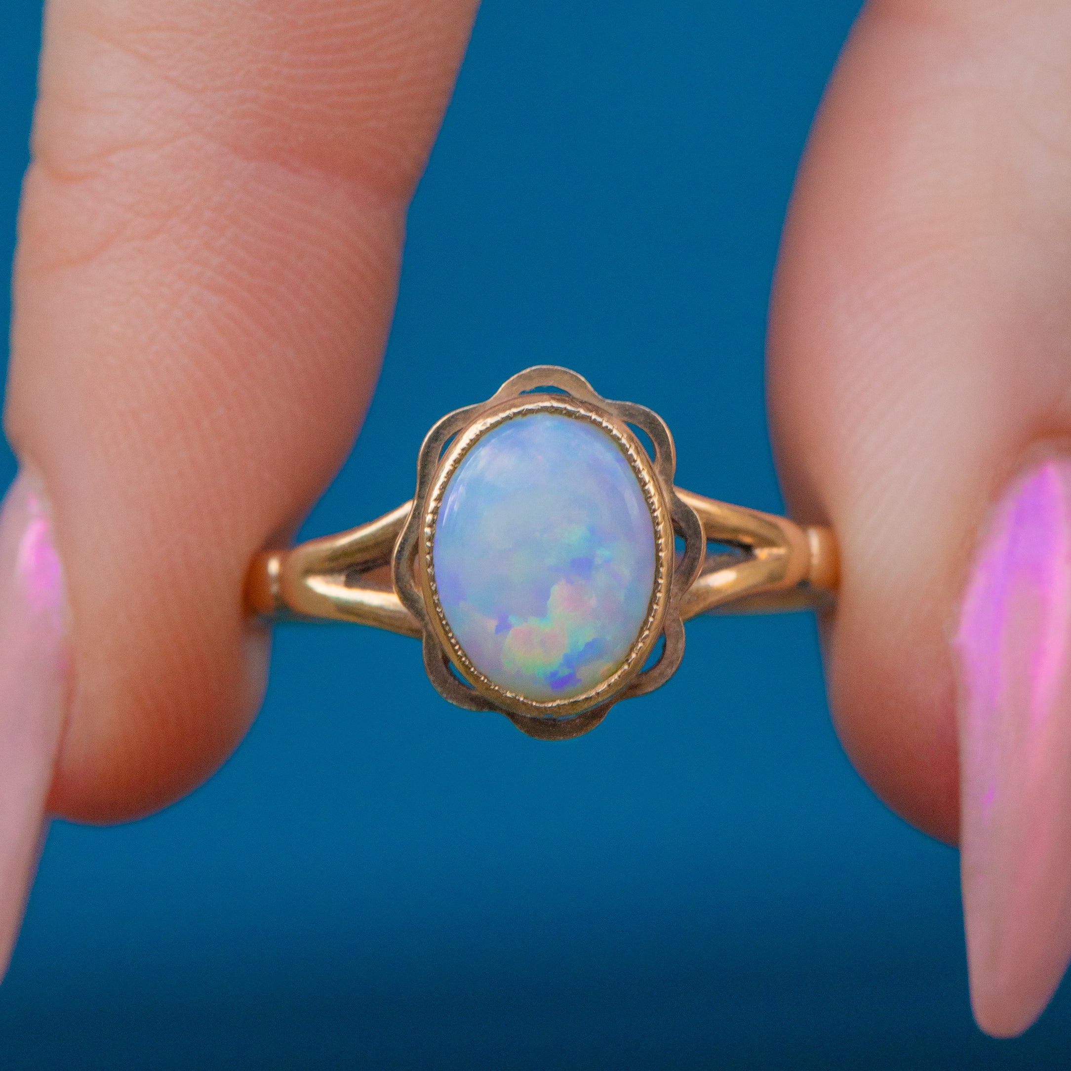 EXCELLENT. This 9ct Gold Opal ring is in superb condition. There is little to report, her 0.62ct Opal cabochon is lively and vibrant, free from any damage to note. A simply stunning vintage piece to add to your collection!