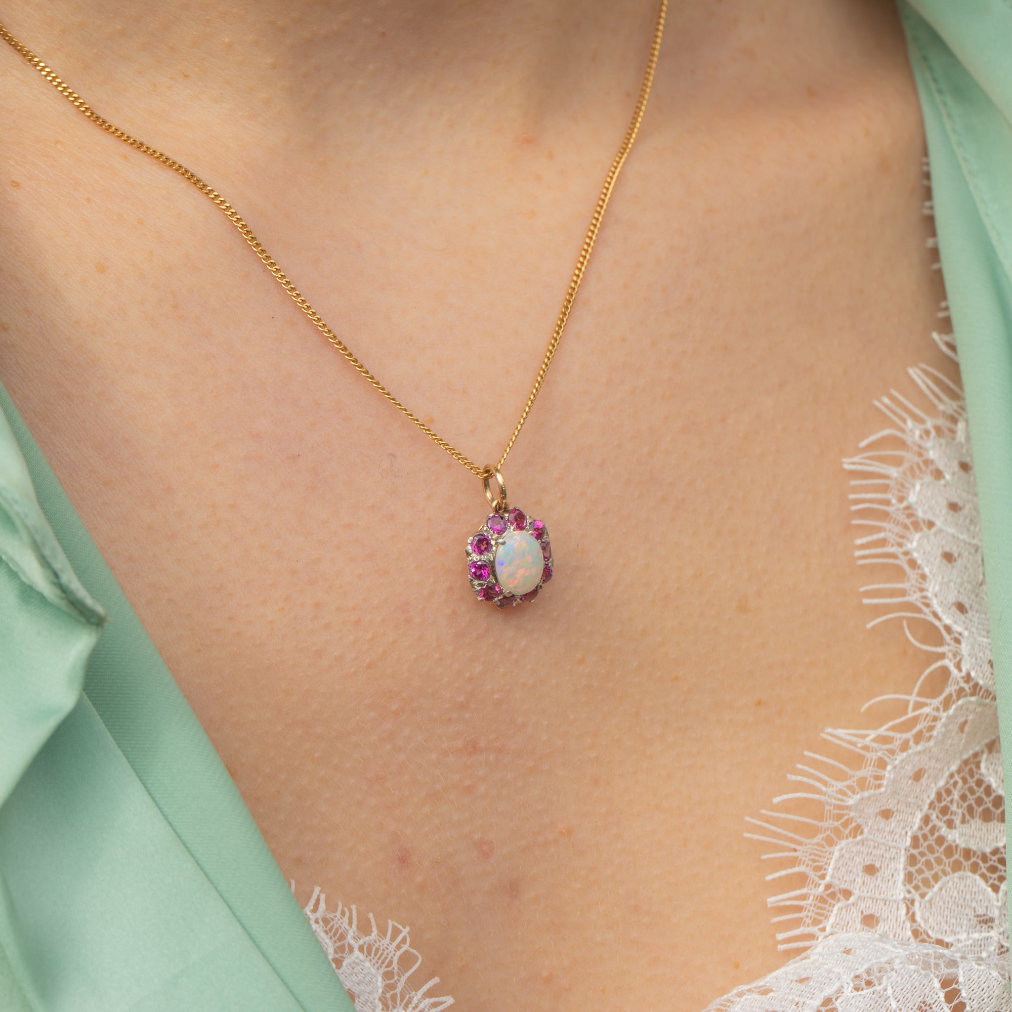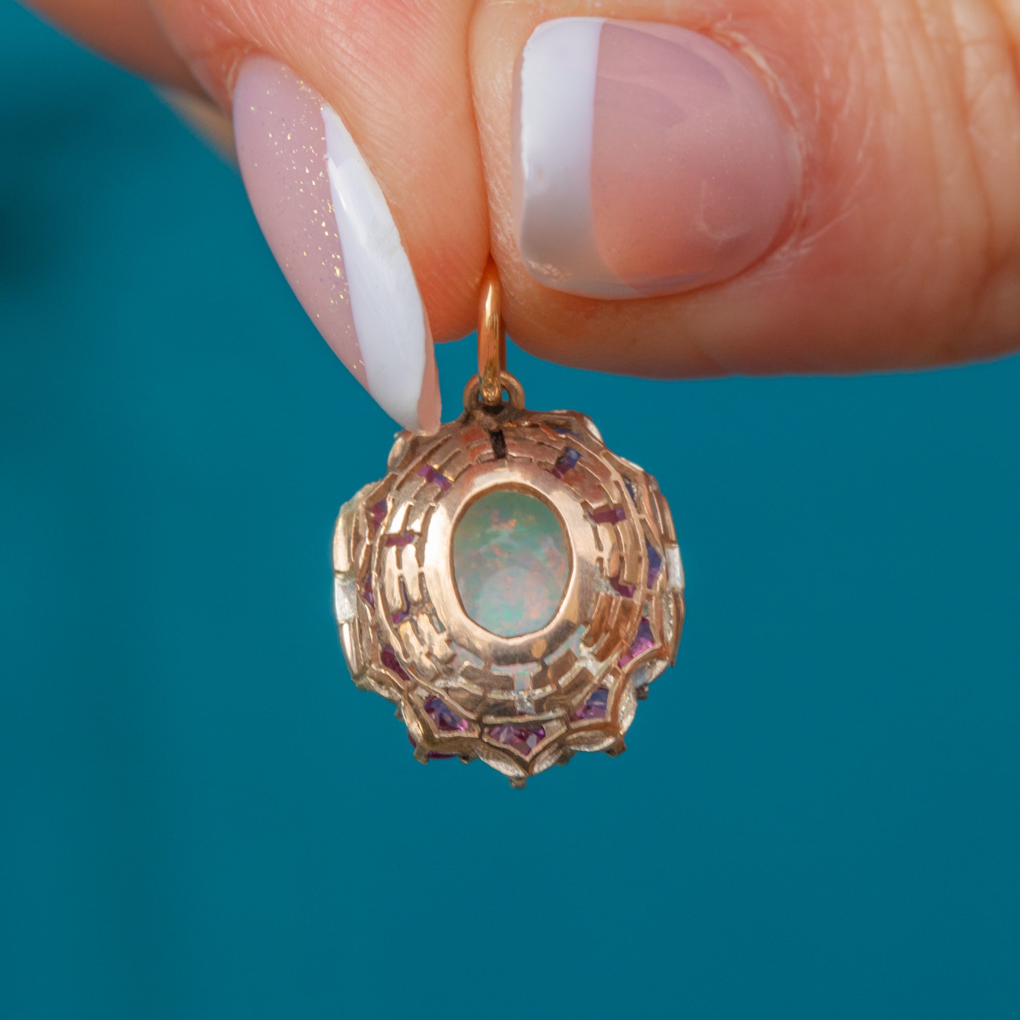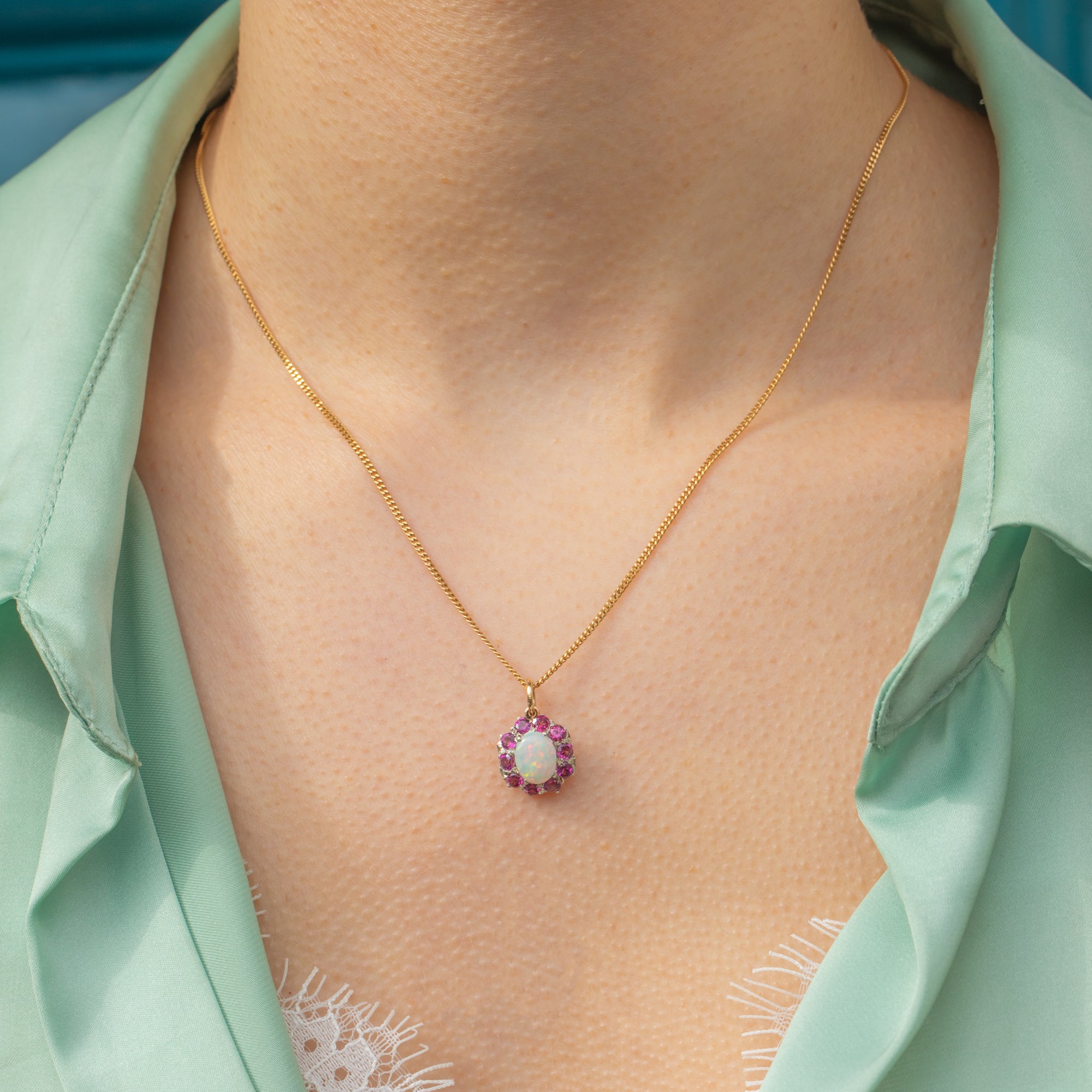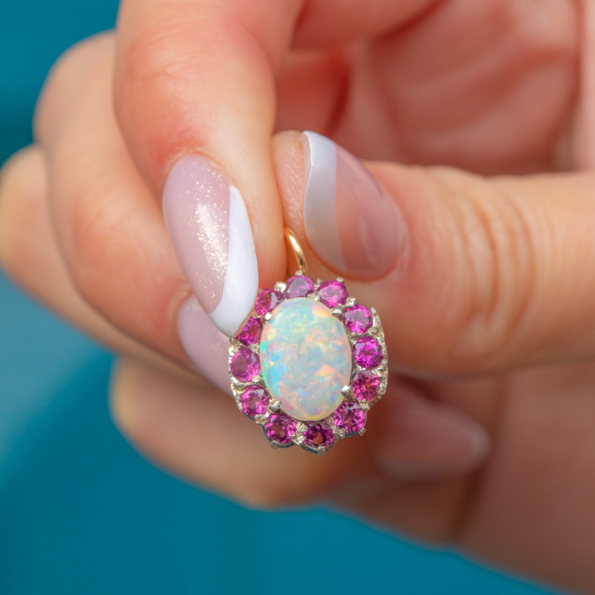 Admire the grandeur of this 9ct Gold Opal Rhodolite Garnet Cluster Charm! This authentic antique 1920's charm pendant homes a lively 0.50ct Opal centre, haloed by a vibrant pink Garnet cluster. All the gemstones are lovingly set within 9ct Gold into a feminine floral form.