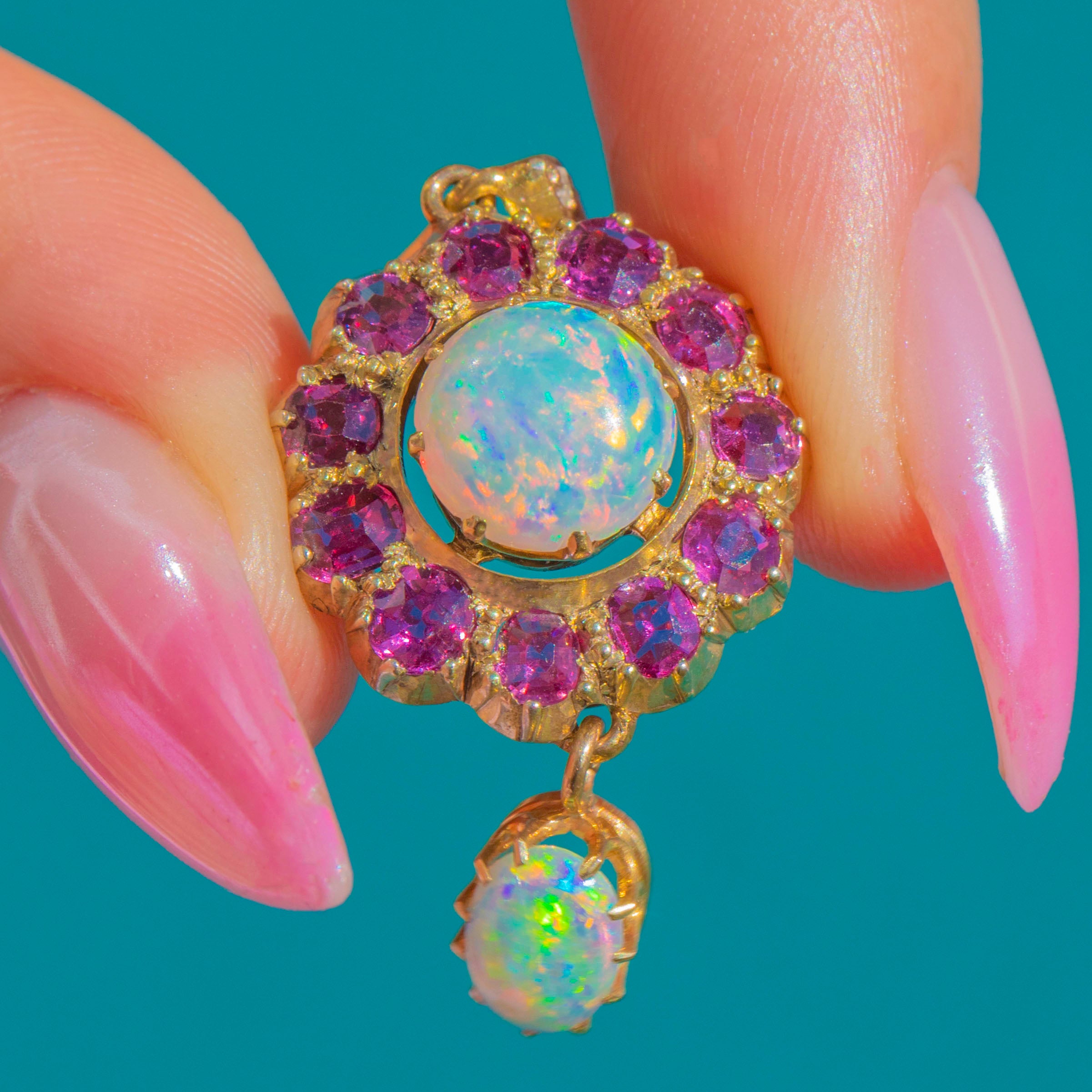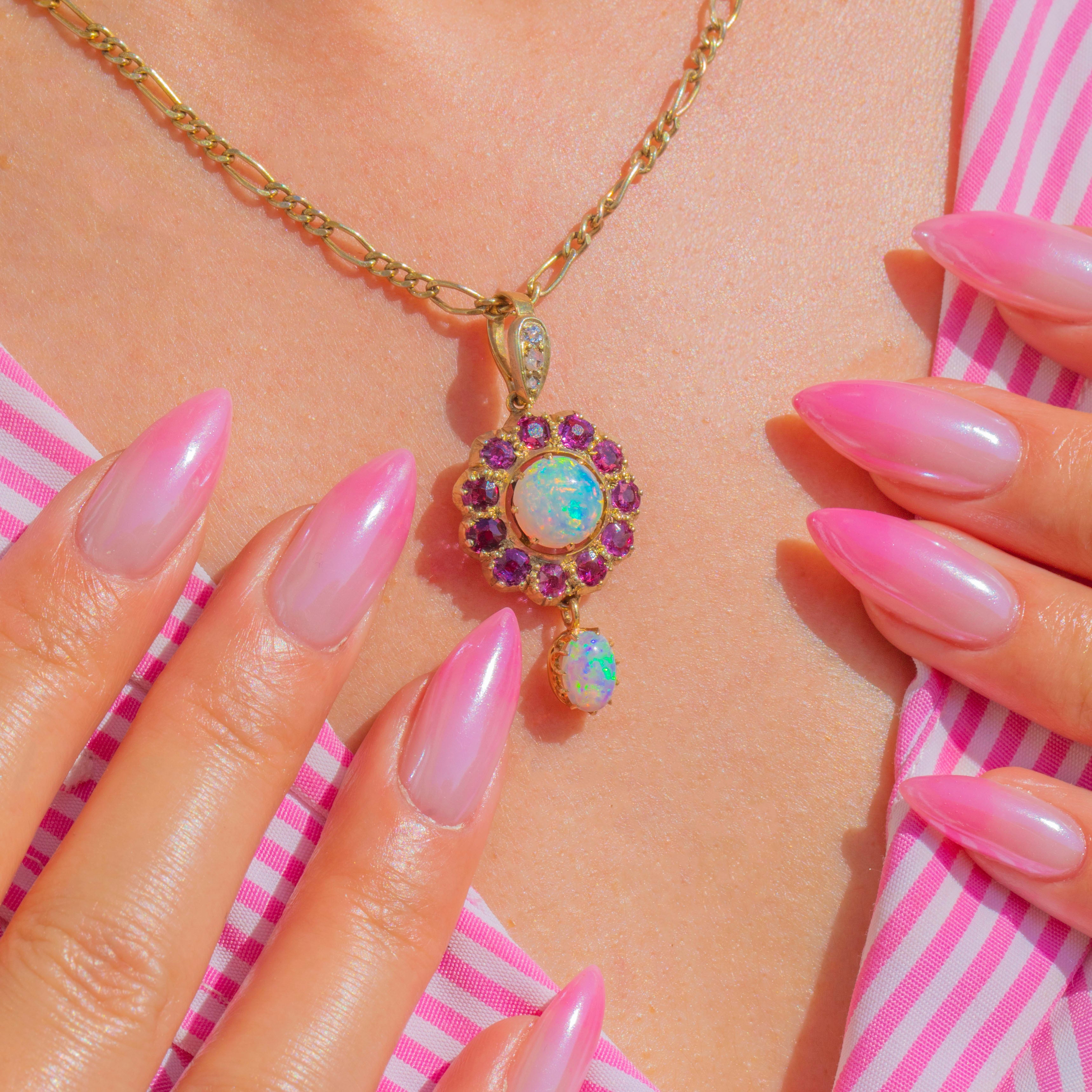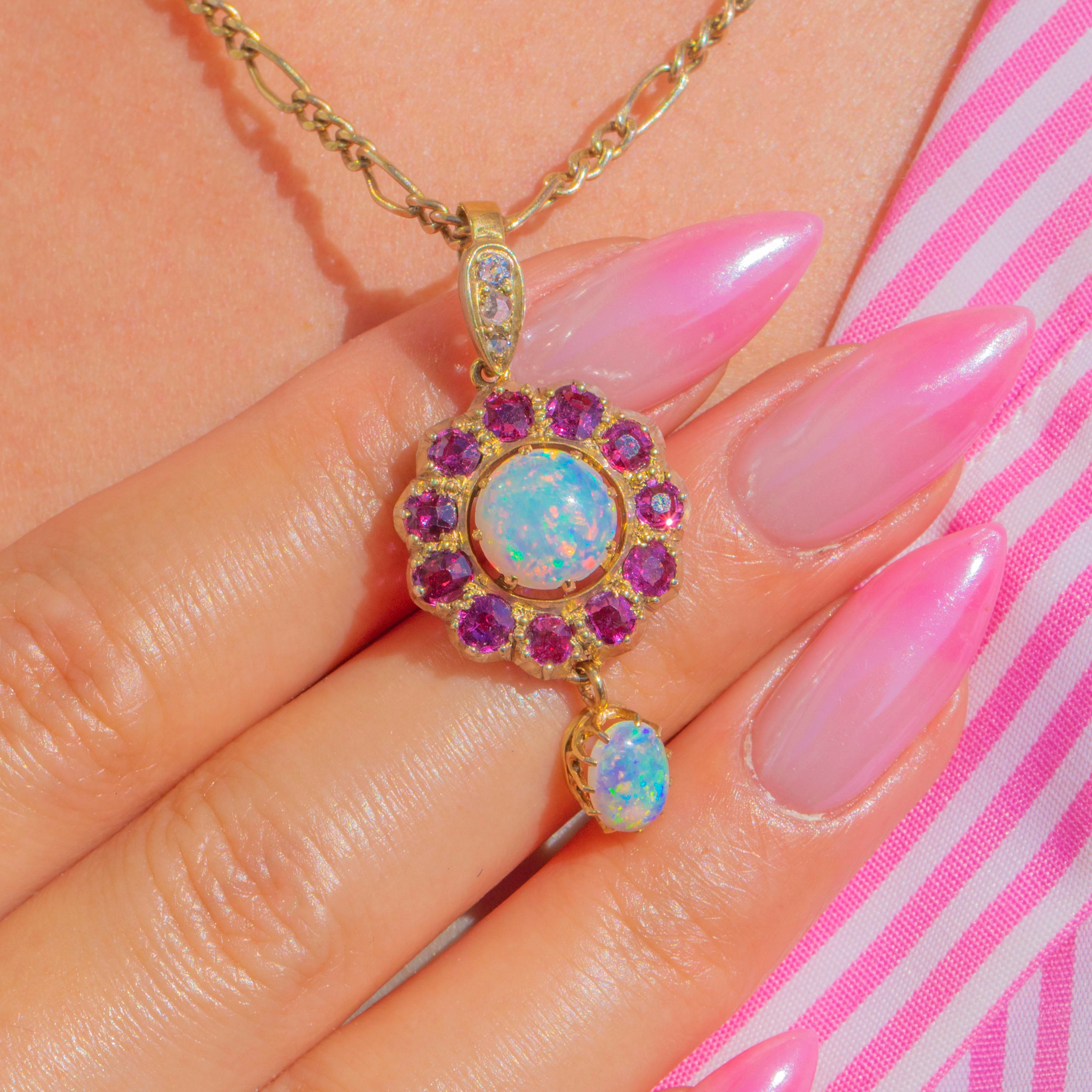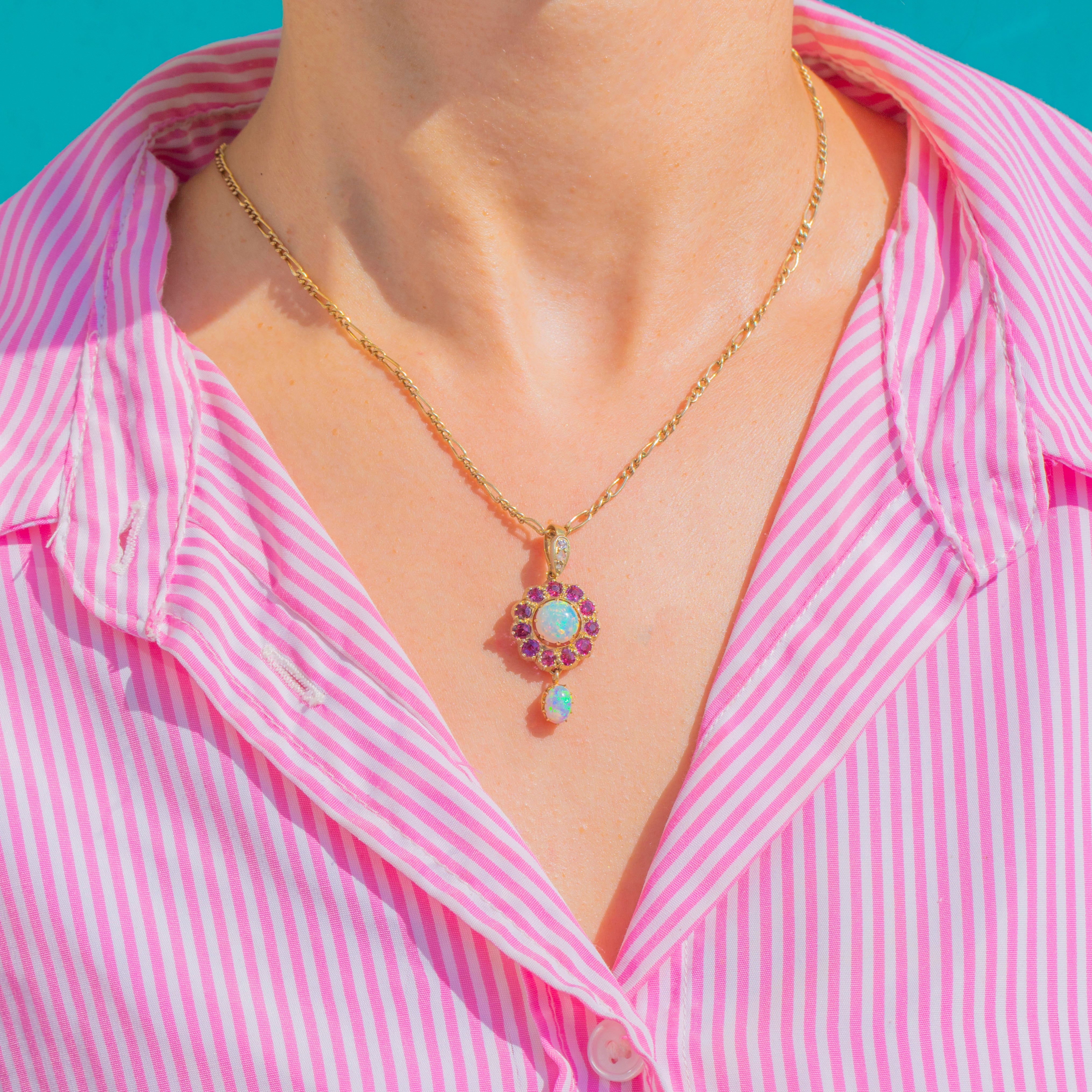 Schimmernd in romantischen Farben und mit anmutiger Bewegung präsentiert sich dieser Victorian Anhänger aus 9ct Gold als Cluster-Drop-Design. Im Zentrum steht ein leuchtender runder Opal-Cabochon, umgeben von einer lebhaften Rosette aus Rubinen. Ein zierlicher ovaler Opal ist darunter beweglich angebracht, fängt bei jedem Schritt das Licht ein und spiegelt das ätherische Farbenspiel des oberen Steins wider. Winzige Diamanten funkeln an der Öse und verleihen dem warmen Gold einen zarten Hauch von Brillanz.