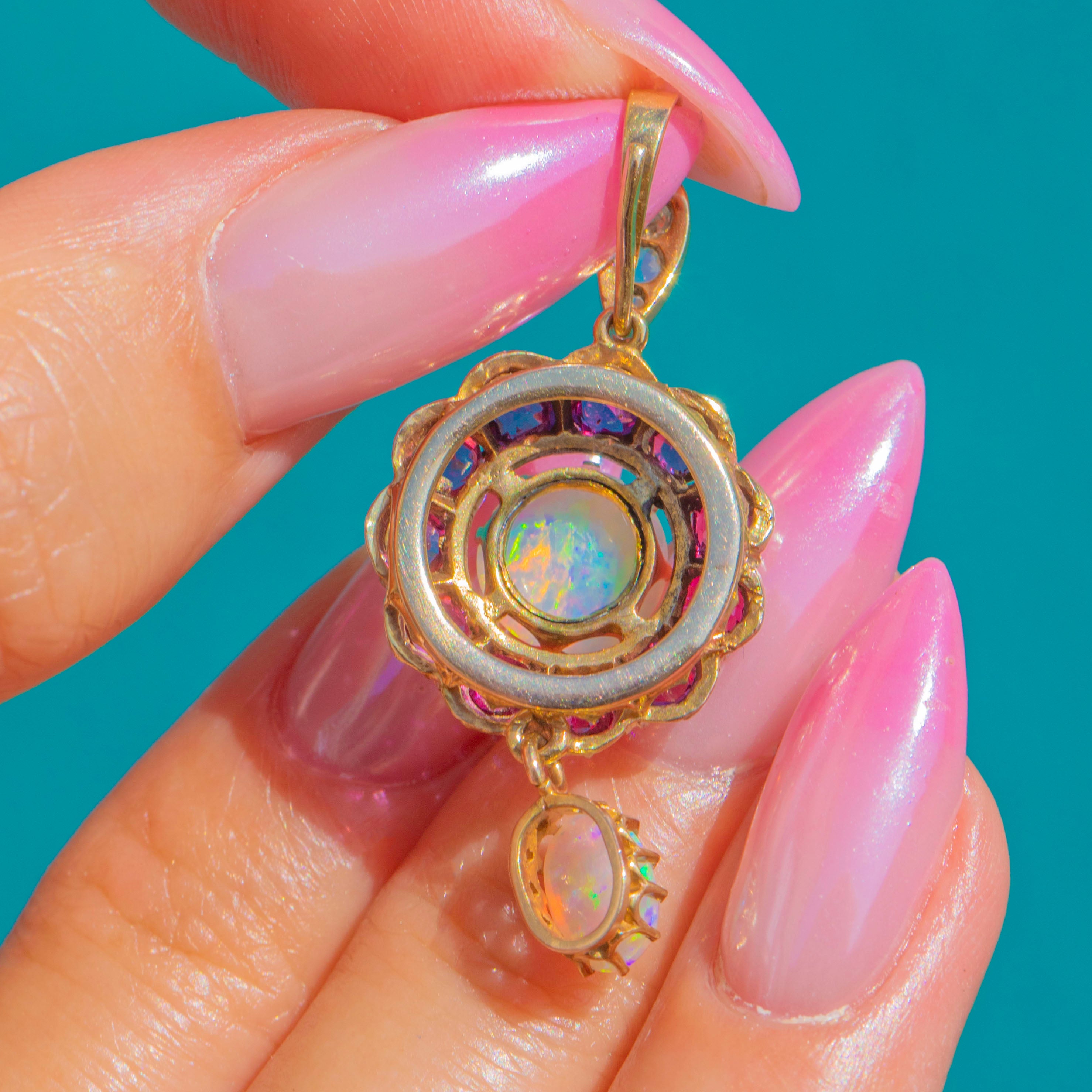 Anhänger aus 9ct Gold mit Opal, Rubin und Diamant im Cluster-Design