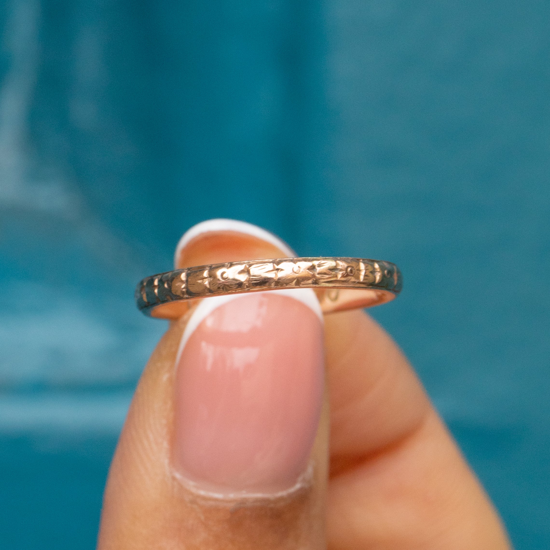 Orange blossom motifs have been skillfully etched across the faceted form of this vintage Gold band, symbolising innocence and fertility, a popular design for wedding bands that link back to the Victorian era!