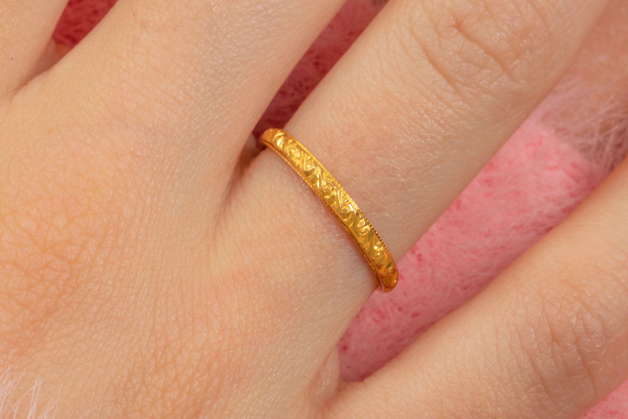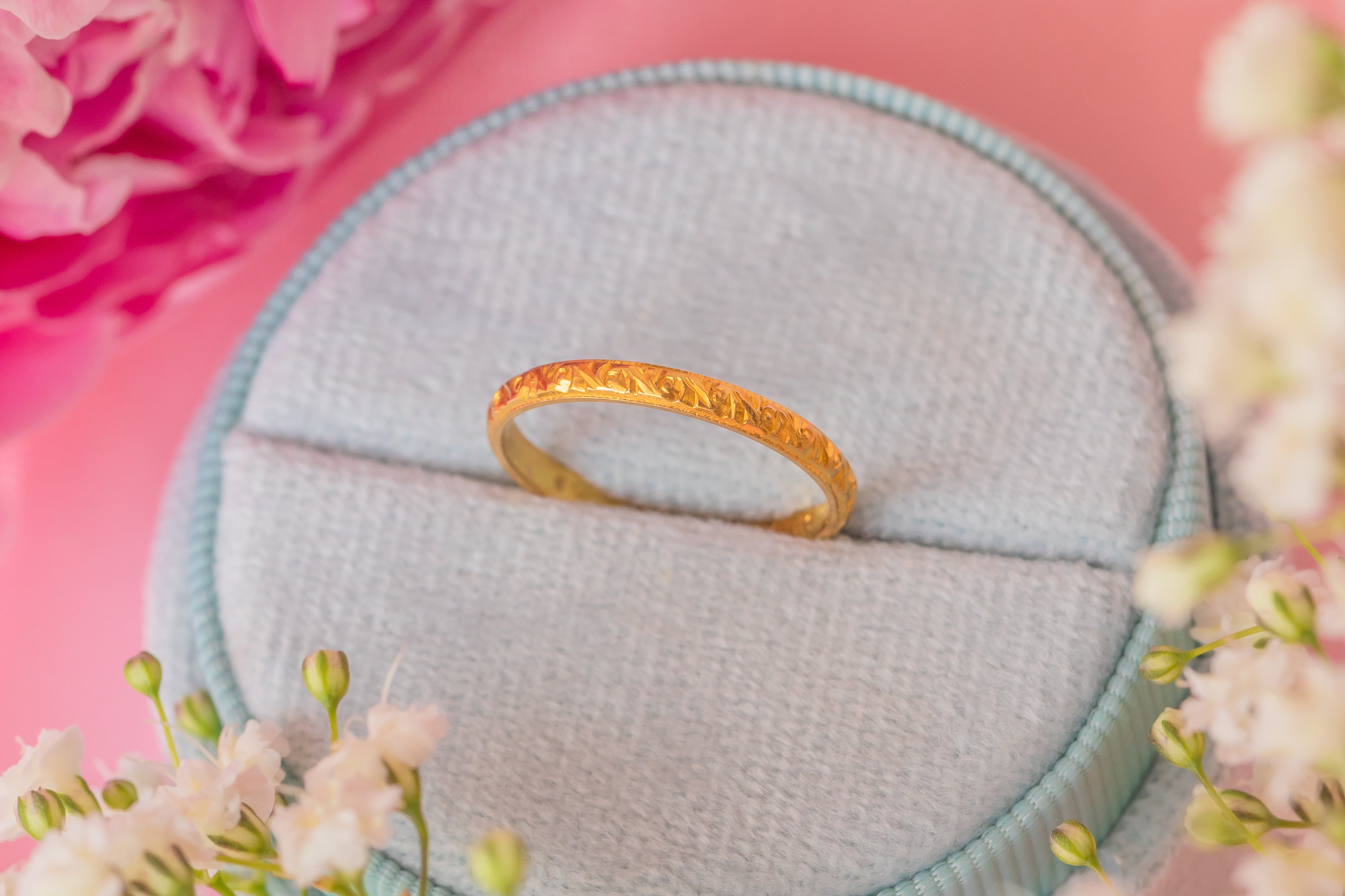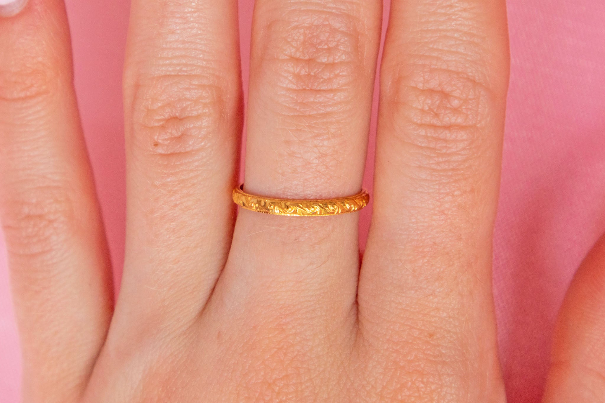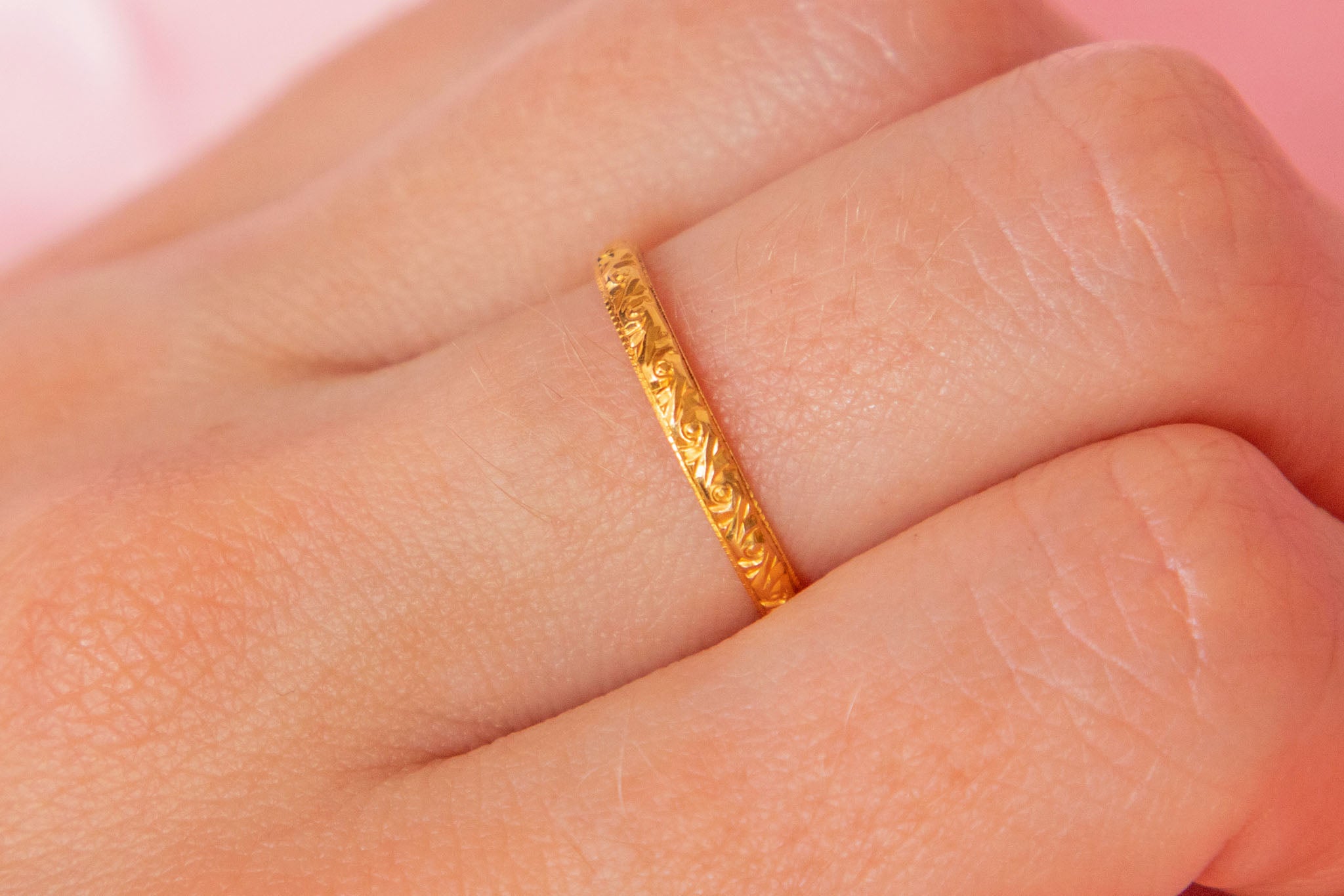Her 9ct Gold boasts a bright sunshine hue, and measuring 2mm this vintage ring is perfect for stacking alongside your engagement ring or other jewels! We think that you'll fall more in love with it throughout the course of your marriage, not only for her beauty but also what she represents!