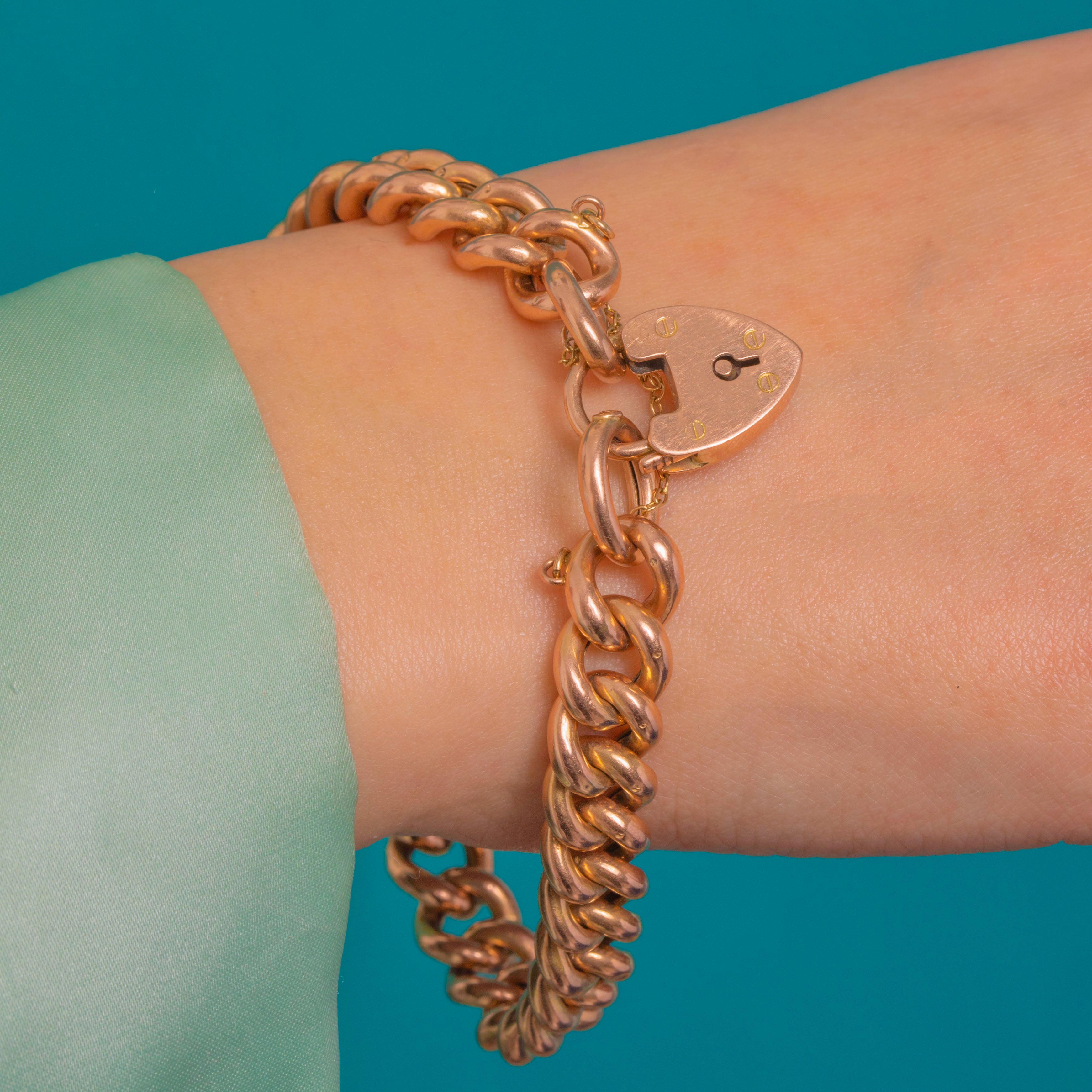 A mid-century classic with a romantic twist, this 9ct Gold curb link bracelet fastens with a heart-shaped padlock clasp and safety chain. The links have a gorgeous rosy hue and high polish, giving a sleek drape and a bold, minimalist look on the wrist.