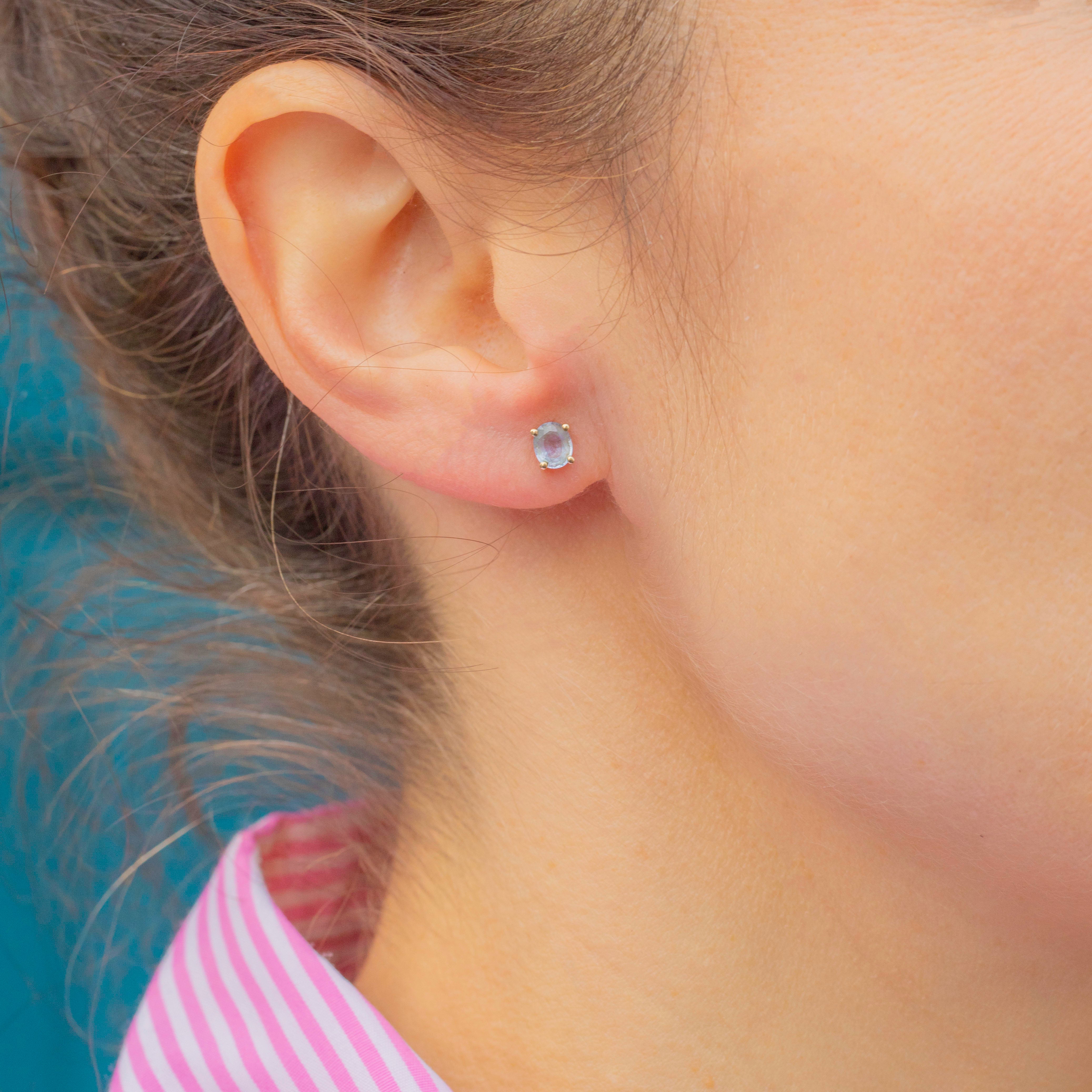 These 9ct Gold Pale Blue Sapphire stud earrings will make a lovely addition to your collection! Displaying oval-cut frosty cornflower blue Sapphires set in high-quality 9ct Gold, these vintage studs offer a delicate and timeless look. The elegant stones are securely held in a simple claw setting, showcasing their soft, serene colour.