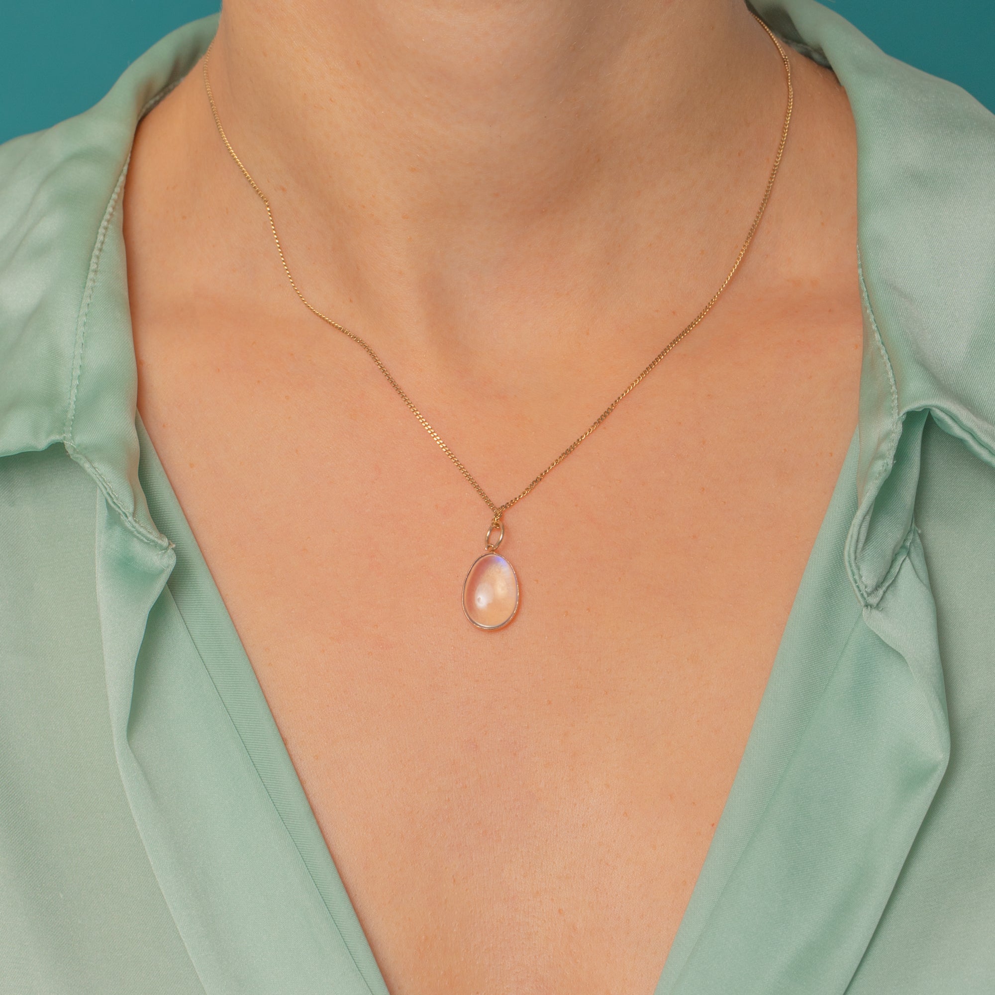EXCELLENT: The Moonstone is luminous with no visible chips or cracks, displaying beautiful internal sheen. The Pearl is smooth and intact. Gold setting is bright and secure with minimal wear.