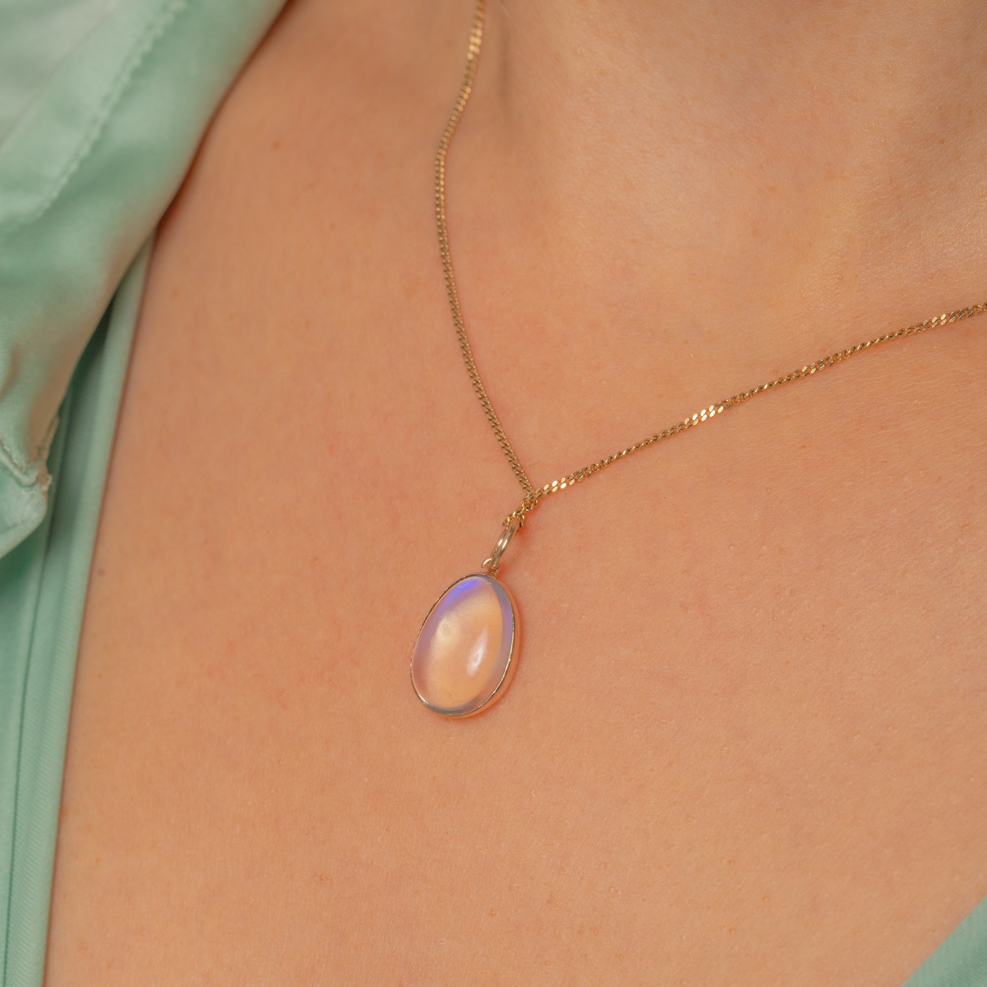 Moonstone measures 13mm long x 9mm wide, weighing approx. 2.44ct.