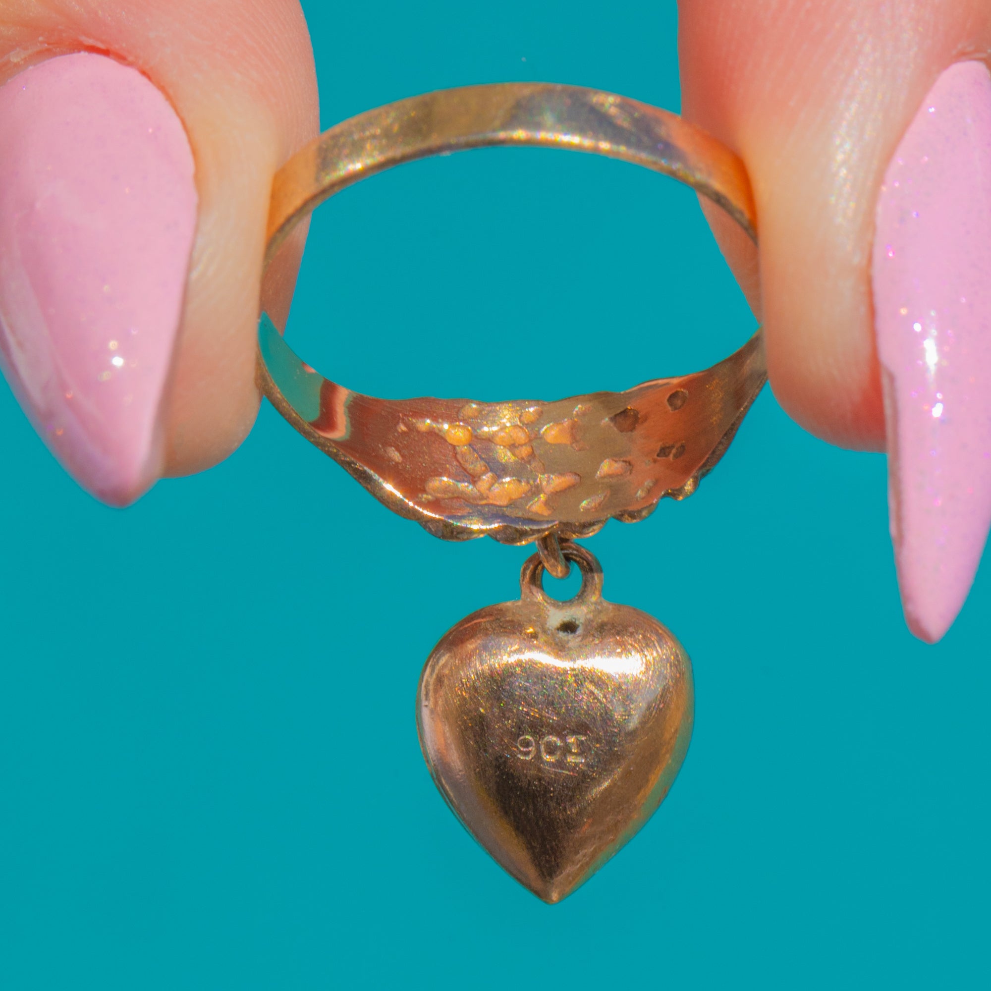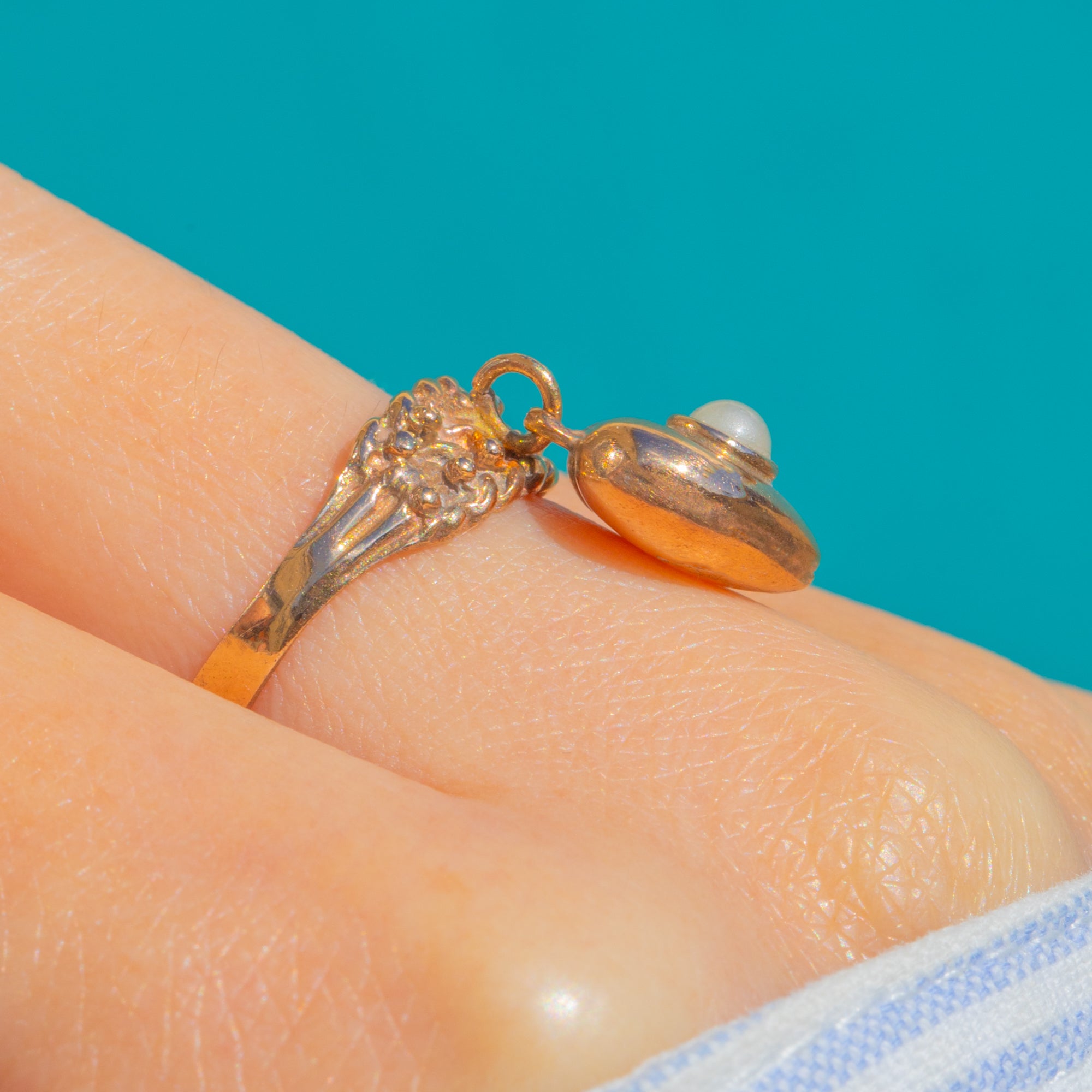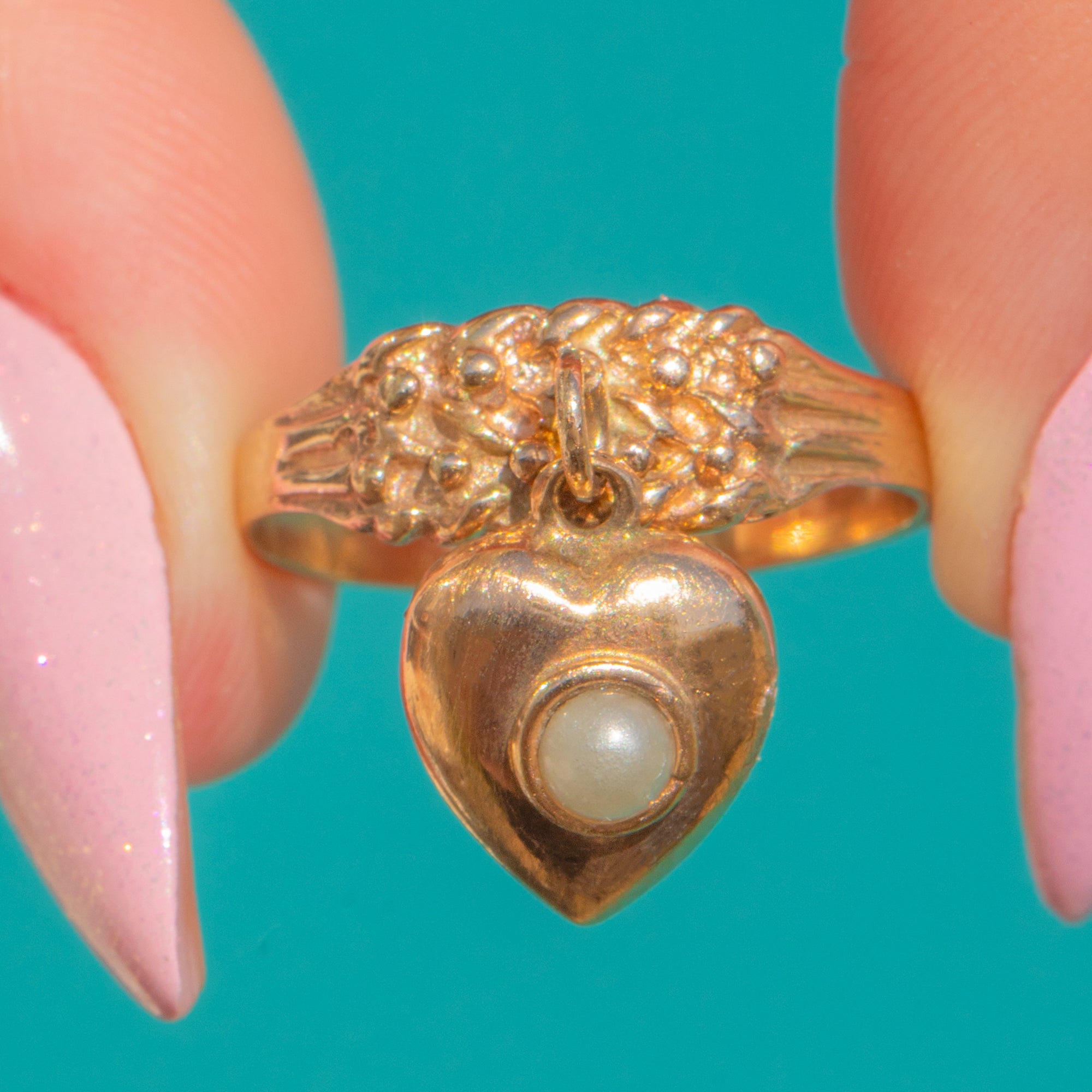 Ein zarter Vintage-Charmeur: Dieser „Keeper“-Ring aus 9ct Gold trägt einen kleinen Herzanhänger, besetzt mit einer cremefarbenen Perle. Das bewegliche Herz schwingt unter einem kunstvoll verzierten, muschelförmigen Kartuschen-Element, während die feinen Schultern mit winzigen, erhabenen Kügelchen für eine romantische, viktorianisch inspirierte Note geschmückt sind.