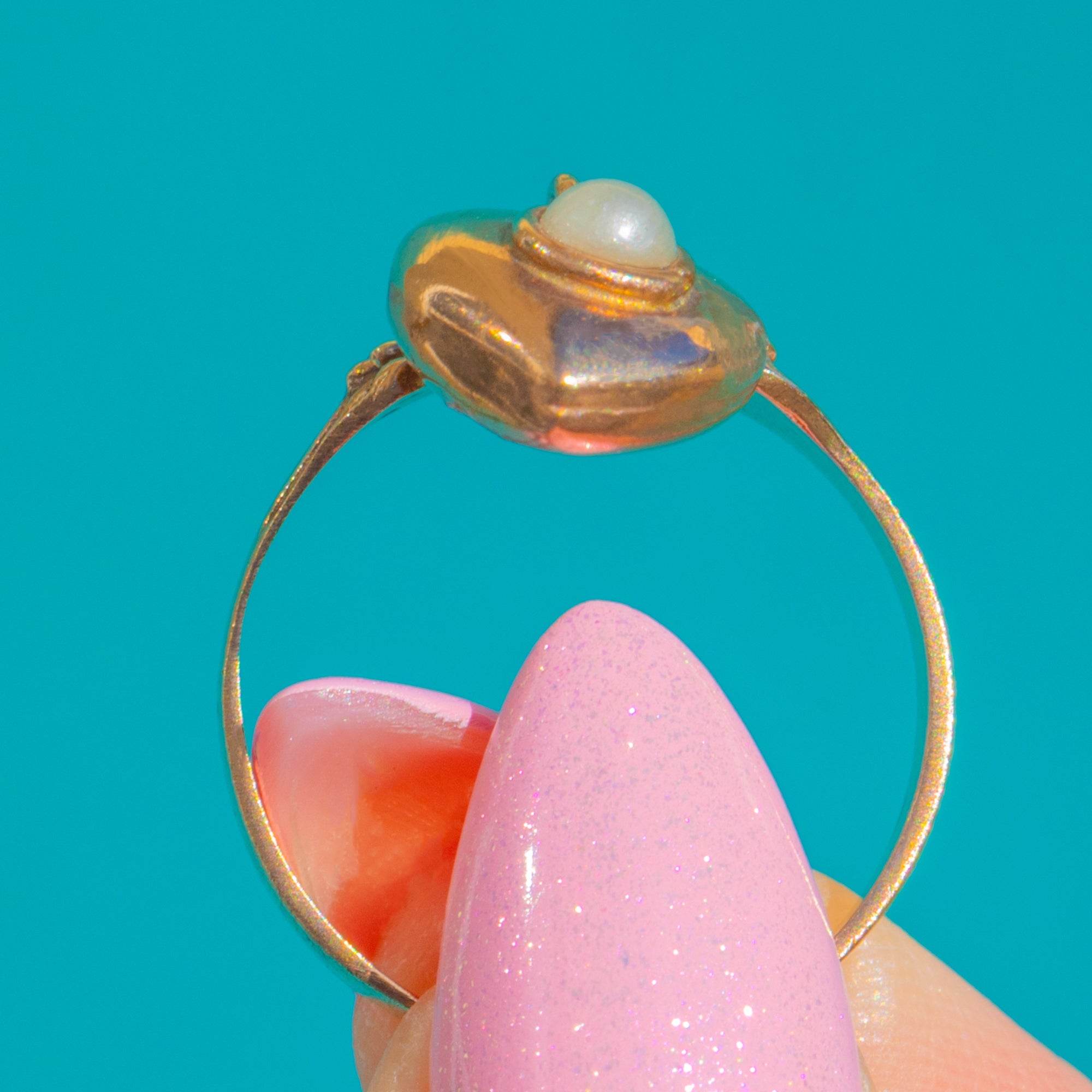 Wundervoll taktil und voller Gefühl, leuchtet das warme 9ct Gold mit einer sanften Patina, und die glänzende Perle sitzt sicher in ihrer feinen Zarge. Elegant einzeln oder im Stapel getragen – ein zarter Liebesgruß, den Sie jeden Tag bei sich tragen können.