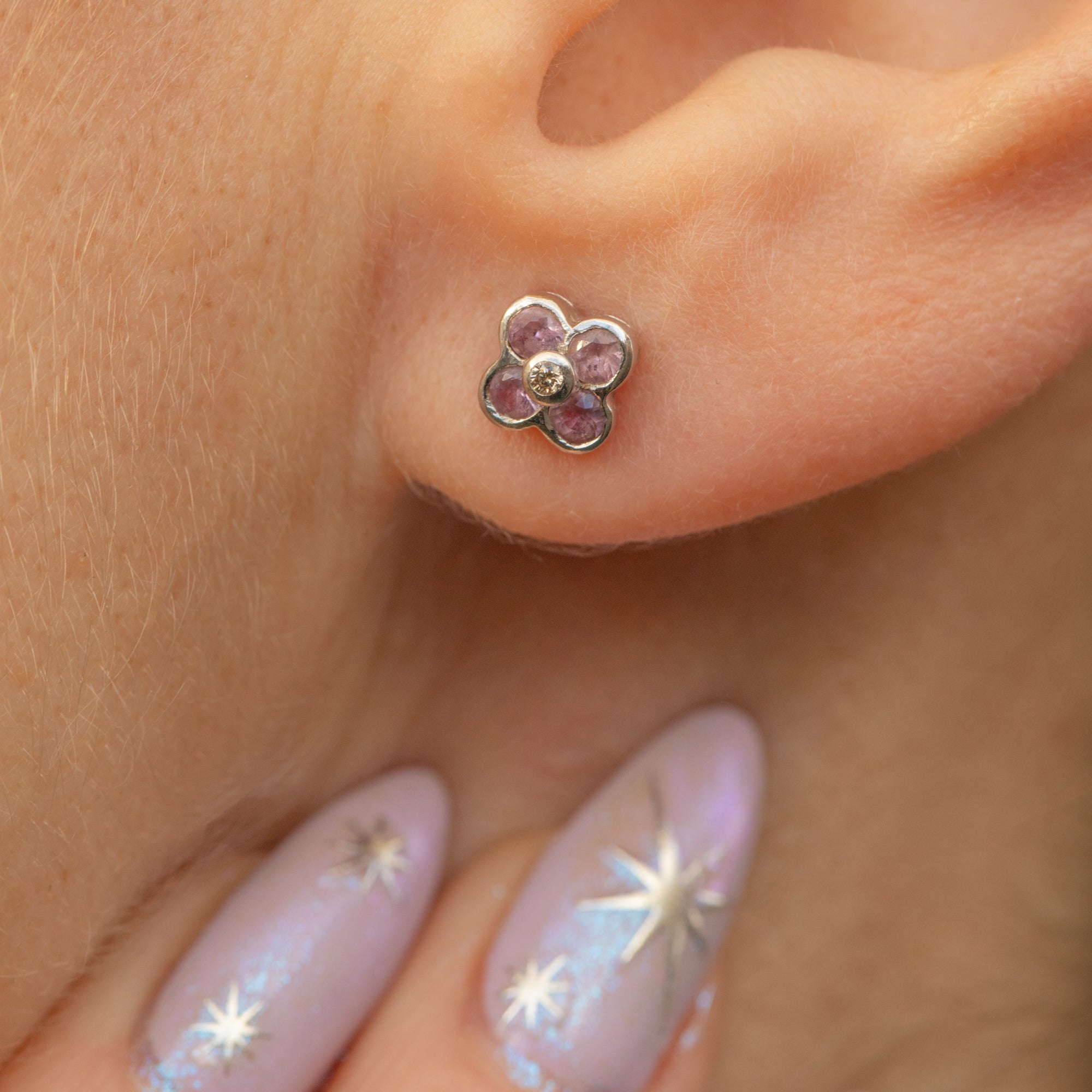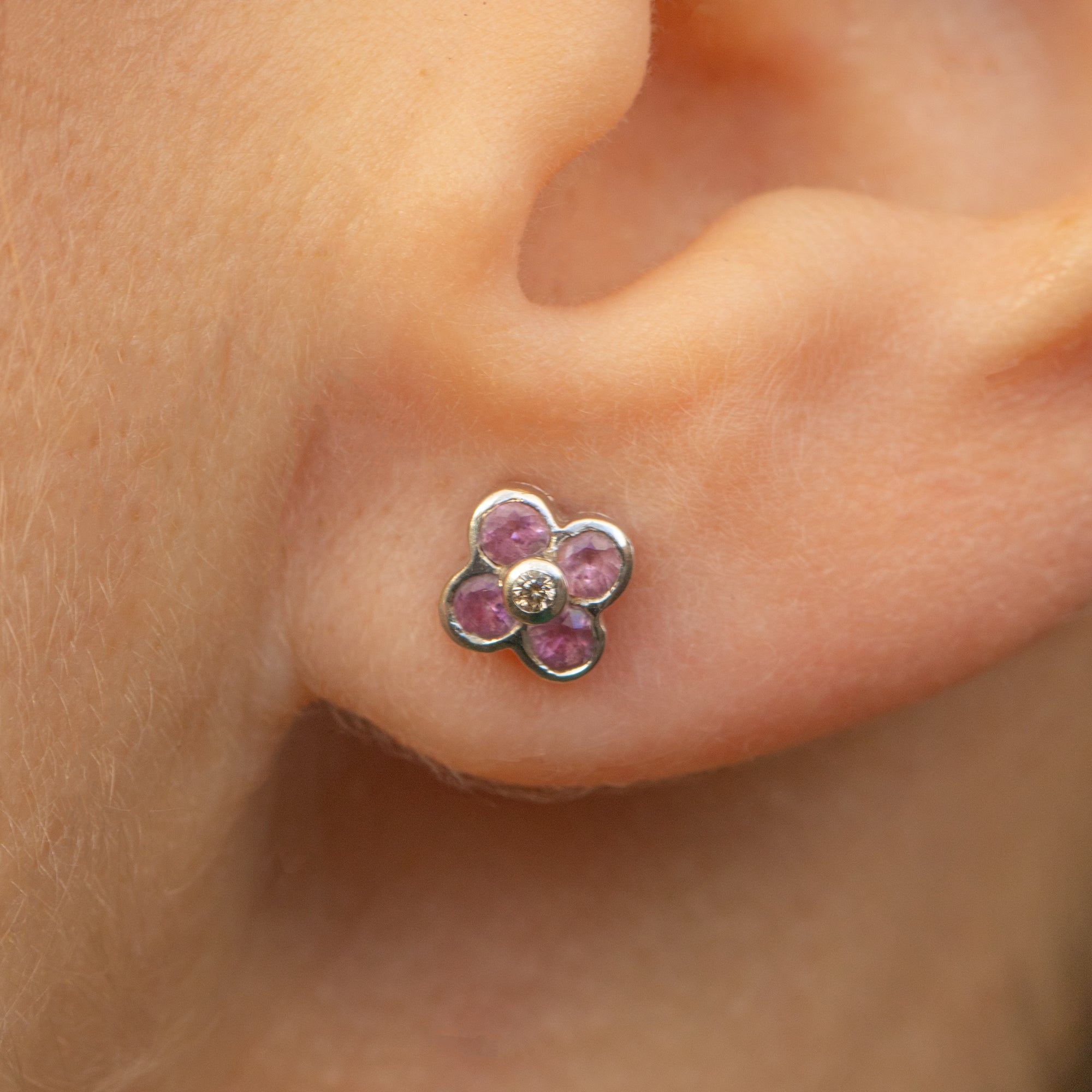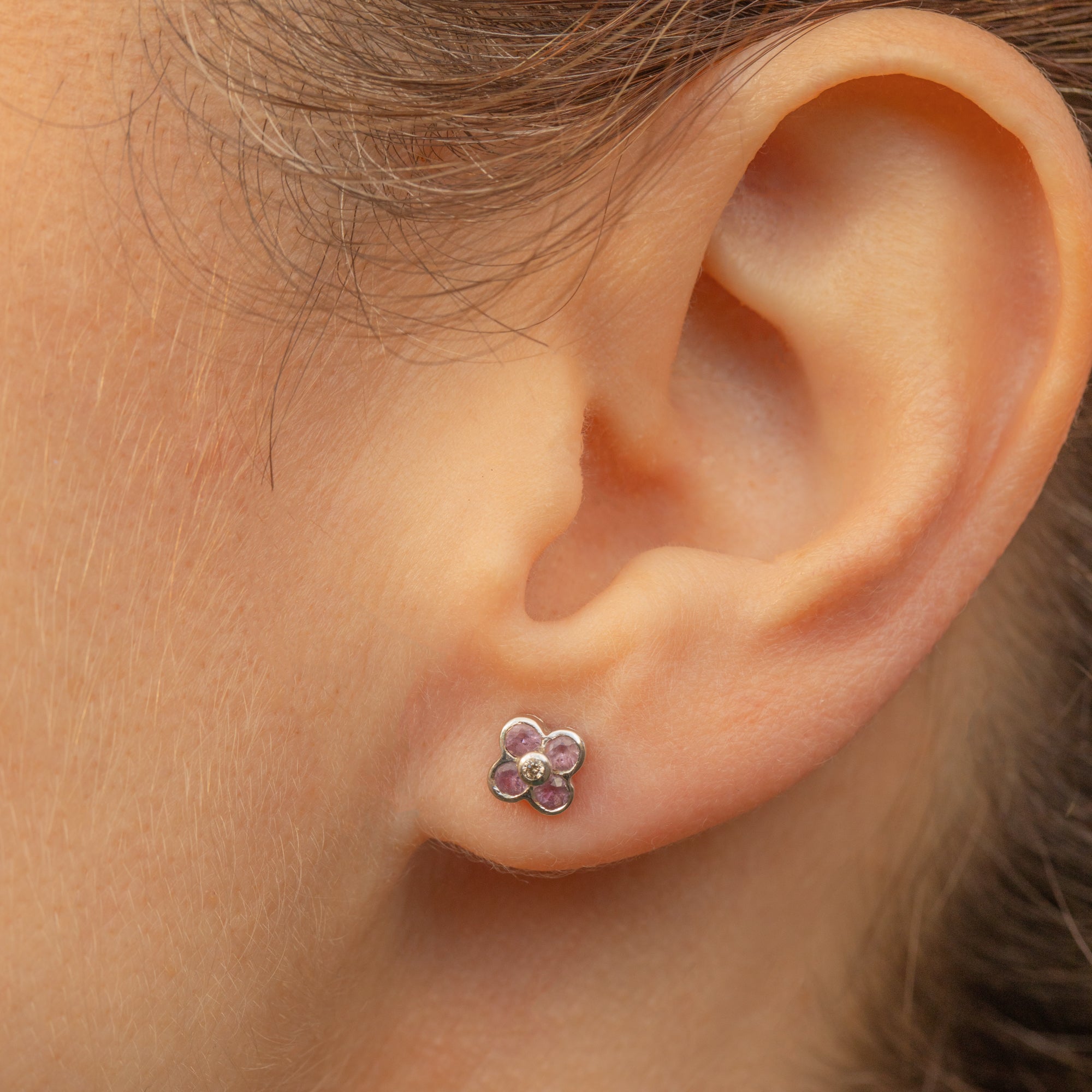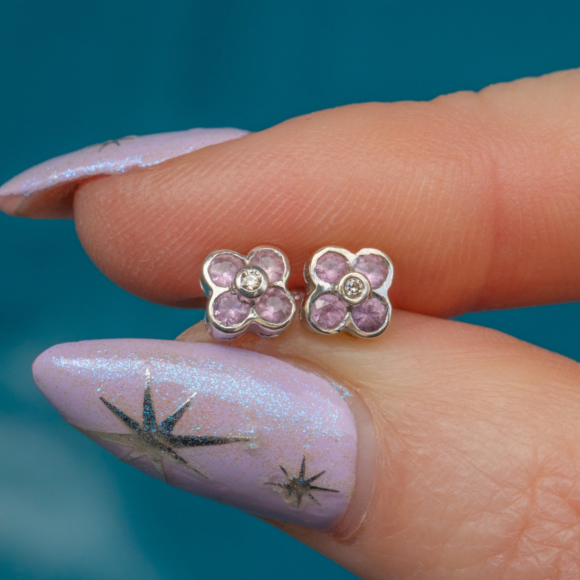 Crafted from bright 9ct White Gold, each cluster stud features eight gorgeous Pink Sapphires, each radiating a wonderful pastel pink hue. They are effortlessly complemented by a scintillating Diamond in the centre, creating a gorgeous flower motif.