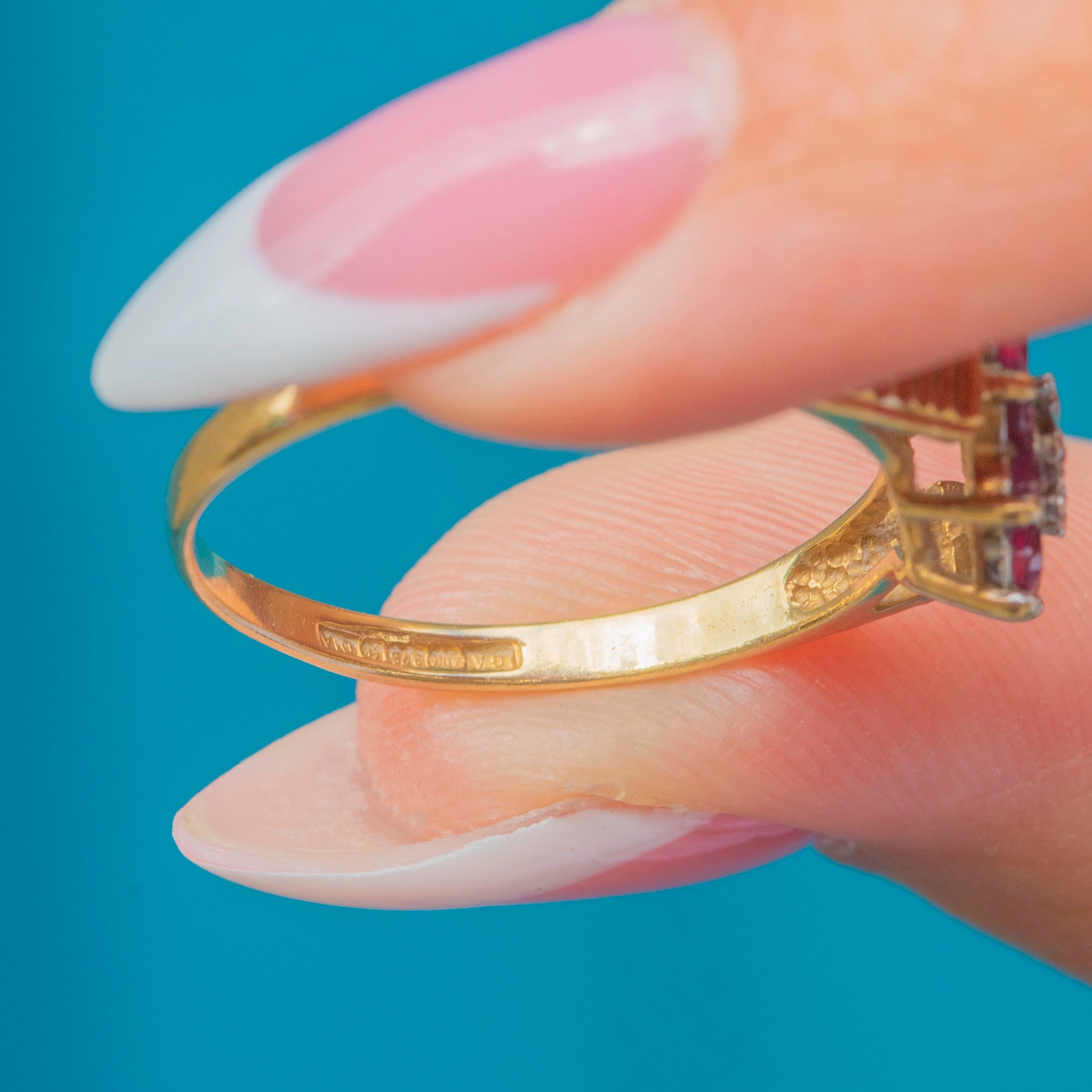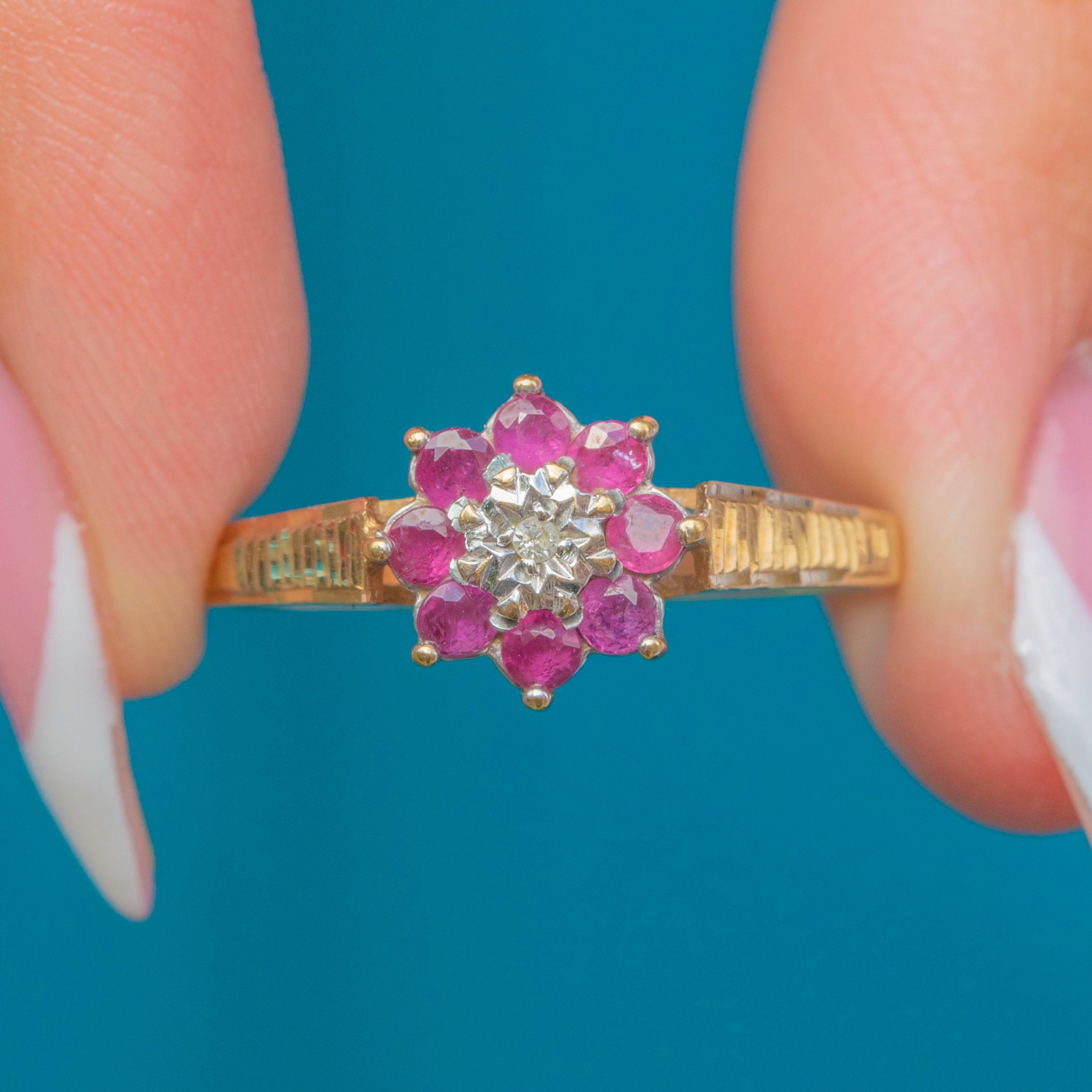 This Vintage 9ct Gold cluster ring features a vibrant arrangement of round-cut Rubies encircling a central sparkling Diamond, forming a charming floral motif. The gemstones are set in secure claws, with the Diamond elevated slightly to catch the light beautifully. The shoulders are adorned with stepped, engraved detailing, adding a touch of texture to the warm Gold band.