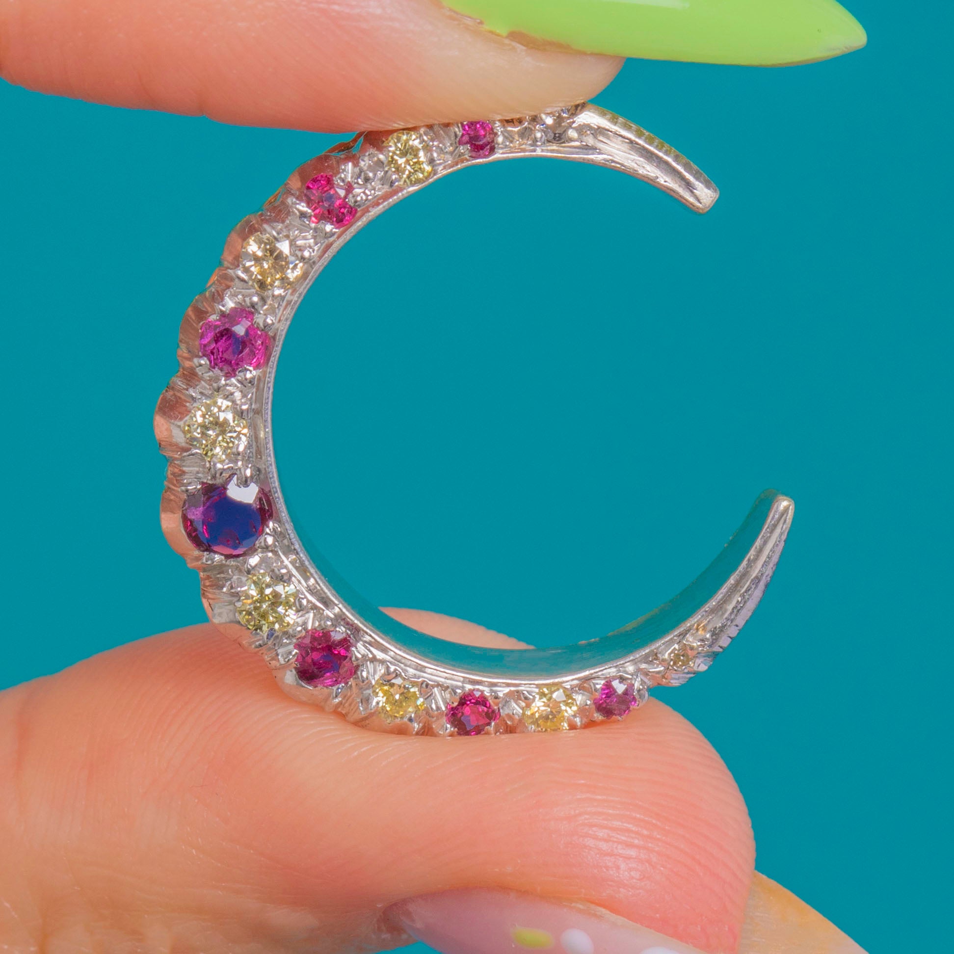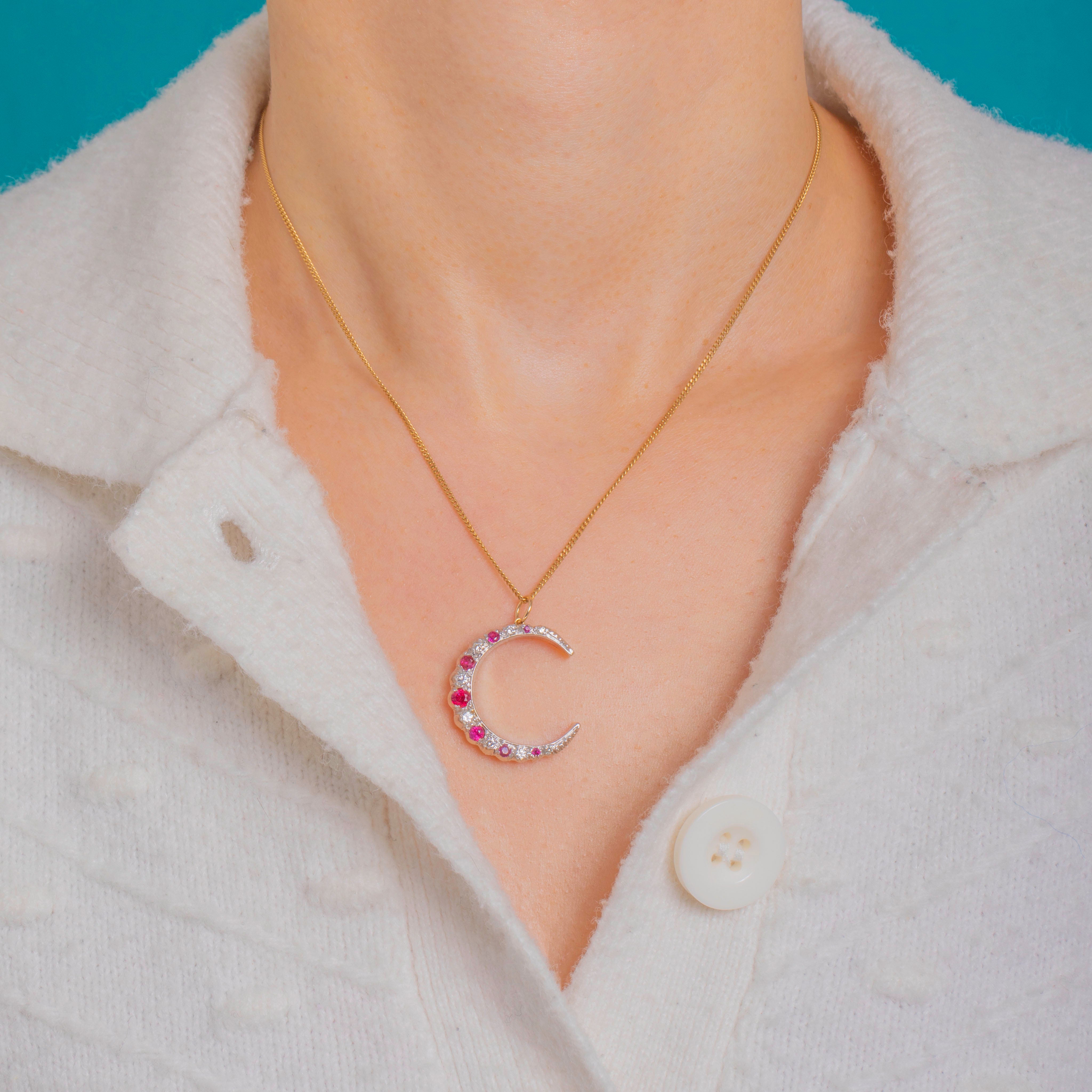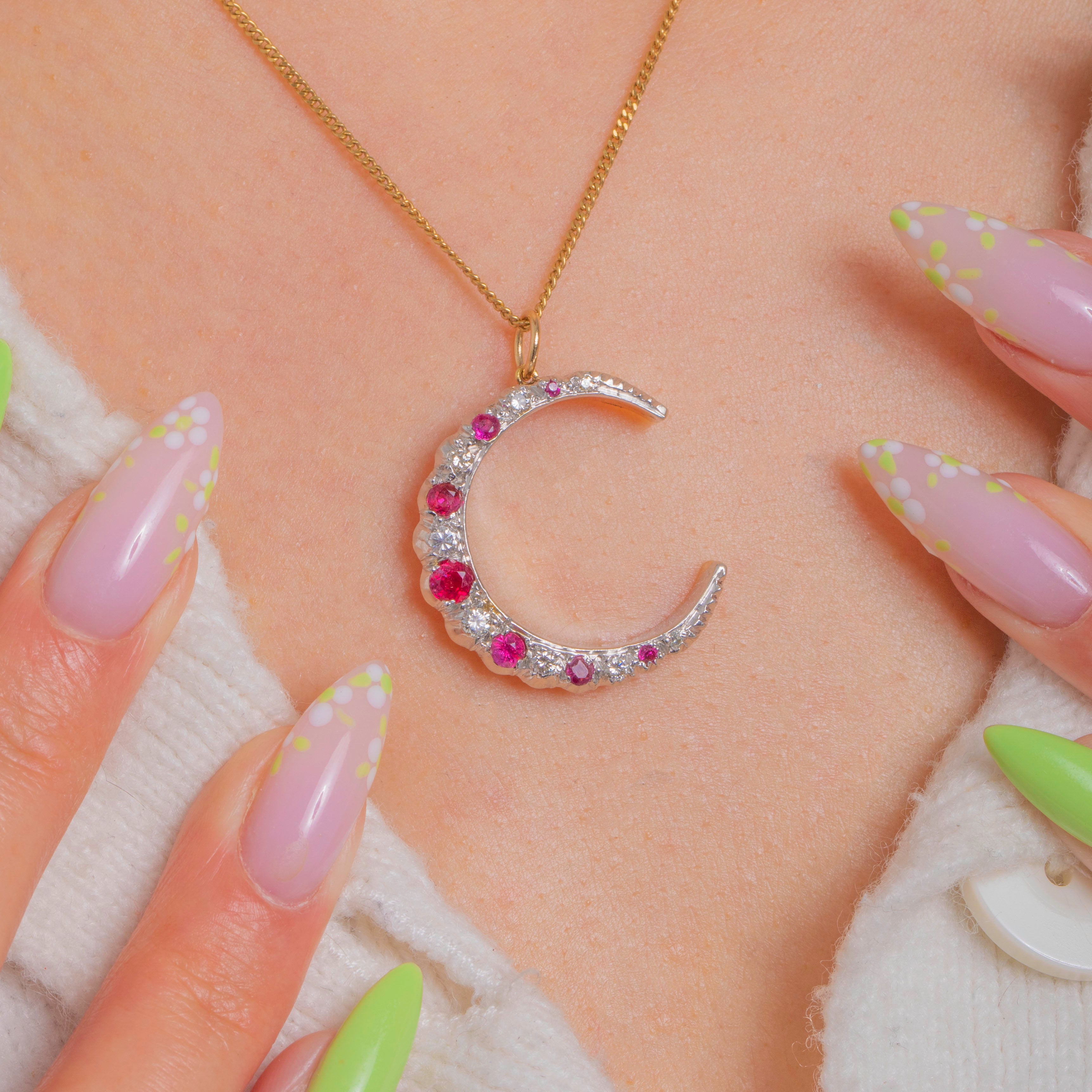 Ein himmlischer Klassiker mit raffiniertem Two-Tone-Effekt: Dieser Vintage-Crescent-Mond-Anhänger wurde aus weißem und gelbem 9ct Gold gefertigt und mit einem funkelnden Bogen aus Rubinen und Diamanten besetzt. Die Edelsteine verlaufen in harmonischem Größenverlauf entlang der Kurve; das leuchtende Pinkrot der Rubine kontrastiert elegant mit dem klaren Glanz der Diamanten und verleiht dem Schmuckstück eine zarte, romantische und edle Ausstrahlung.