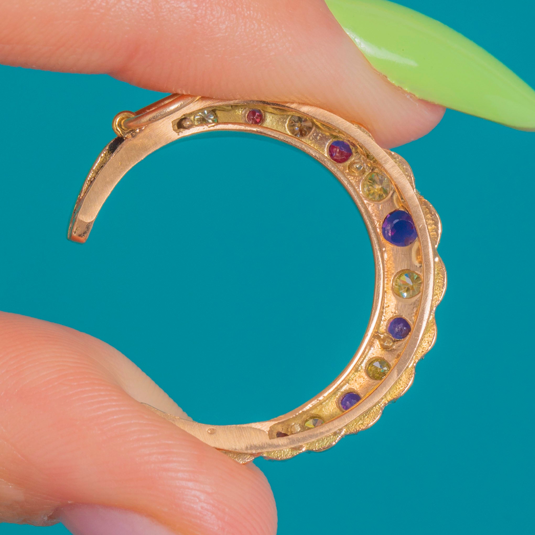 SEHR GUT: Strahlende, lebendige Edelsteine mit minimalen Gebrauchsspuren und keinen mit bloßem Auge sichtbaren Absplitterungen; Diamanten zeigen einen leicht warmen/gelblichen Ton. Sichel und Fassungen sind sicher, mit altersgemäßen leichten Oberflächenkratzern.