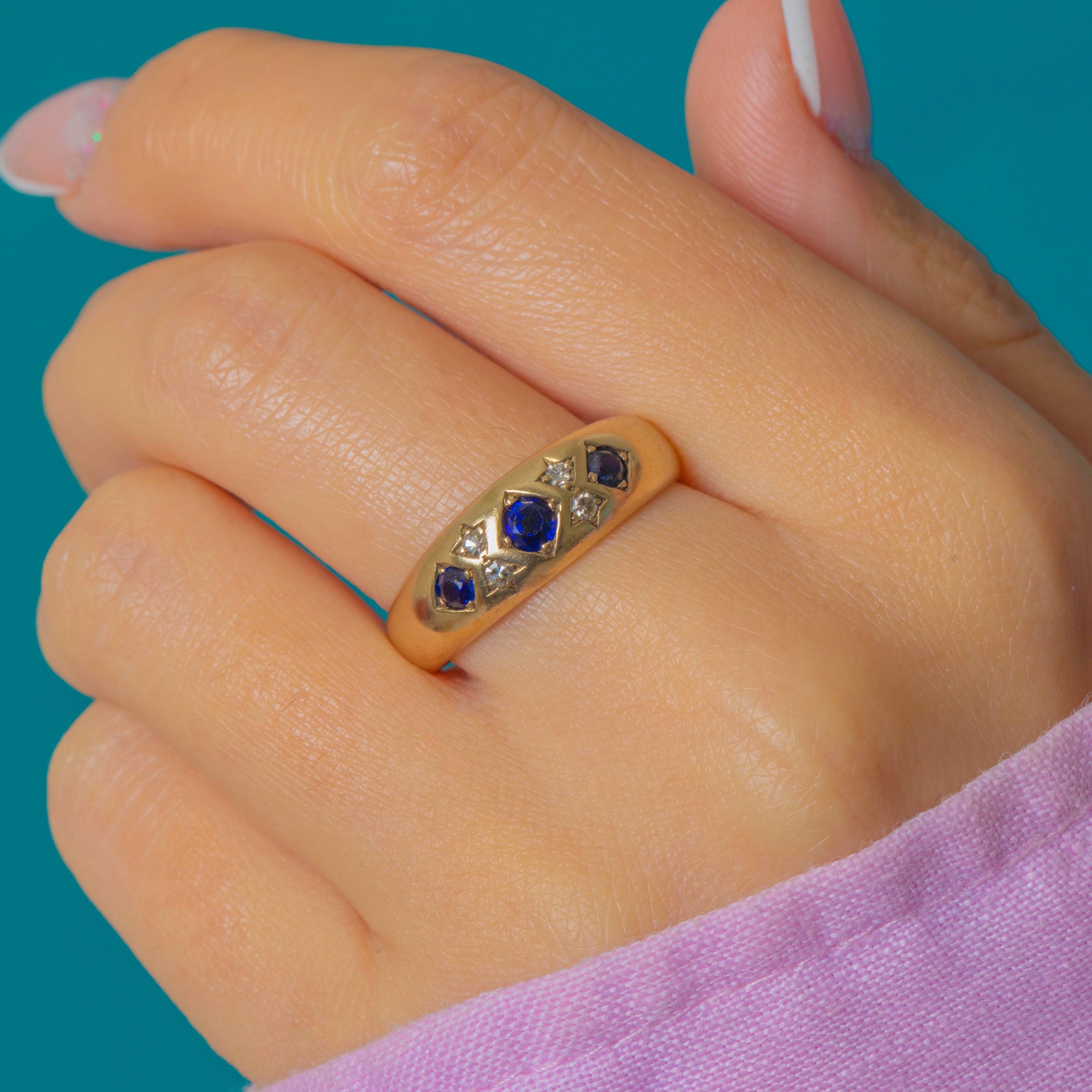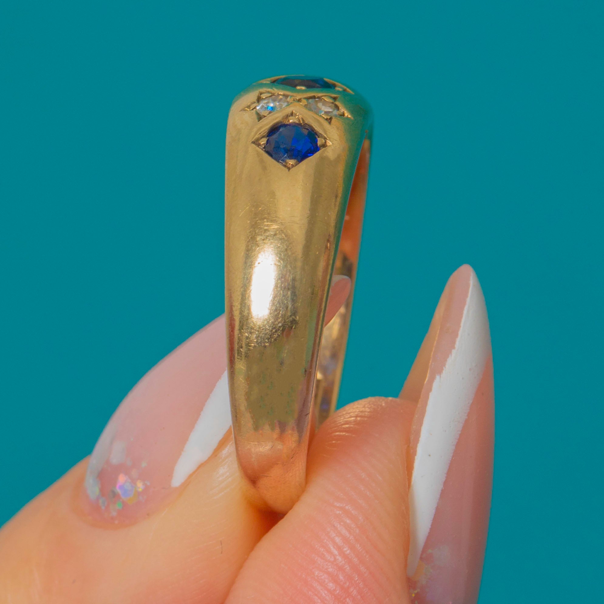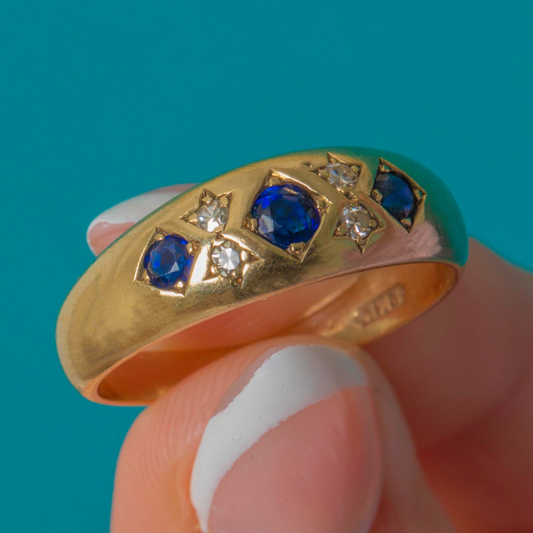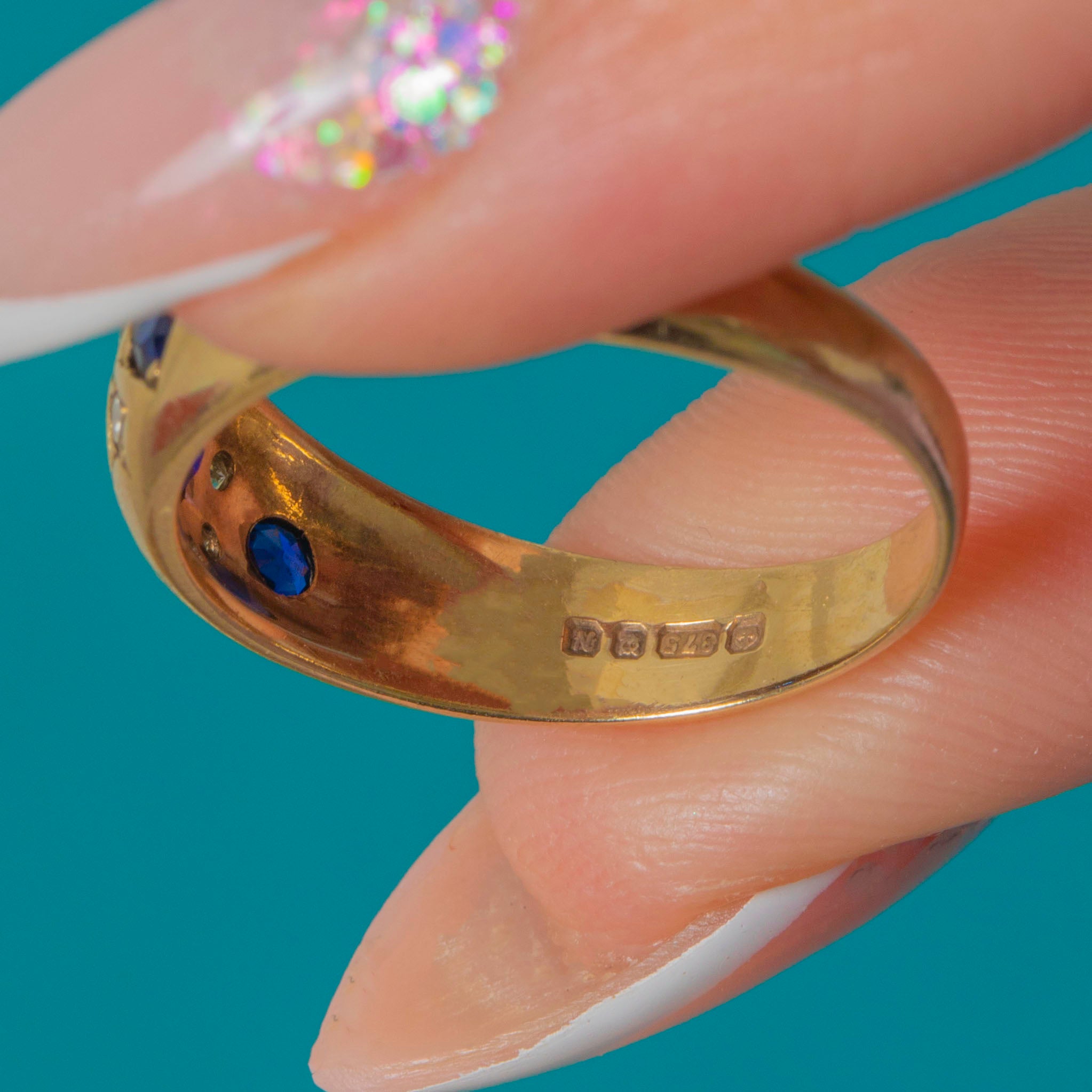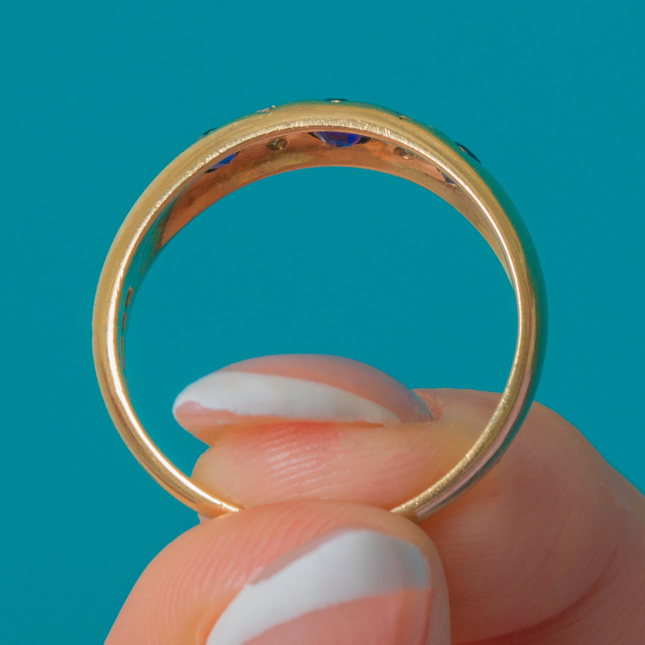 Dieser Vintage-Saphir- und Diamantring ist das perfekte, elegante und schlanke Stapelstück, gefertigt aus warmem 9ct Gold. Die natürlichen blauen Saphire und strahlenden Diamanten sind sorgfältig über das Band gefasst und verleihen einen dezenten Glanz sowie eine raffinierte, zurückhaltende Ausstrahlung.