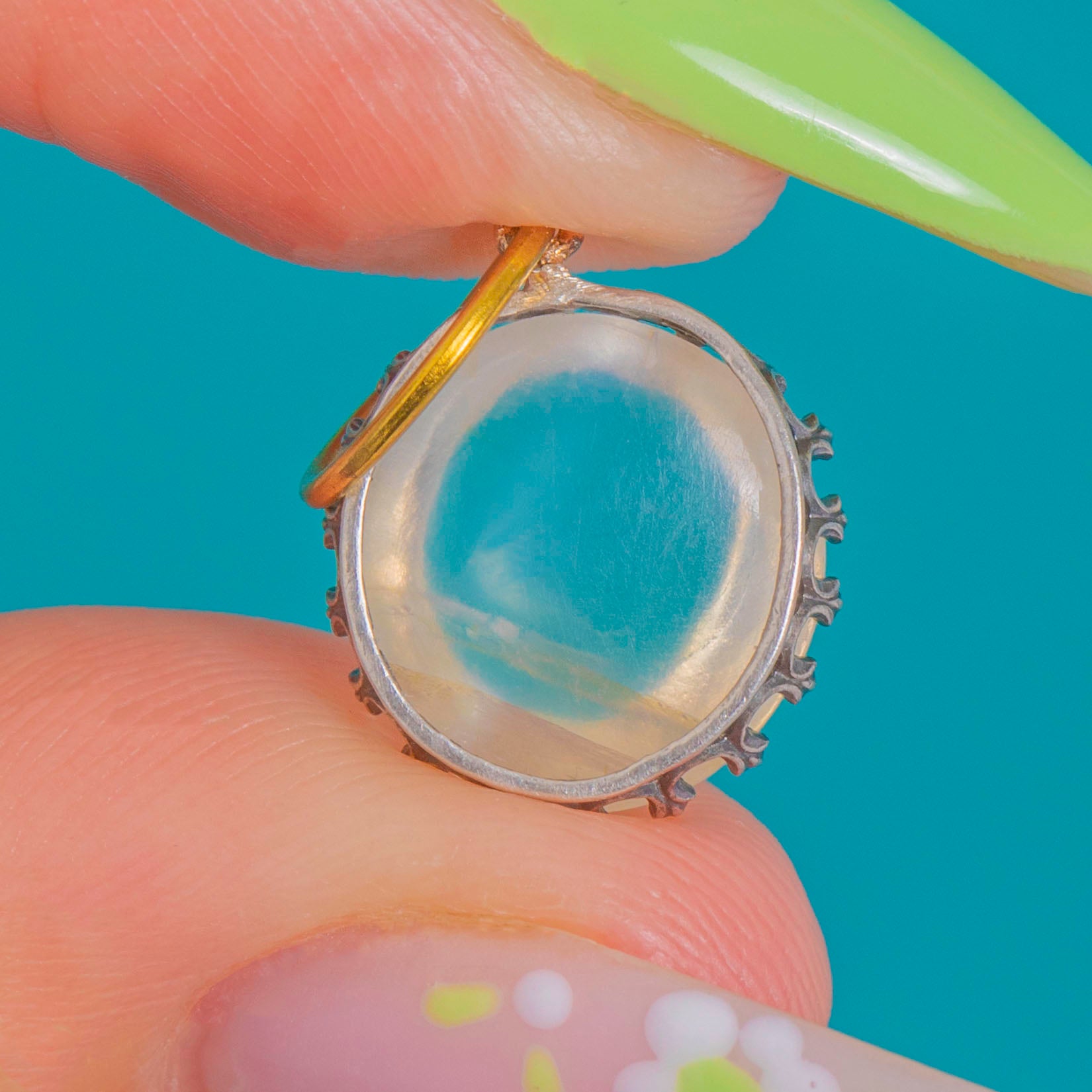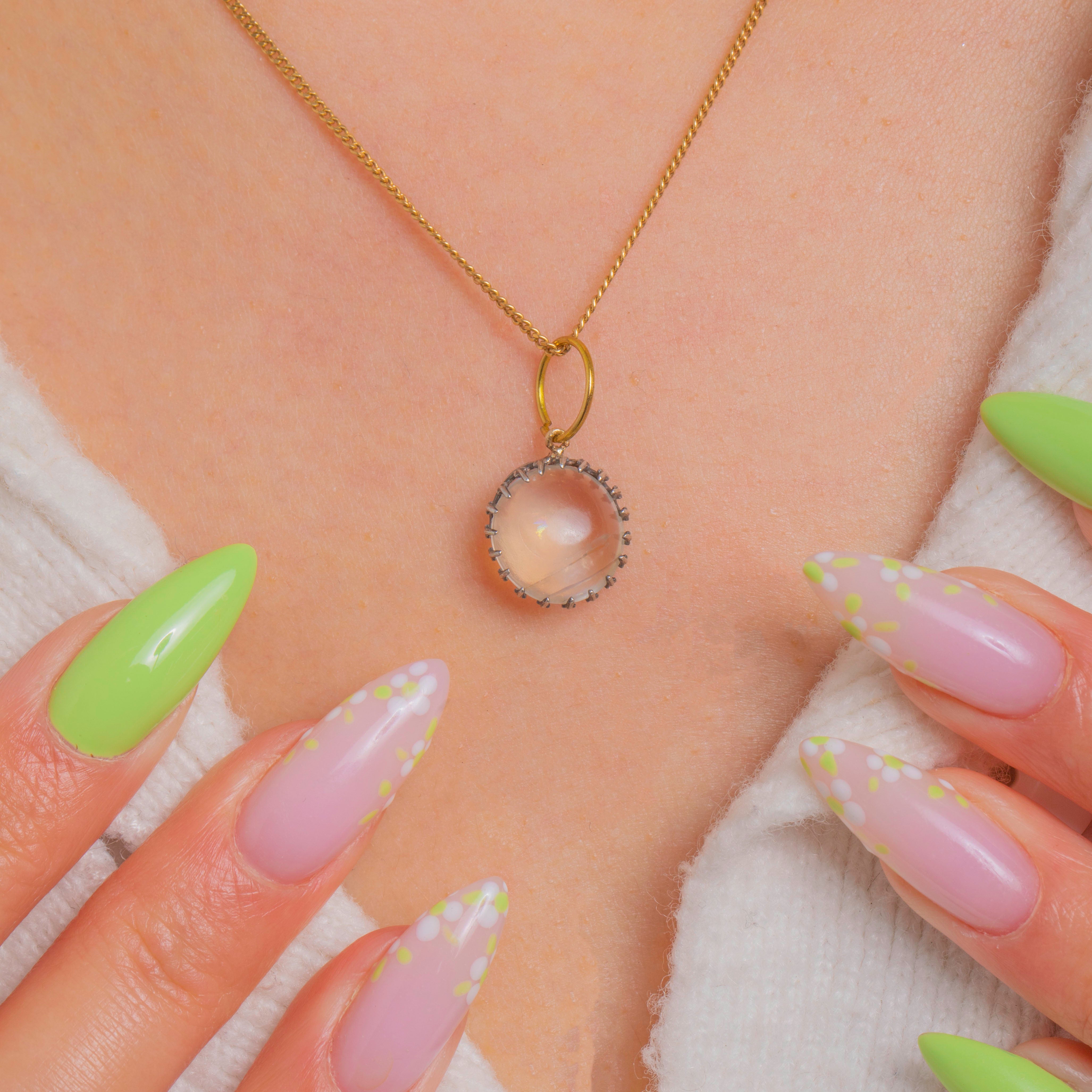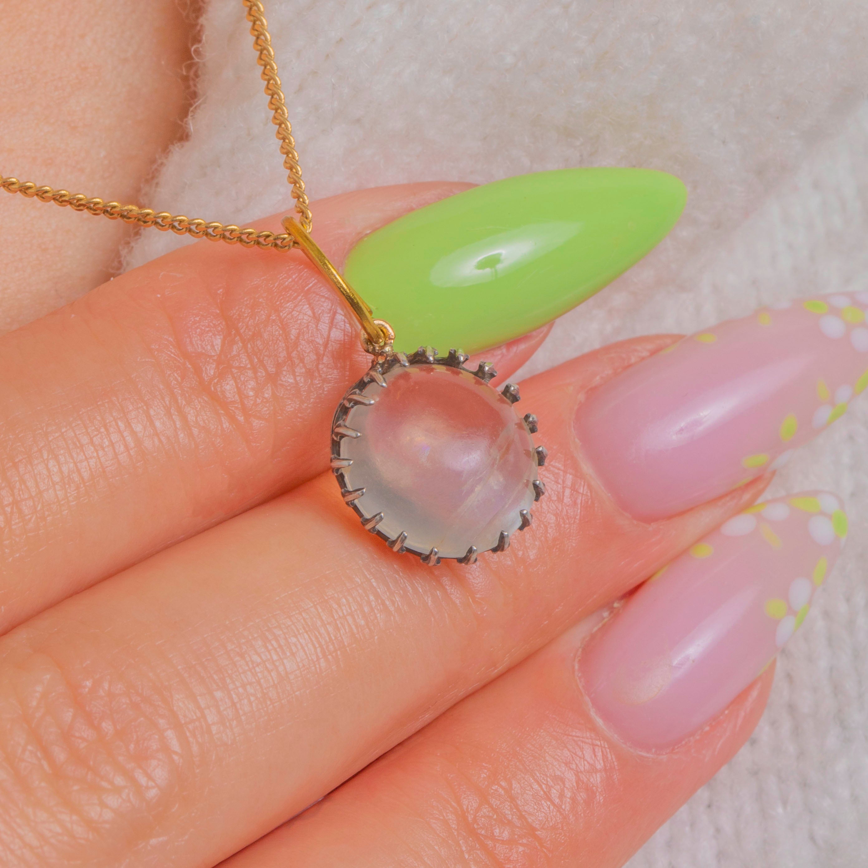 Ein zarter Edwardian Mondstein-Anhänger, gekrönt von kühlem Silber und vollendet mit einem warmen 9ct Gold-Bindering. Der hochgewölbte Cabochon schimmert mit ätherischer Adulareszenz und entfaltet bei Bewegung sanfte blaue und perlmuttartige Nuancen.