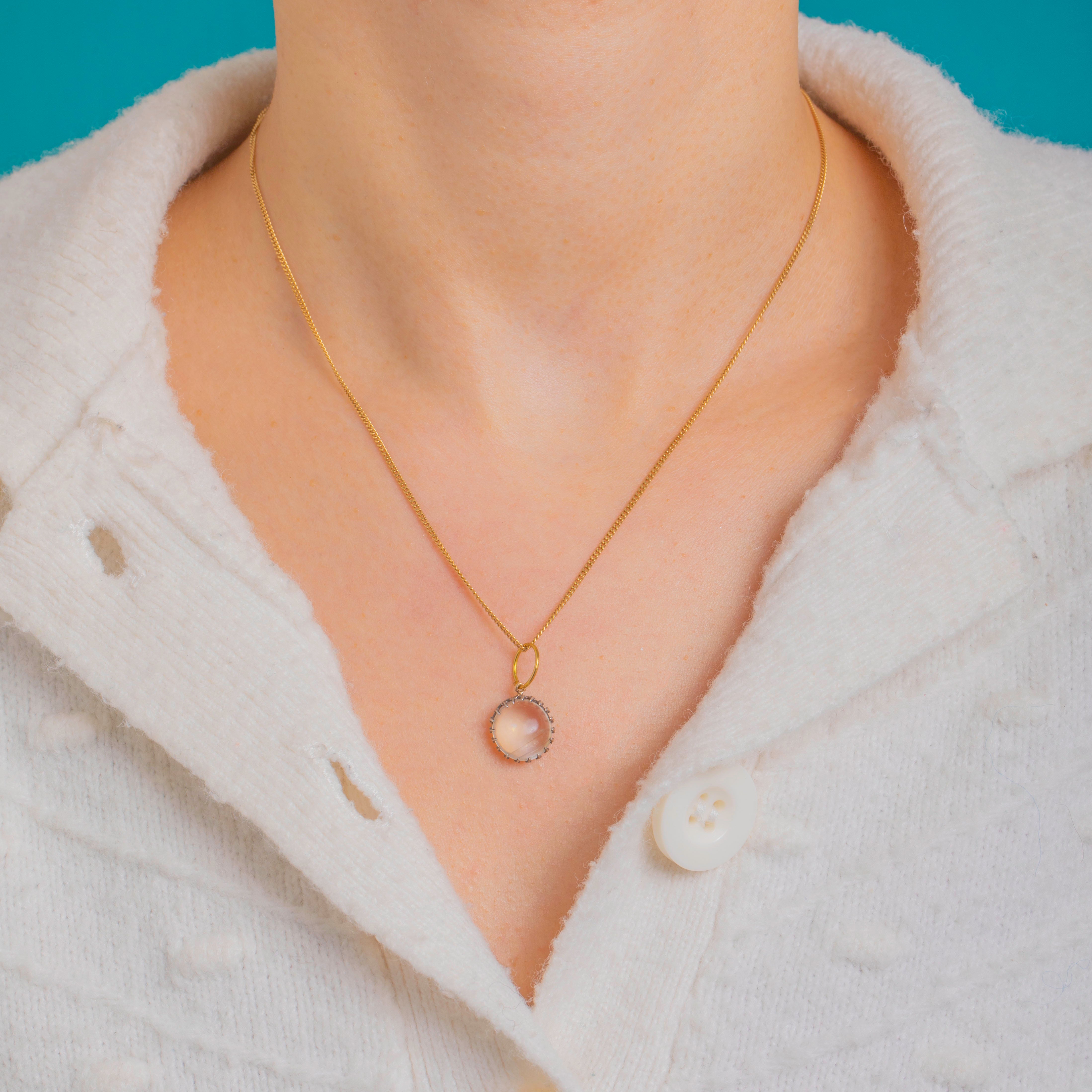 Die gewellte, kronenförmige Fassung verleiht diesem feinen Schmuckstück einen romantischen, antiken Charakter, während der Kontrast der Metalle eine elegante Note setzt. Mit 3,40 Karat bringt das Leuchten des Mondsteins einen dezenten, edlen Akzent an Ihre Lieblingskette.
