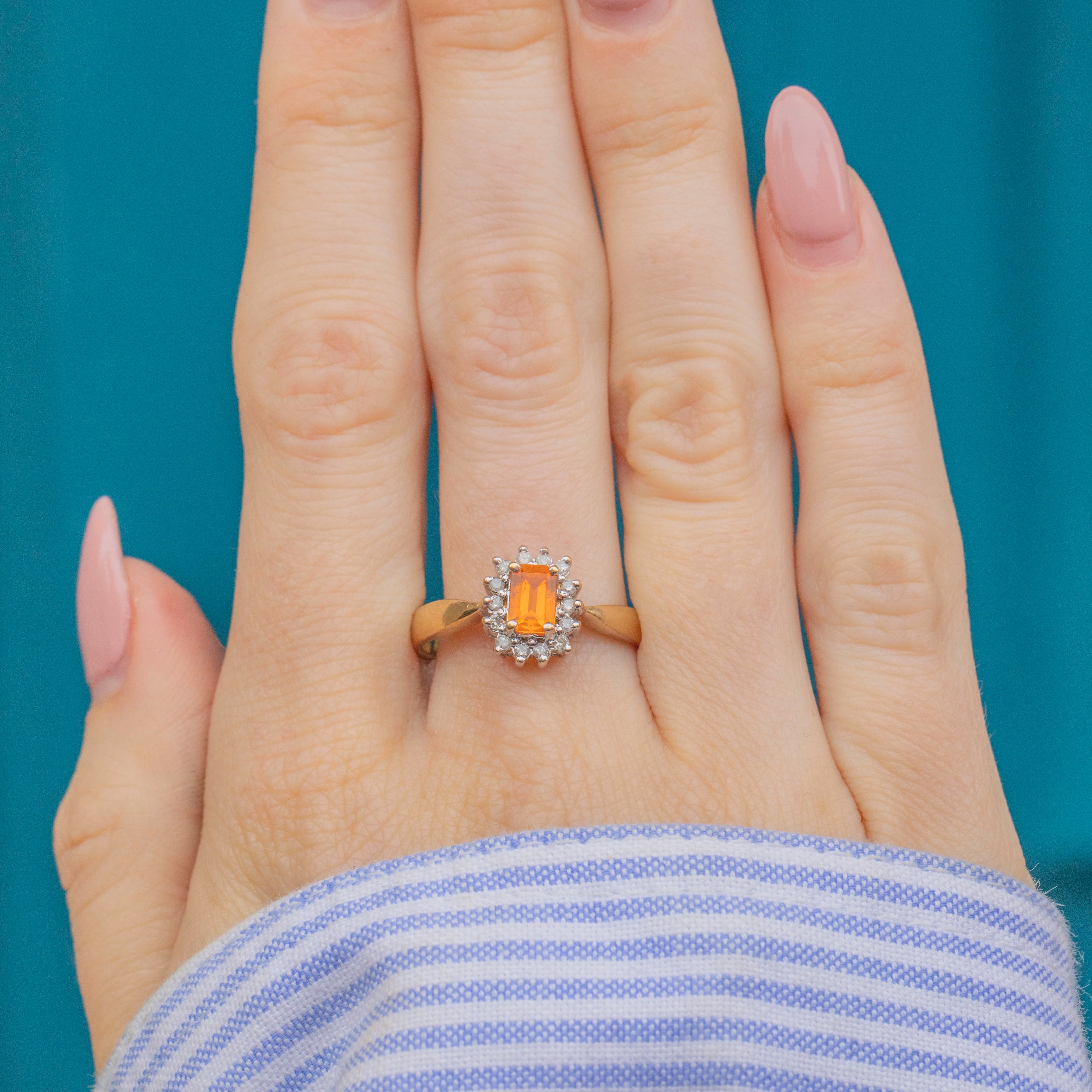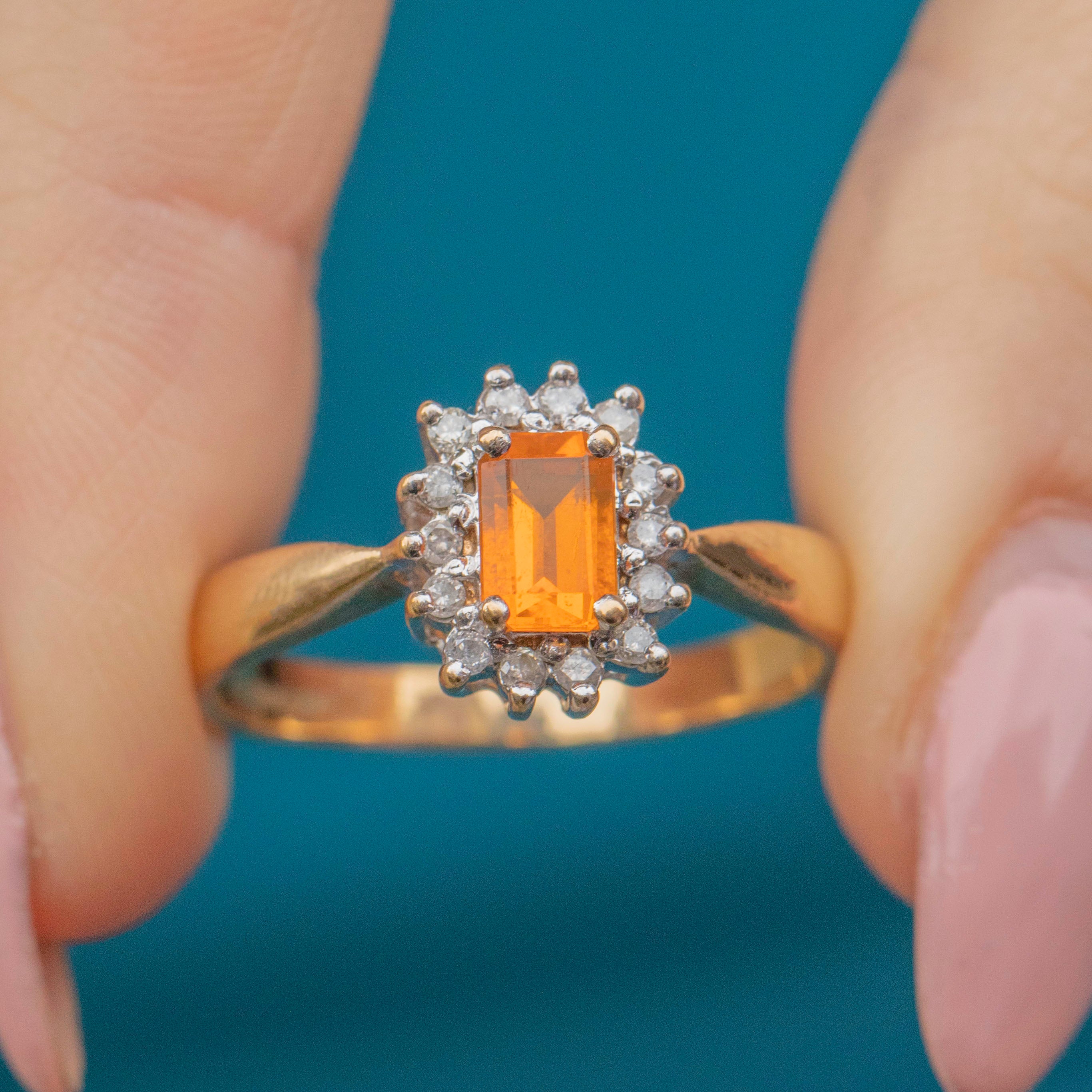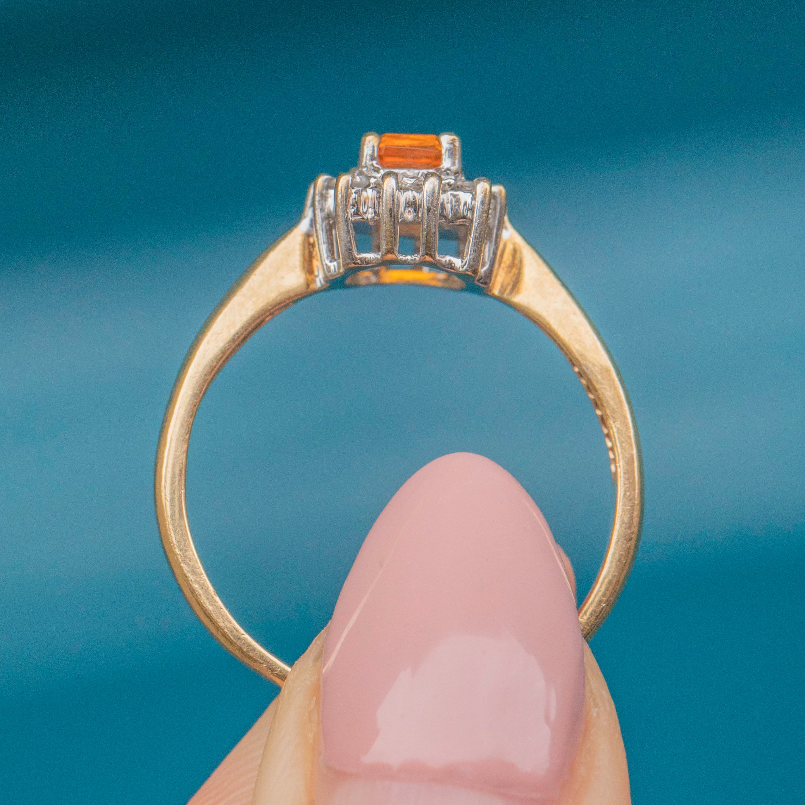 This 9ct Gold Spessartine Garnet Diamond cluster ring is the perfect way to incorporate a pop of colour into your collection, with its fiery Spessartine Garnet at its centre!