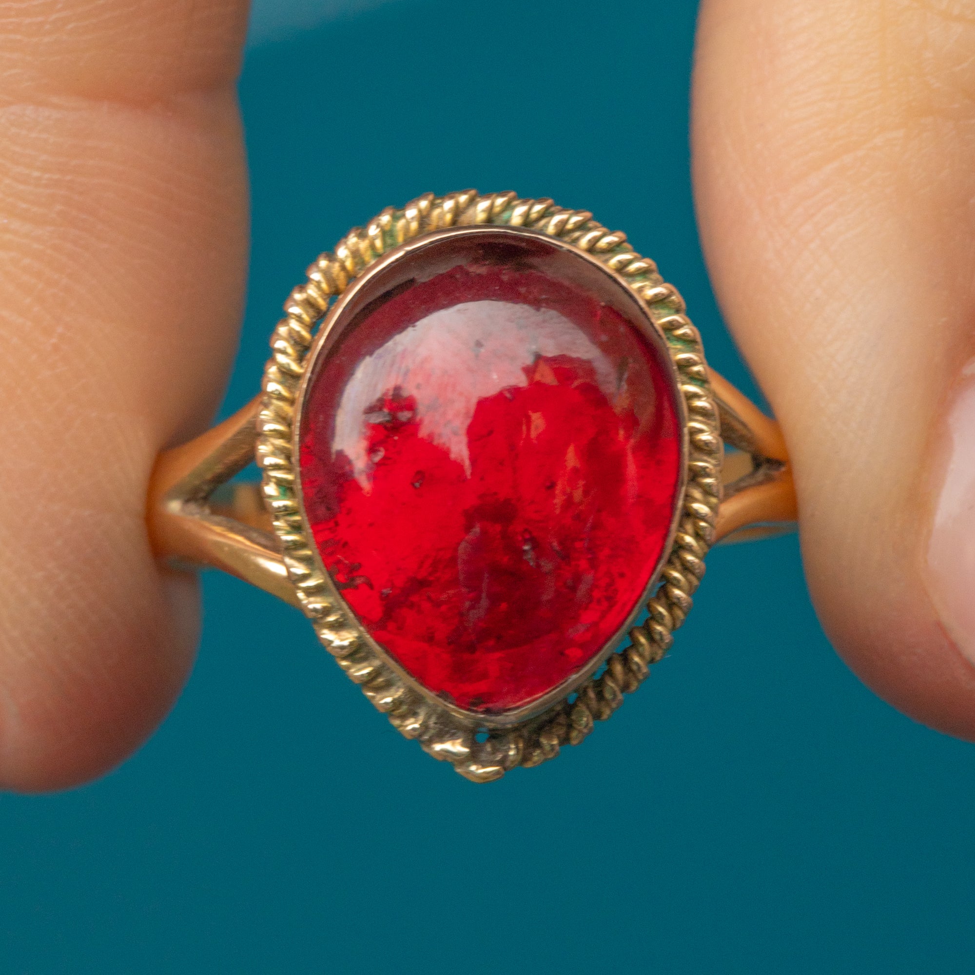 VERY GOOD. This 9ct Gold Victorian Garnet cabochon pear ring is in very good condition throughout. The large Garnet is truly mesmerising with only minor age-related surface wear, noticeable under close inspection, and has remained securely held within its bezel. The Gold has an even buttery hue and the rope border is firmly affixed with no wear to note. This piece has likely had a new shank added and there is some evidence of this on the back of the setting, but this ring sits comfortably and smooth against the skin. If you're a lover of outstanding pieces of Victorian jewellery, don't hesitate to make this sumptuous ring yours!