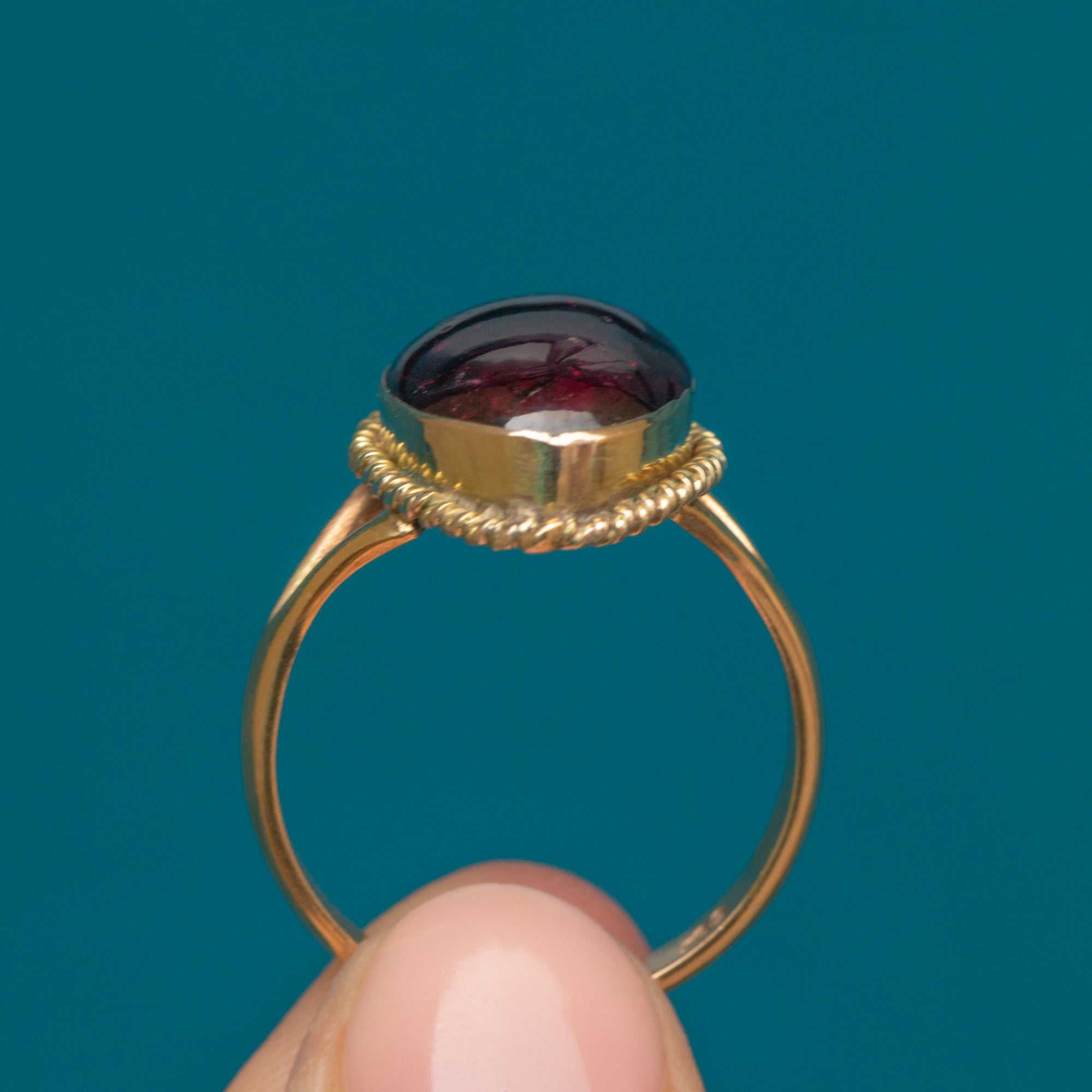 Wrapped up in buttery 9ct Gold, the smoothly cut Garnet cabochon is displayed proudly within a decorative rope border. With elegant tapered split shoulders and excellent finger coverage, this outstanding piece of history will bring Victorian gothic glamour to your repertoire!