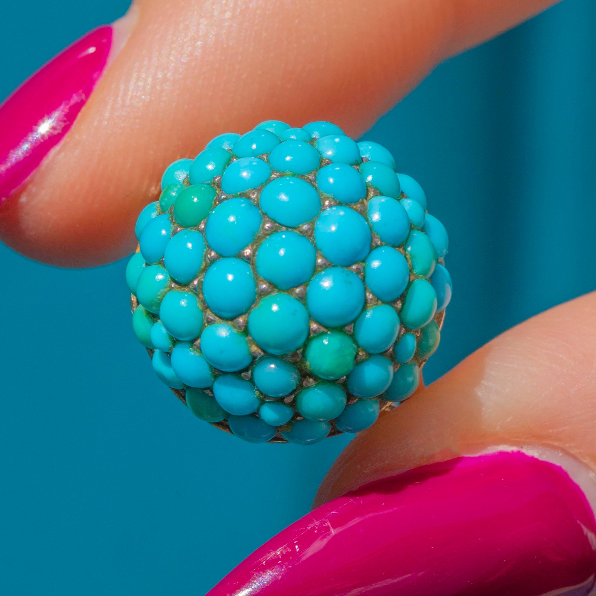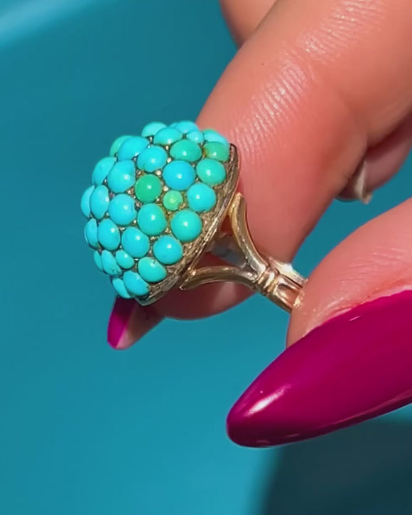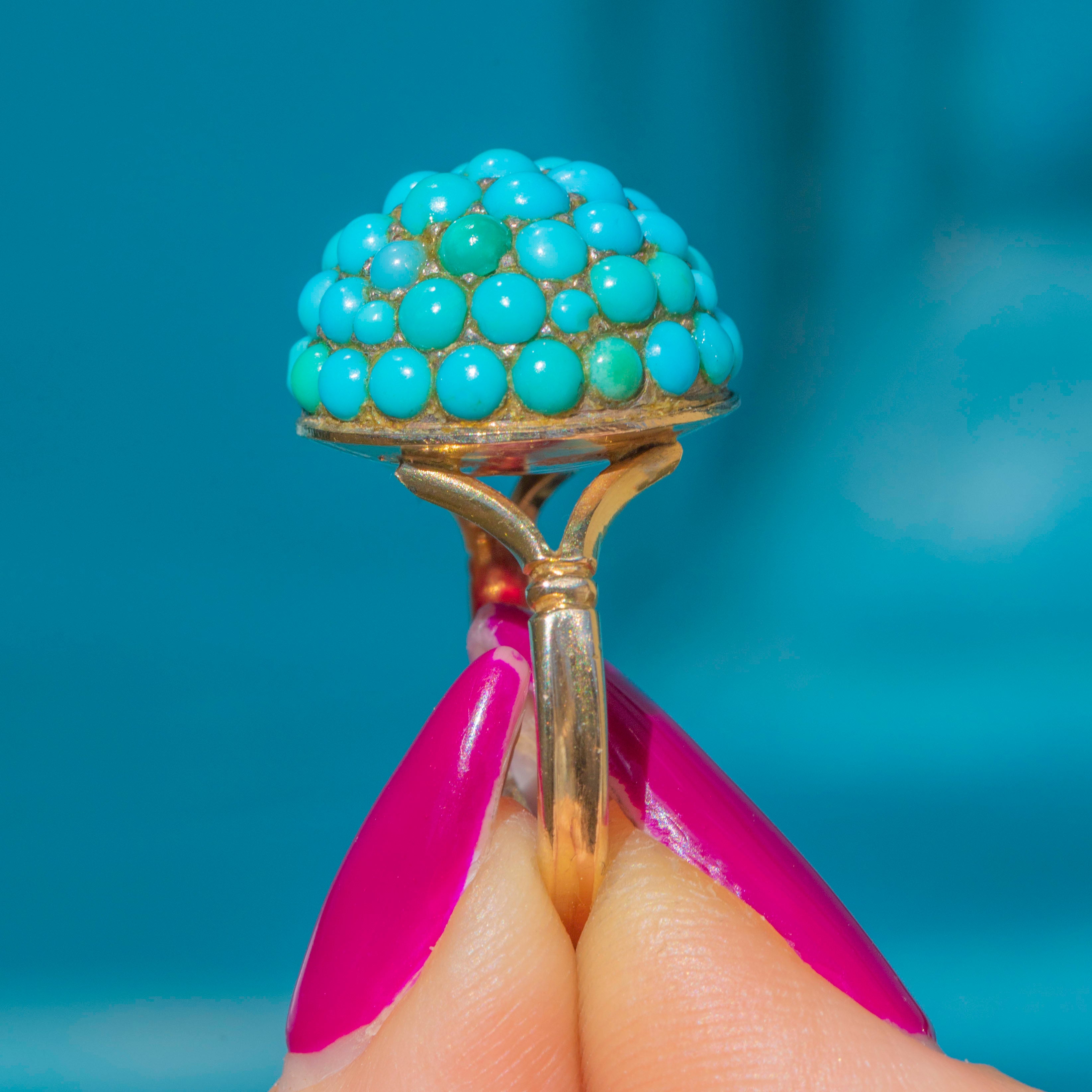 This antique Turquoise bombe ring is a tantalising treat! The curvaceous ring face is completely covered in dainty pavé-set Turquoise cabochons, their varying blue and green hues combining to create a visually striking effect.
