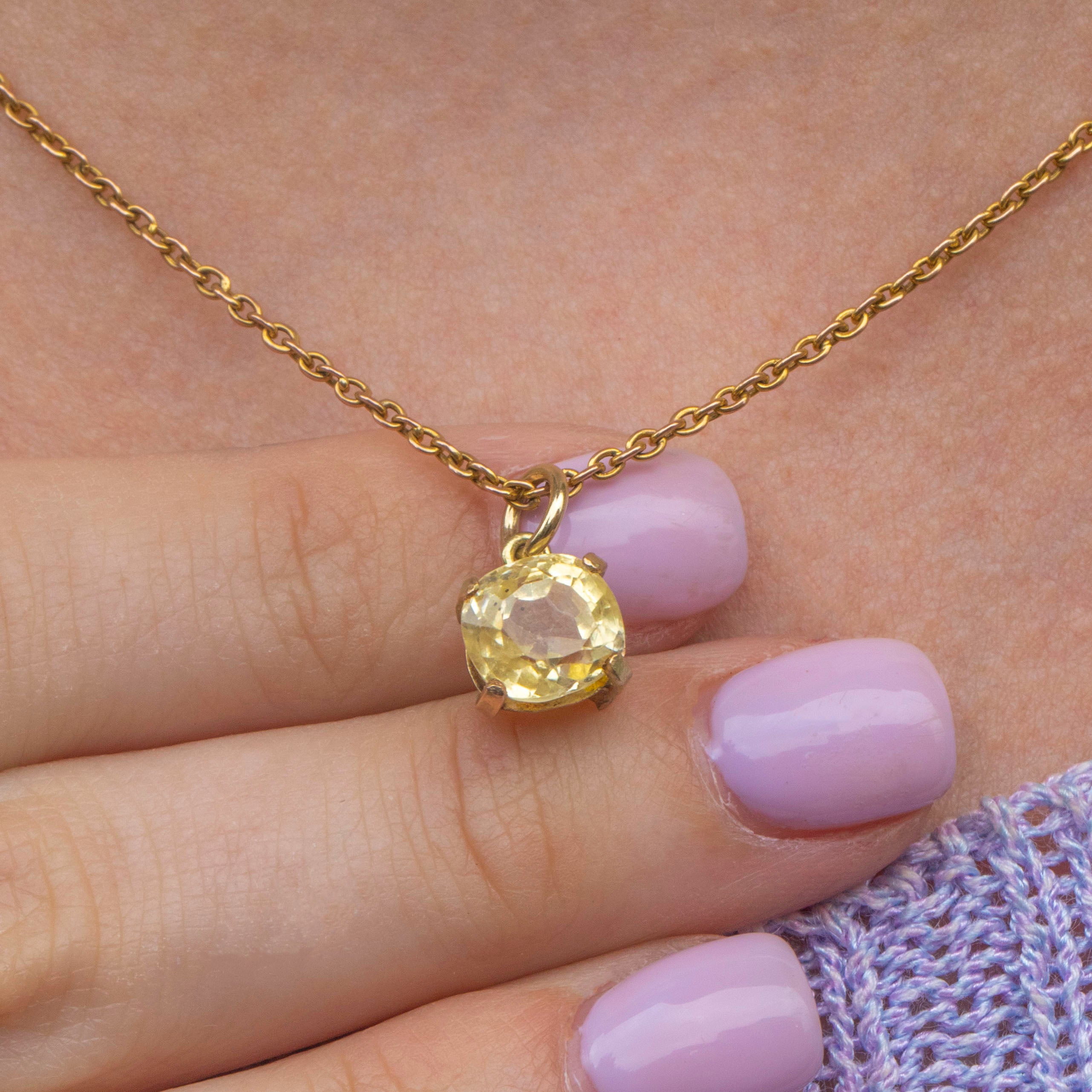 VERY GOOD. This 9ct Gold yellow Sapphire round charm features a yellow Sapphire set securely in claw settings, with no damage to note apart from a very small chip on the edge of the stone.. There are a few black dot inclusions at the centre of the Sapphire but this is a true ode to Mother Nature. With a jump-ring to finish, she can be suspended from a chain of your choice!