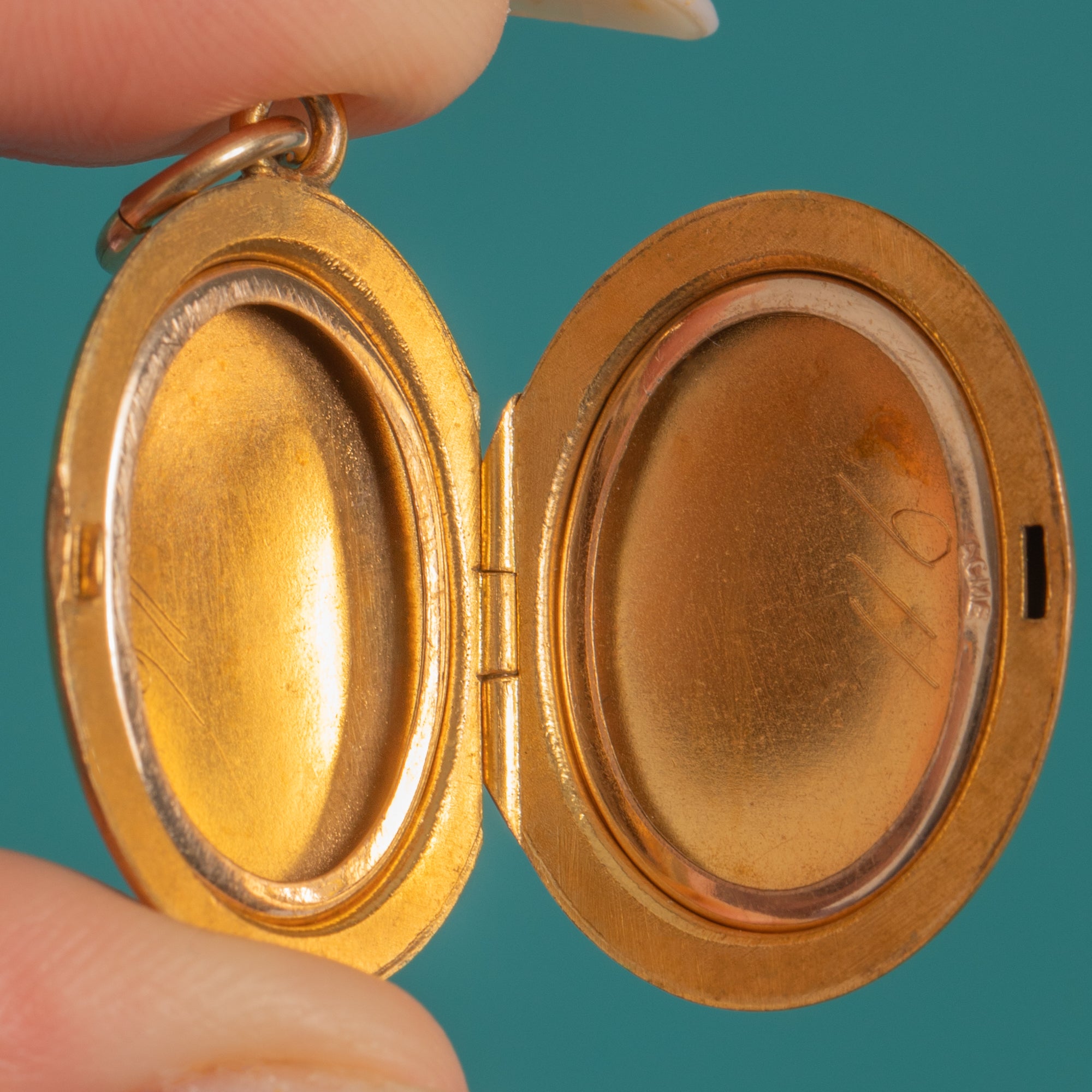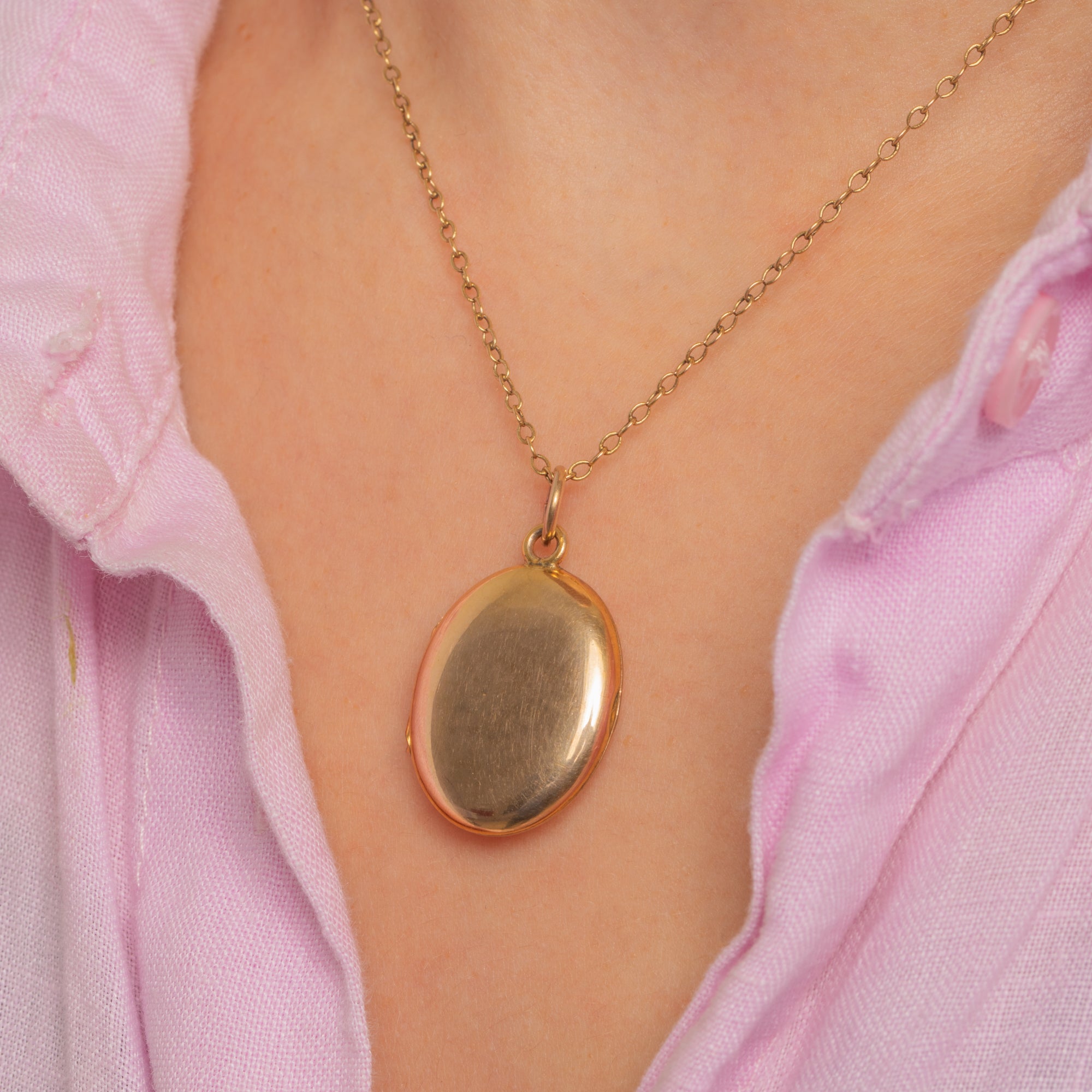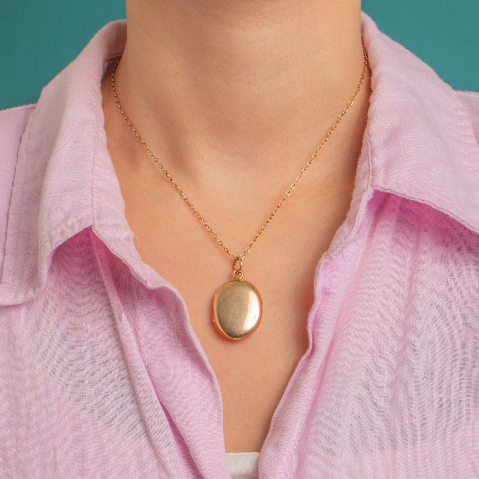 Opening on a tidy side hinge with a satisfying snap closure, the locket reveals two oval photo compartments with rolled retaining rims ready to hold your most cherished memories. A fixed hasp and jump ring bail make it easy to slip onto your favourite chain. The surface shows a gentle, even patina with light wear consistent with age—just the right amount of character for a true antique staple.