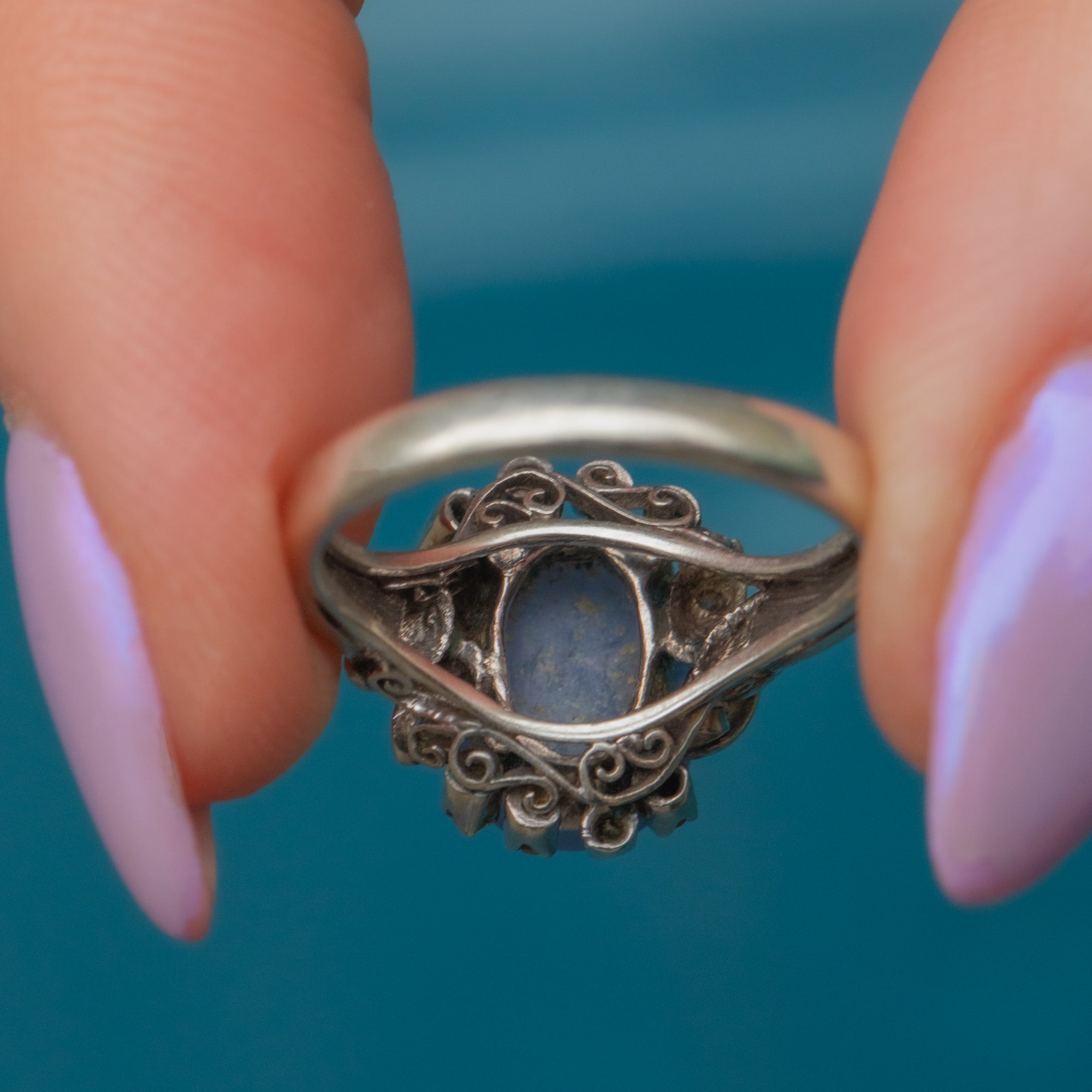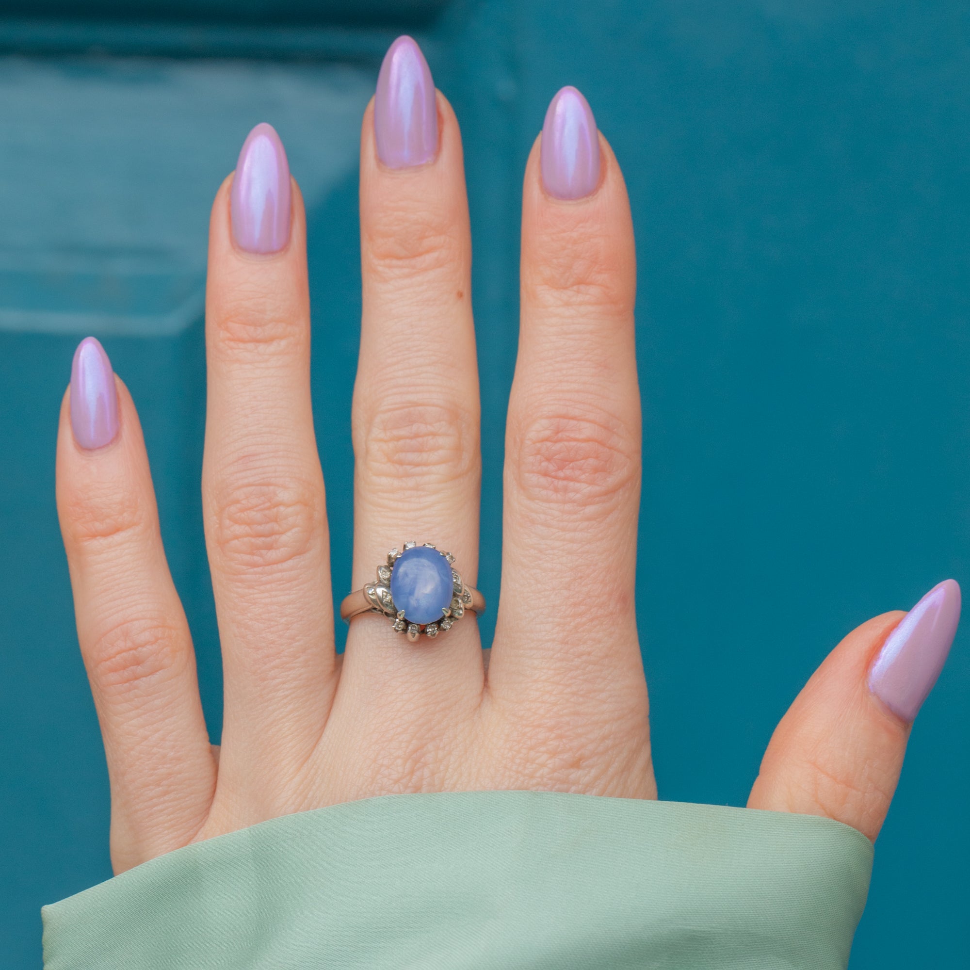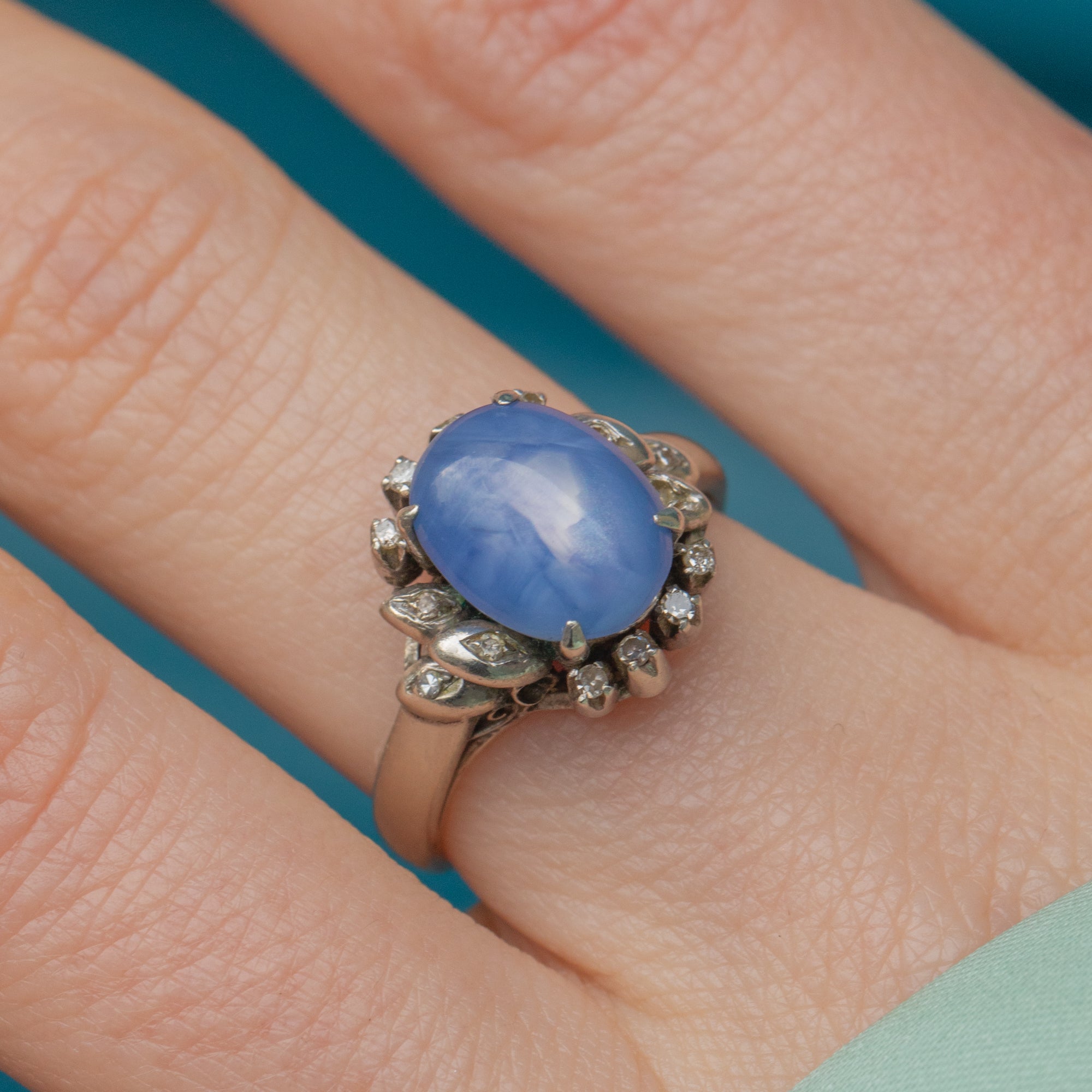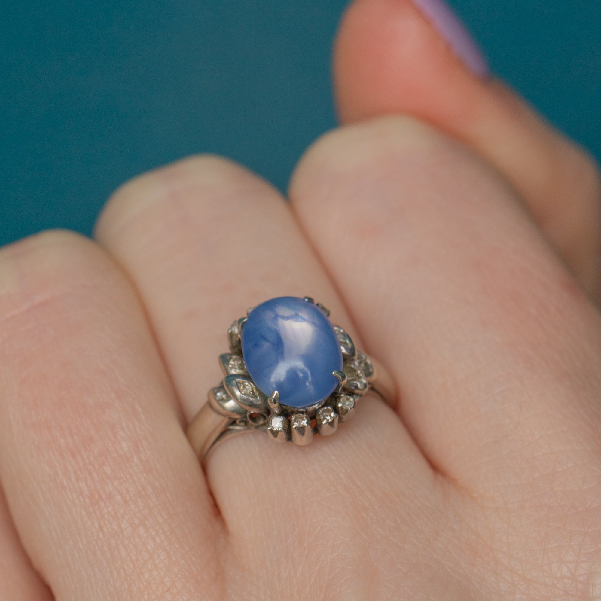 The smoothly domed Star Sapphire is haloed by 0.21cts of twinkling Diamonds, set into leaf-like details crafted from bright 9ct White Gold, with ornate wirework decorating the underside of the gallery. With a chunky band giving this mid-century vintage ring a robust feel and the gemstone cluster providing excellent finger coverage, you are guaranteed to make a statement whenever you wear this exceptional piece!