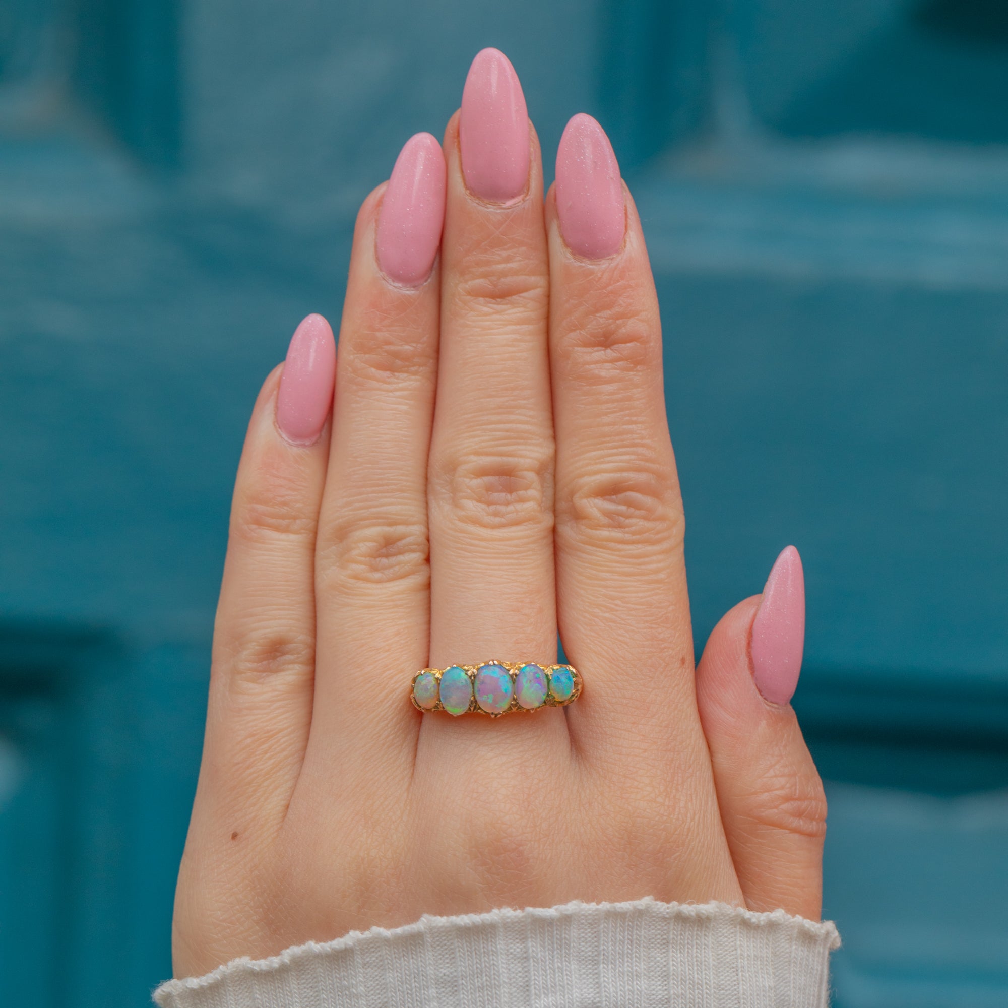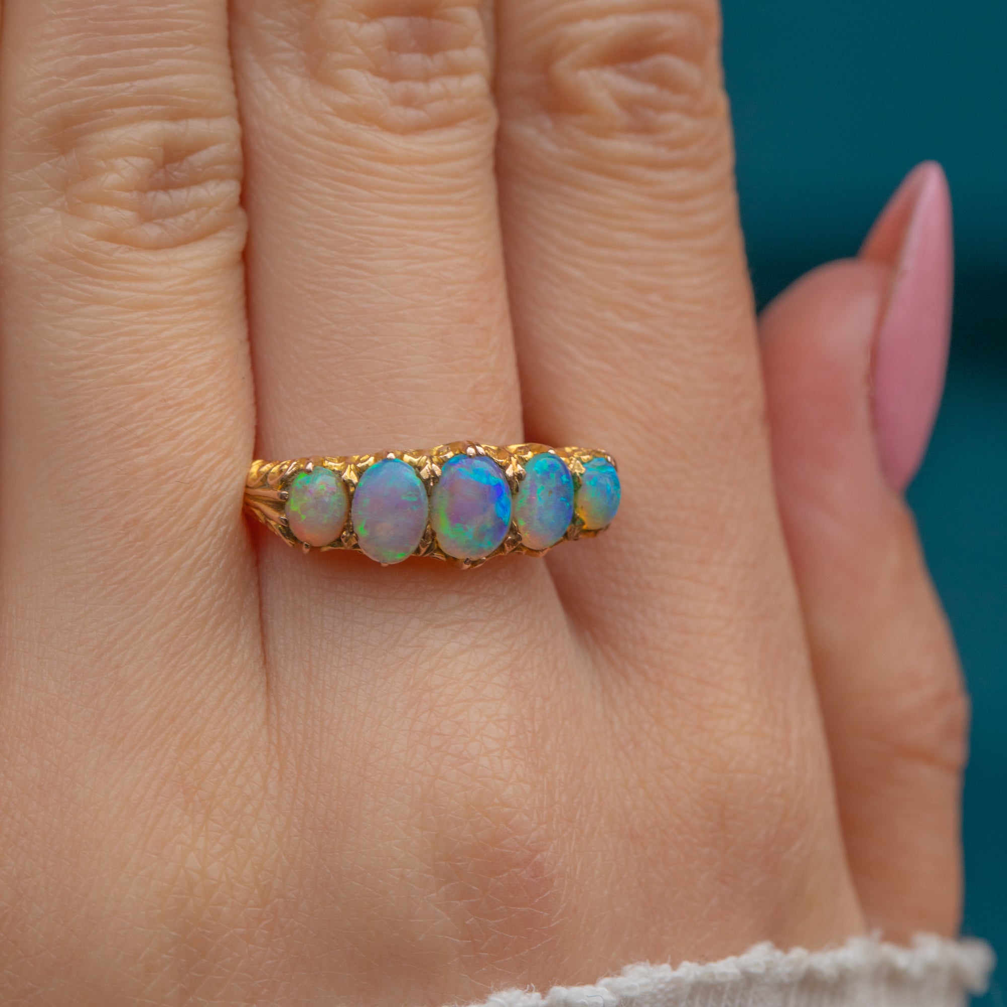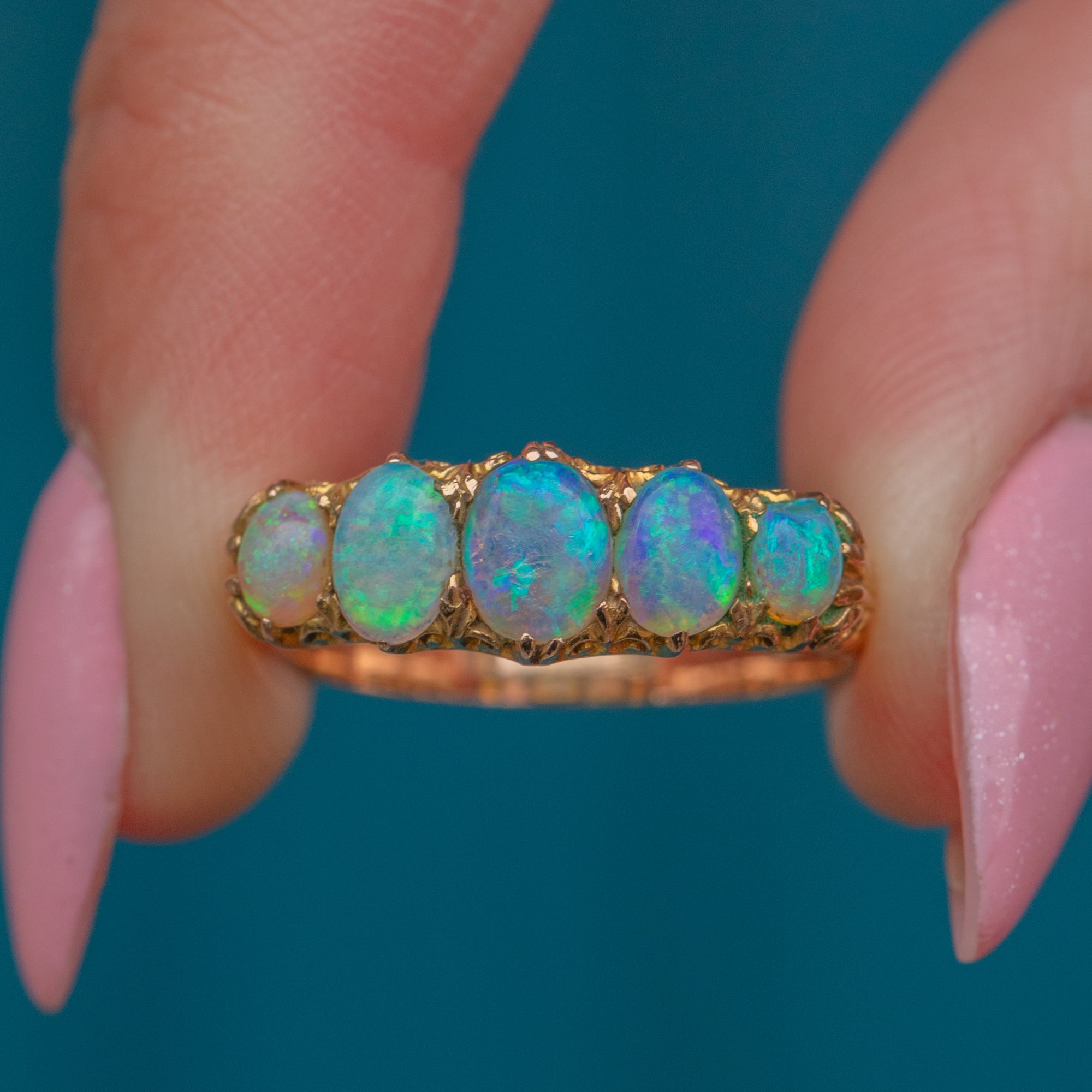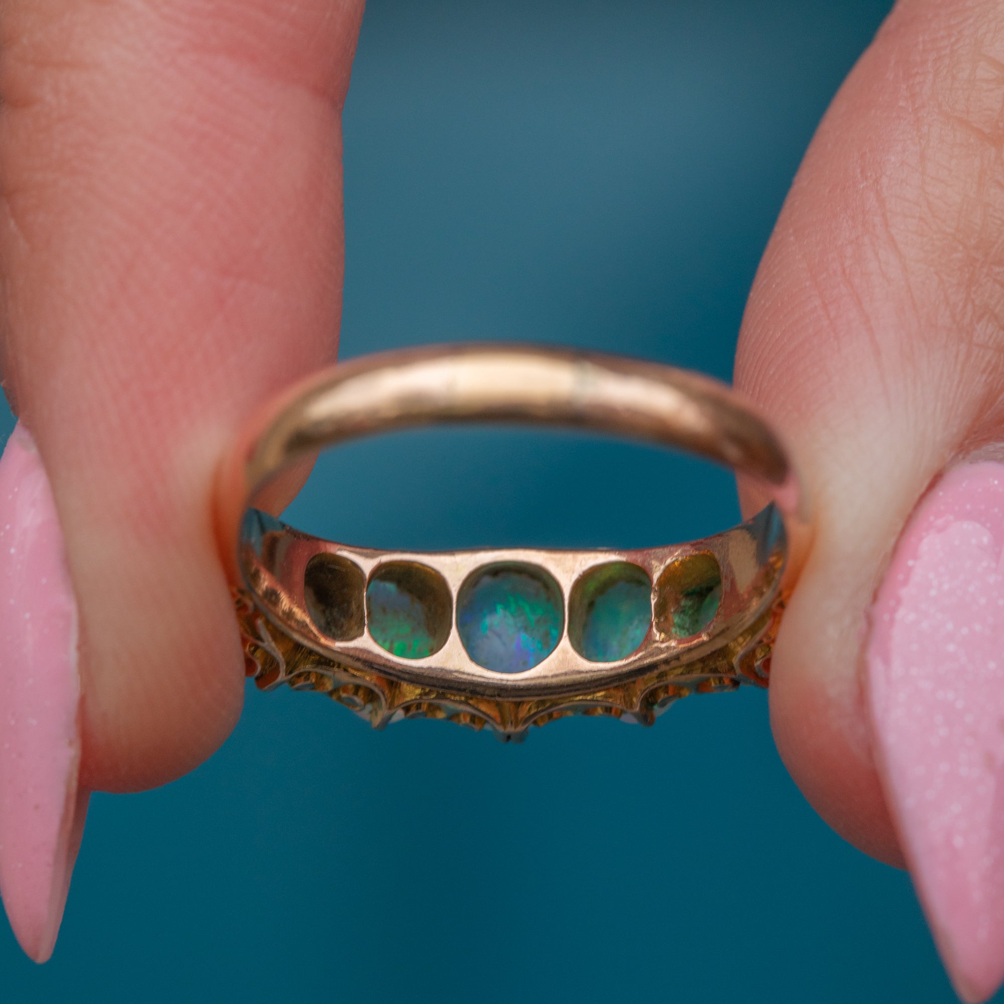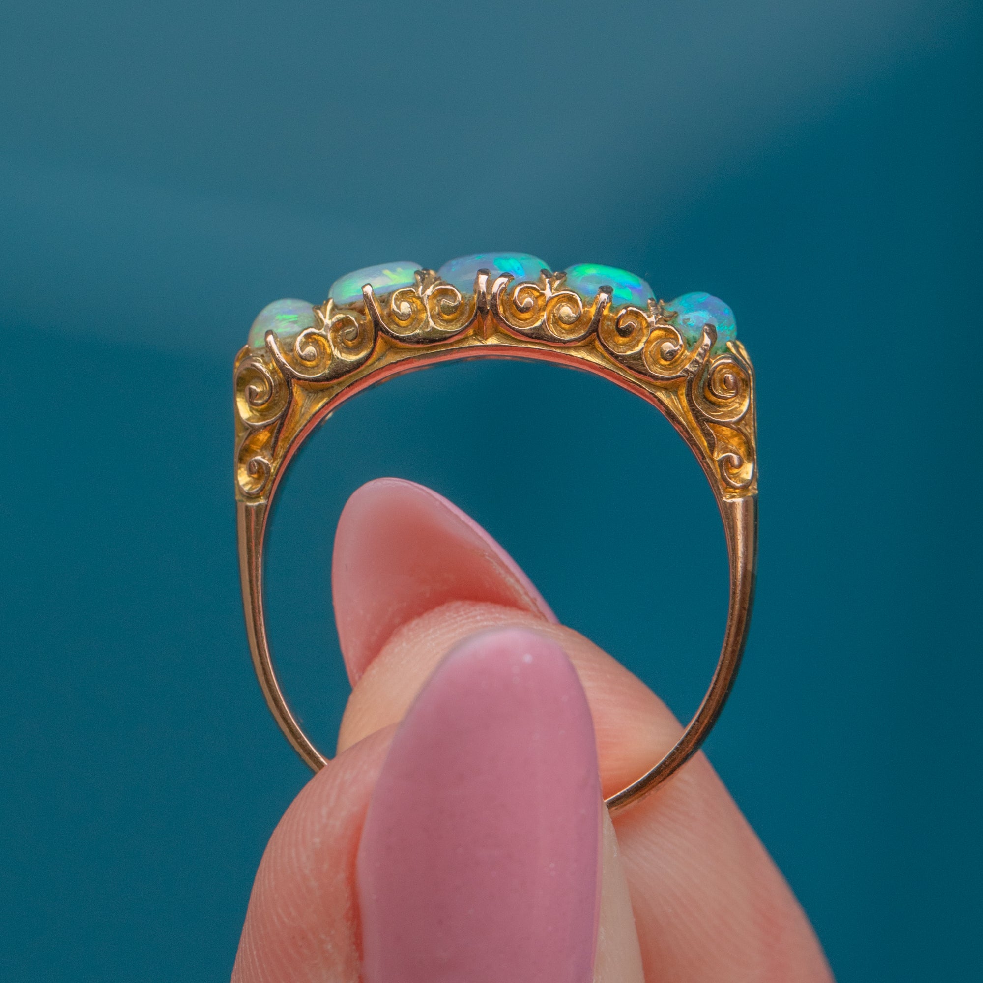 Add a touch of whimsy to your ring stack with this gorgeous antique 14ct Gold Opal five stone ring! Finely crafted from solid 14ct Gold, this Victorian ring boasts five lively Opal cabochons displayed within an ornately formed c-scroll gallery.