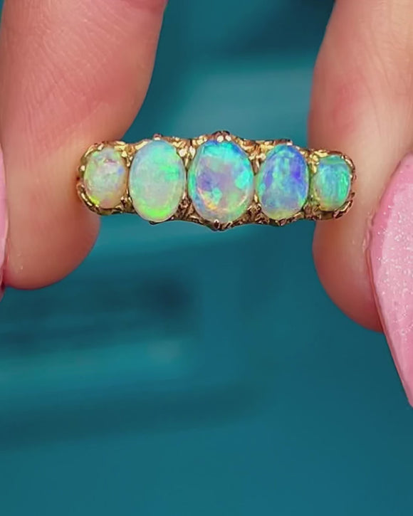 VERY GOOD: This antique 14ct Gold Opal five stone ring is in very good condition. The Opals have a magnificent play of colour and are securely set. One of the small Opals on the side has a minor chip, but this is only noticeable under close inspection. The Gold is bright and buttery and the scrolled gallery is pristine. There is a resize mark on the back of the band, but it remains robust and comfortable to wear. With so much beauty to absorb, don't hesitate to make this phenomenal Victorian Opal ring your newest acquisition!