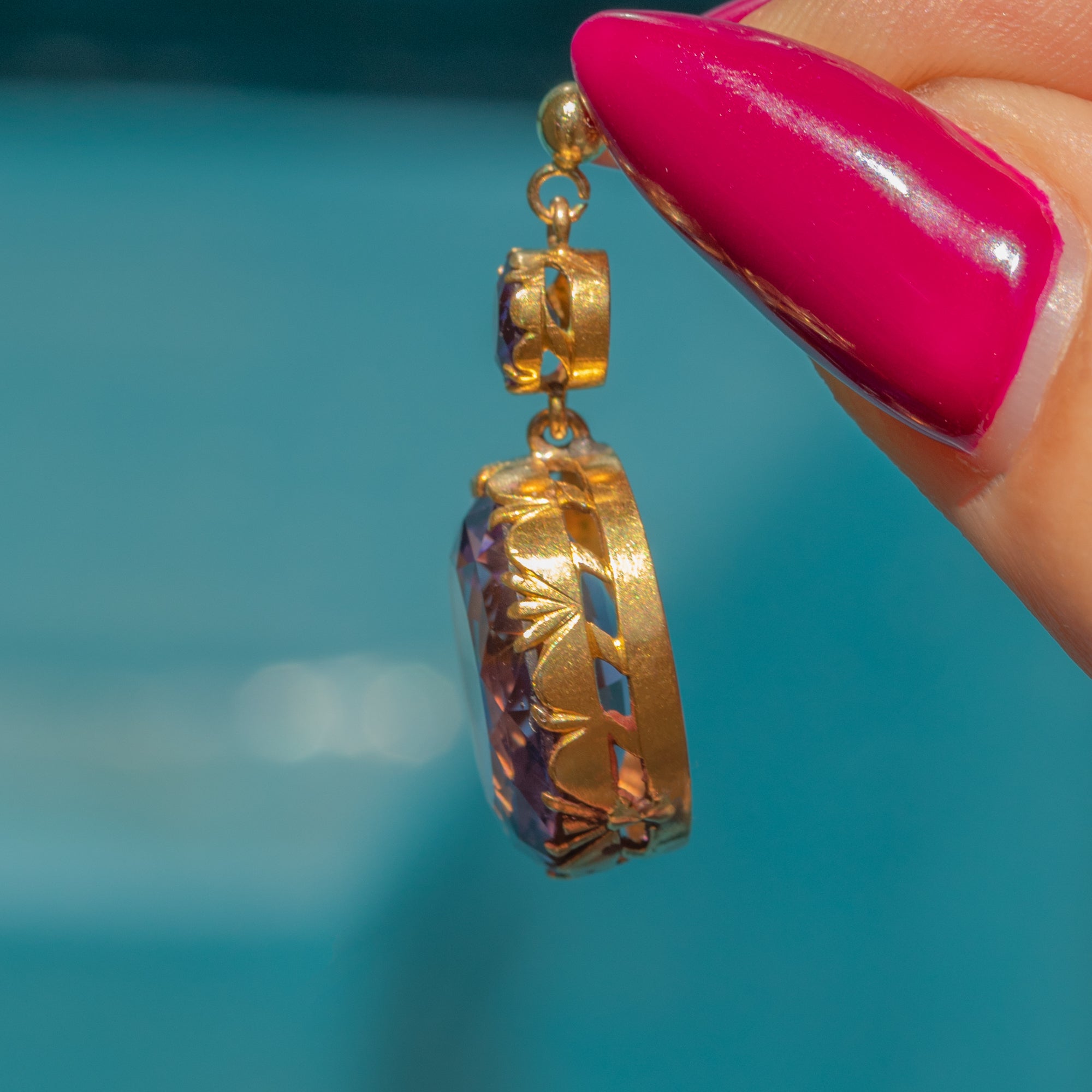 VERY GOOD-EXCELLENT: The Amethysts are gorgeous and secure in their settings, free from any chips or surface wear. The Gold is buttery with no signs of wear to the settings; you can be sure the gemstones are held securely all day long. There is some evidence of a previous conversion, from when they used to be part of a larger suite of jewellery, allowing you to enjoy them as this standout pair of earrings!