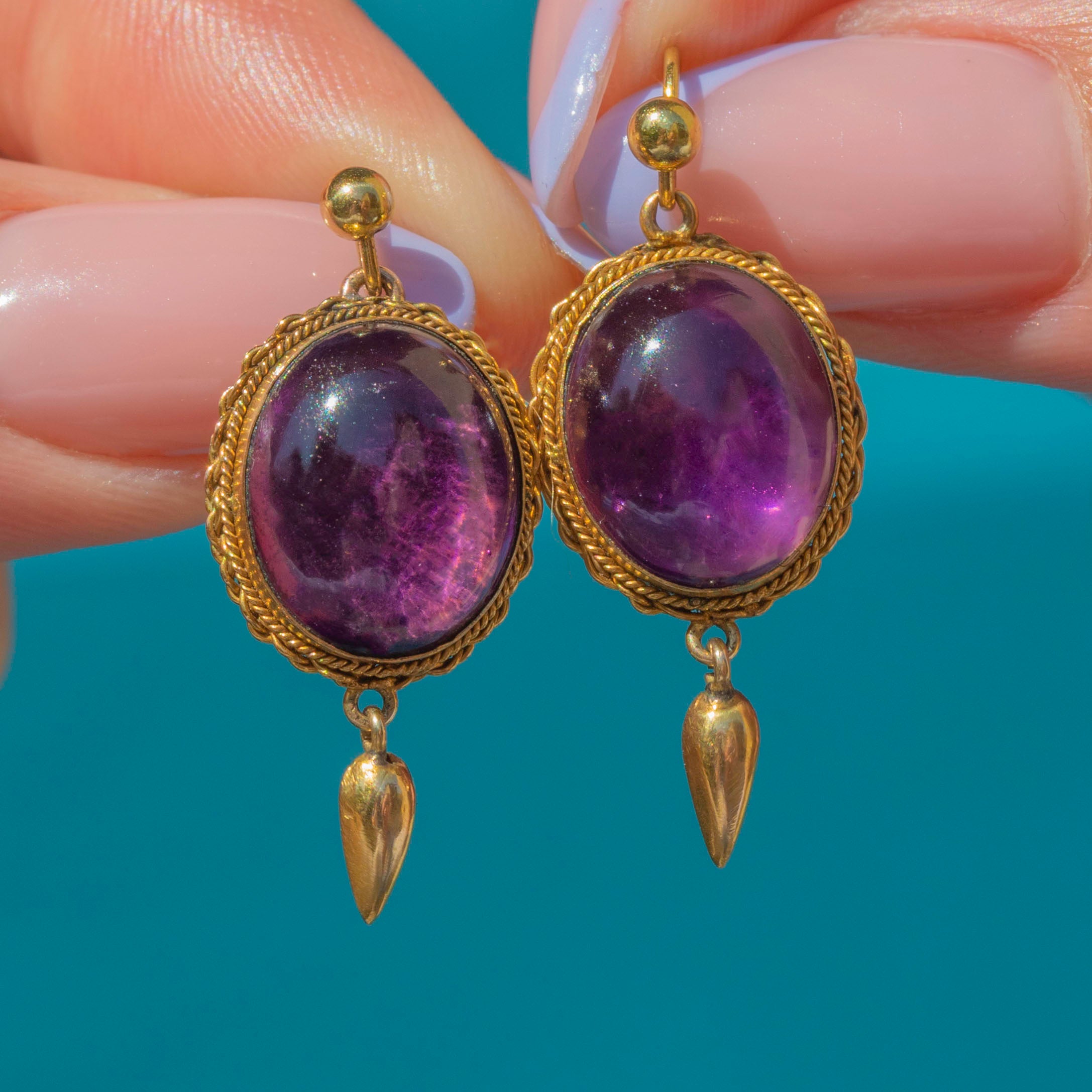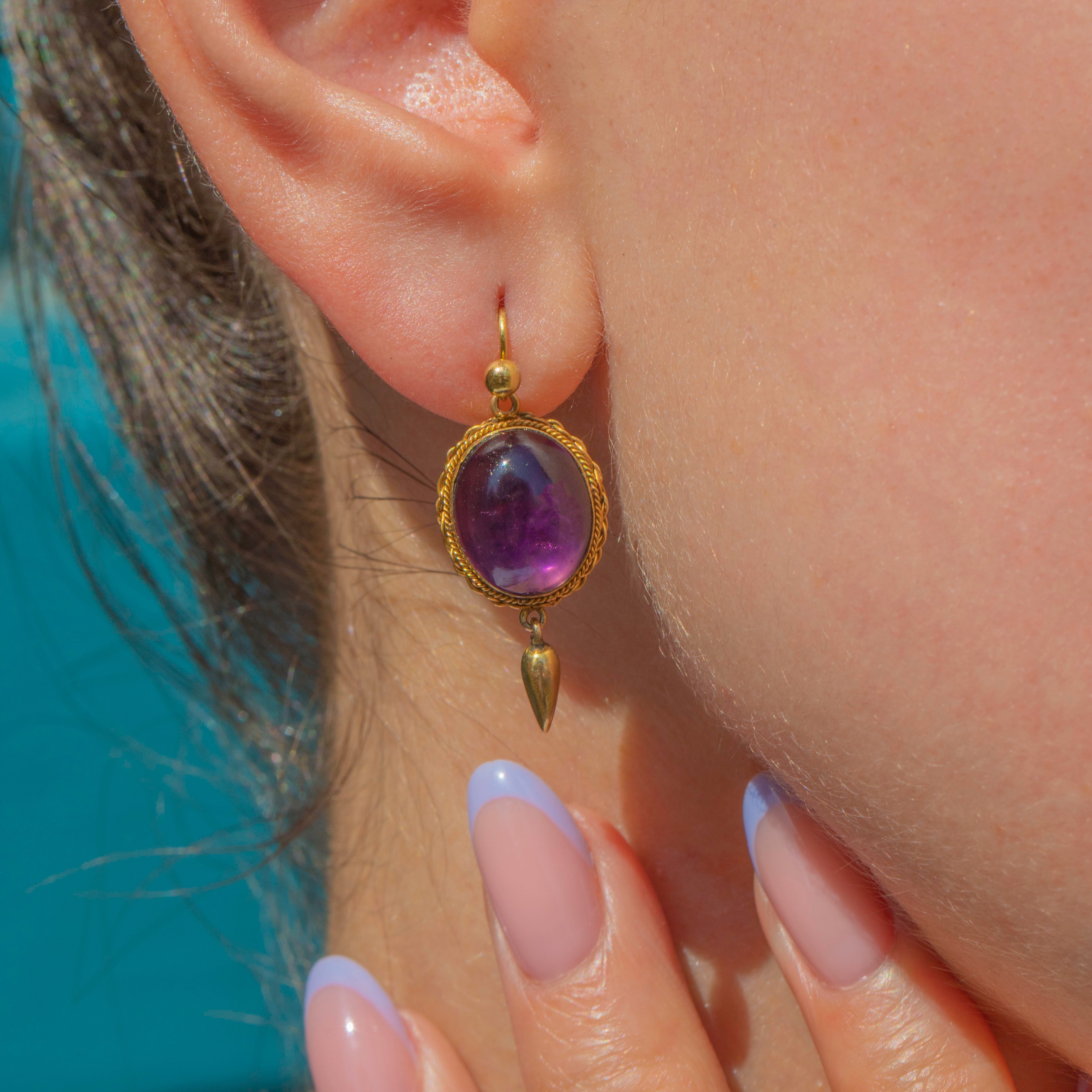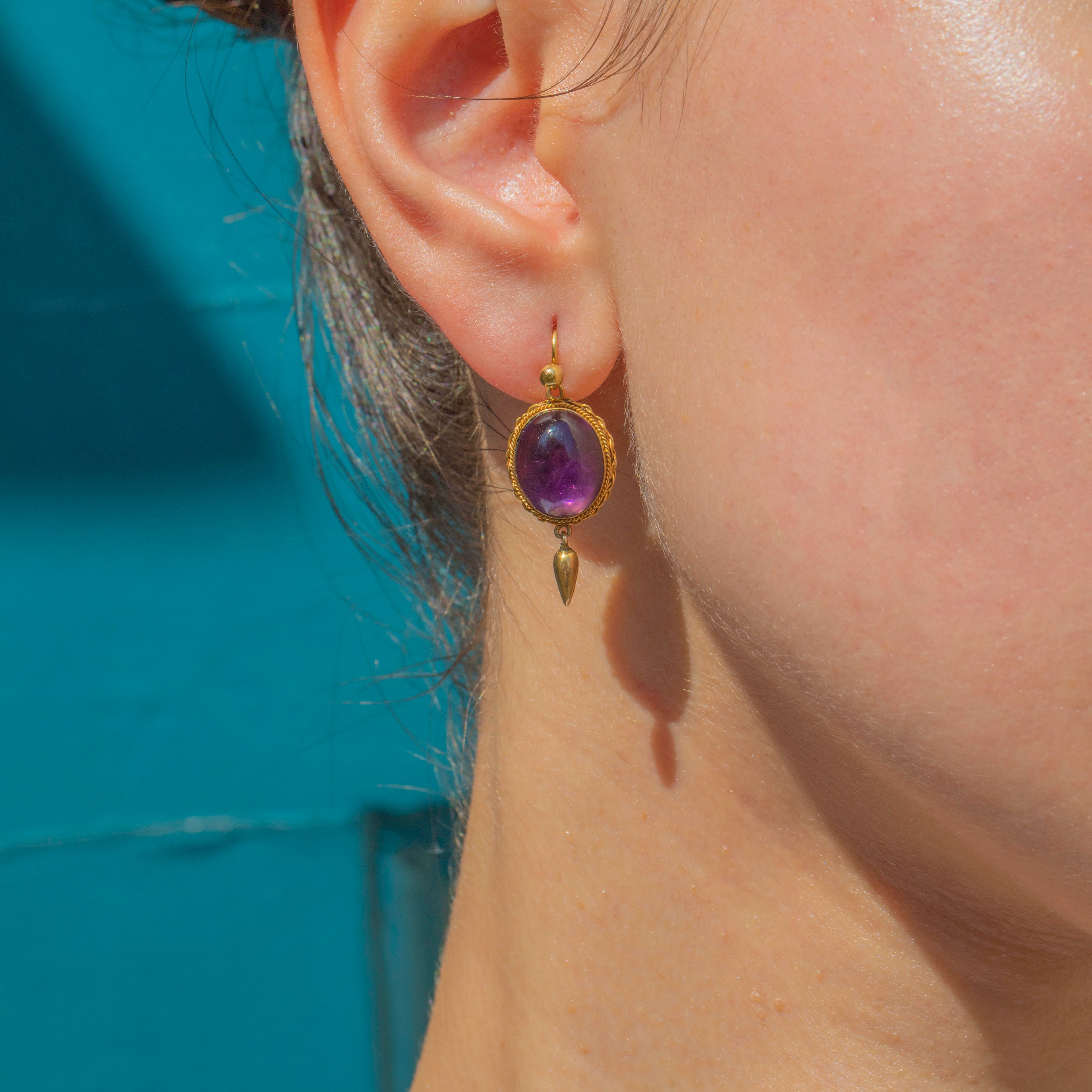 Each Victorian earring boasts a plump Amethyst Paste, radiating deep royal purple hues. They are set within buttery 15ct Gold rope bezels and complete with a drop detailing, adding a lovely movement to the pair.