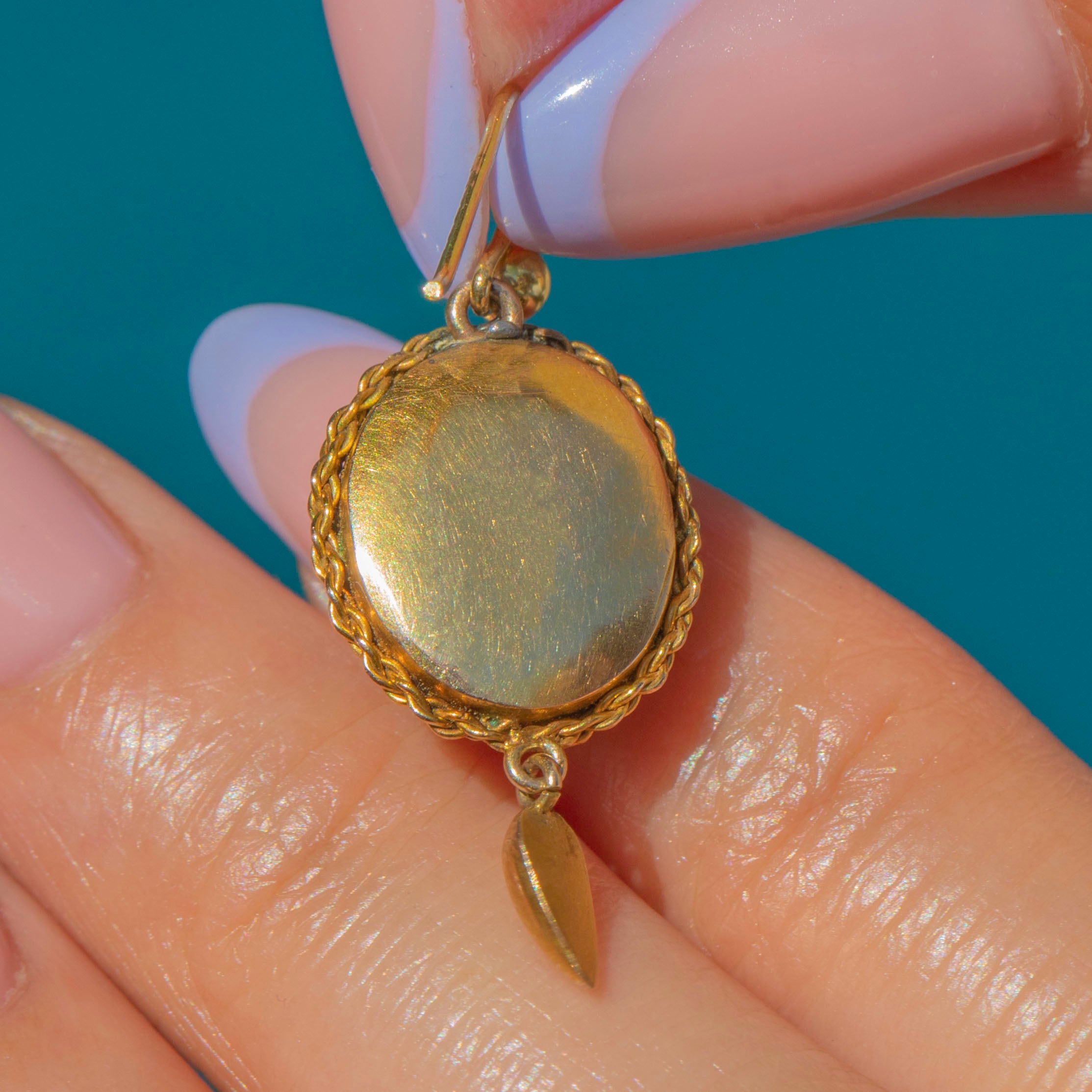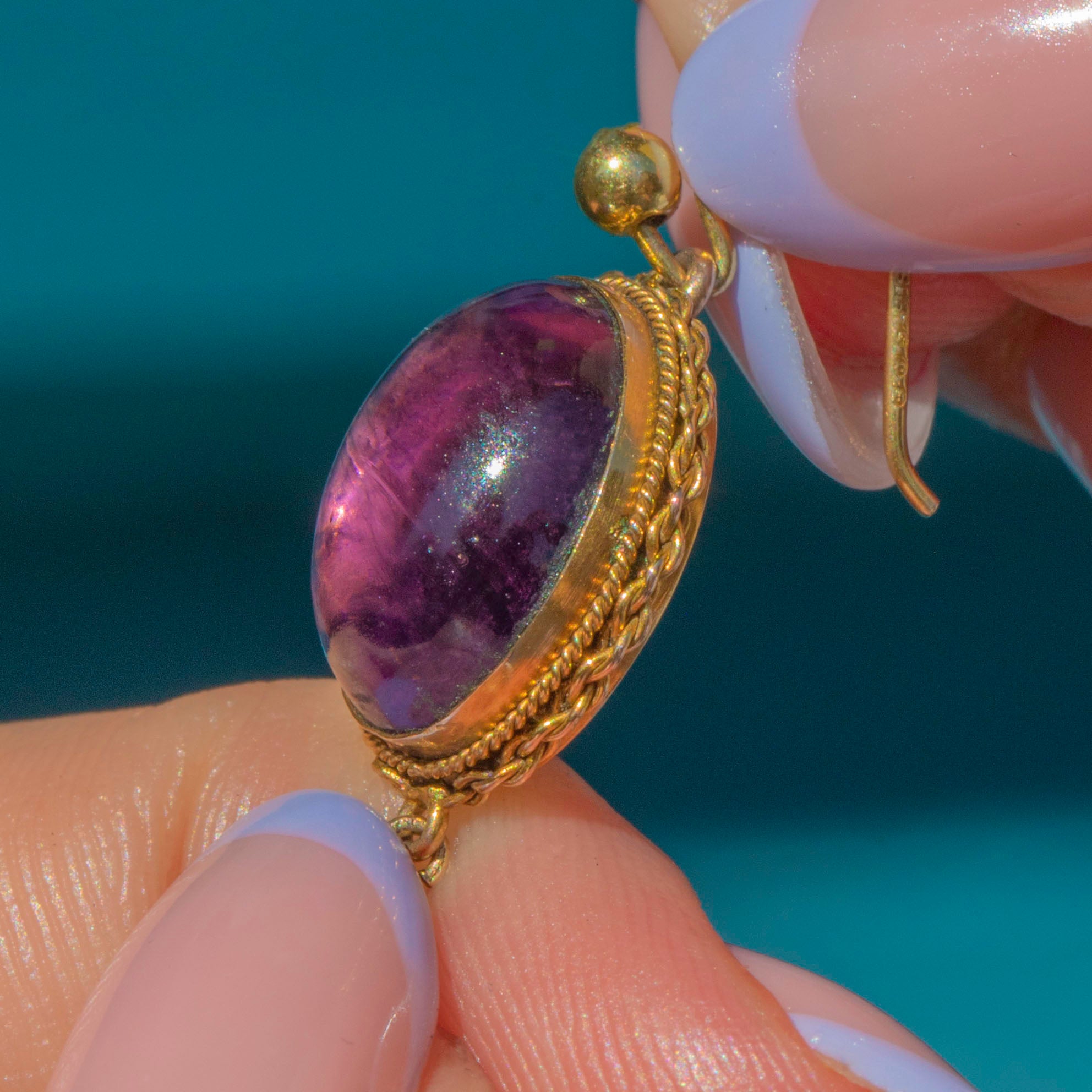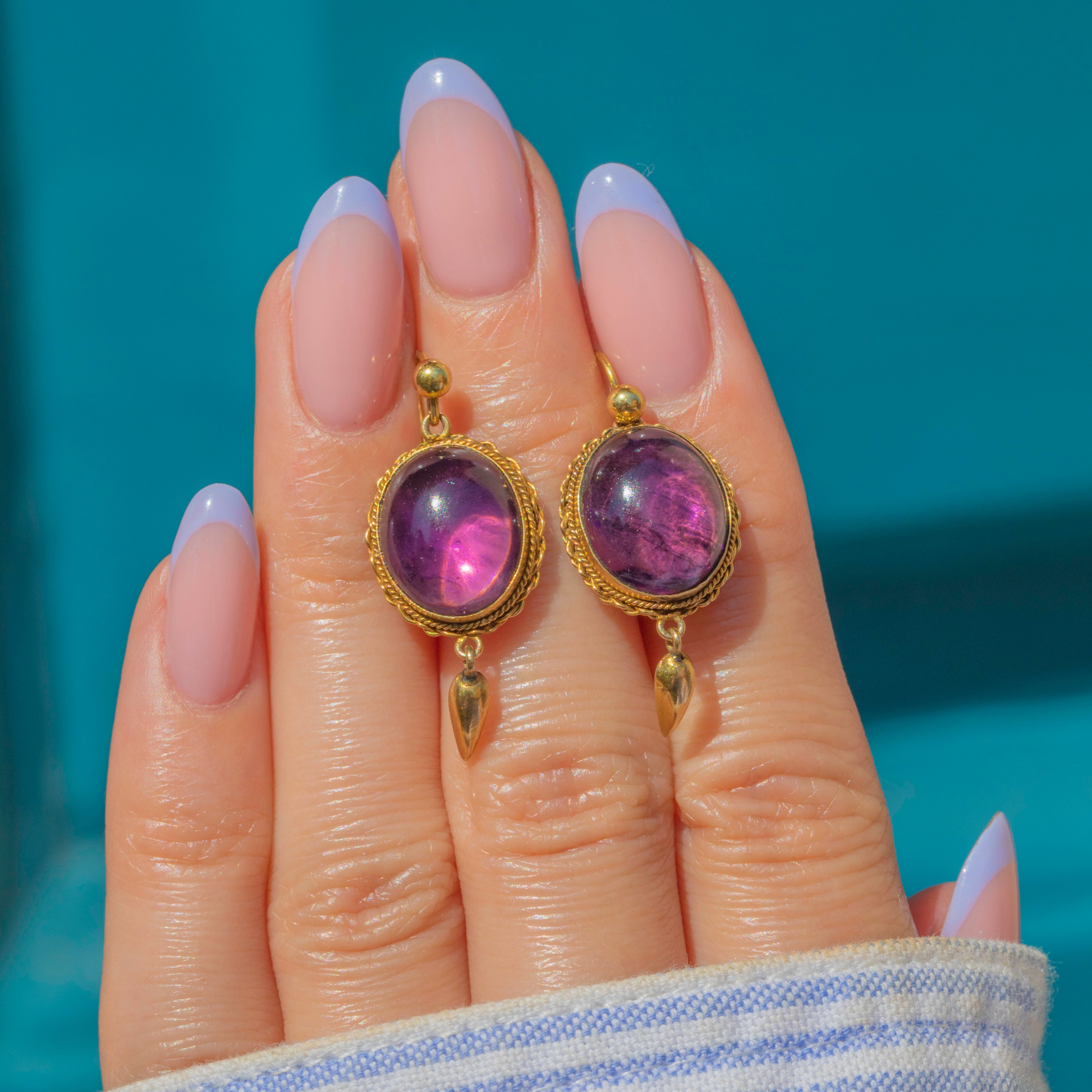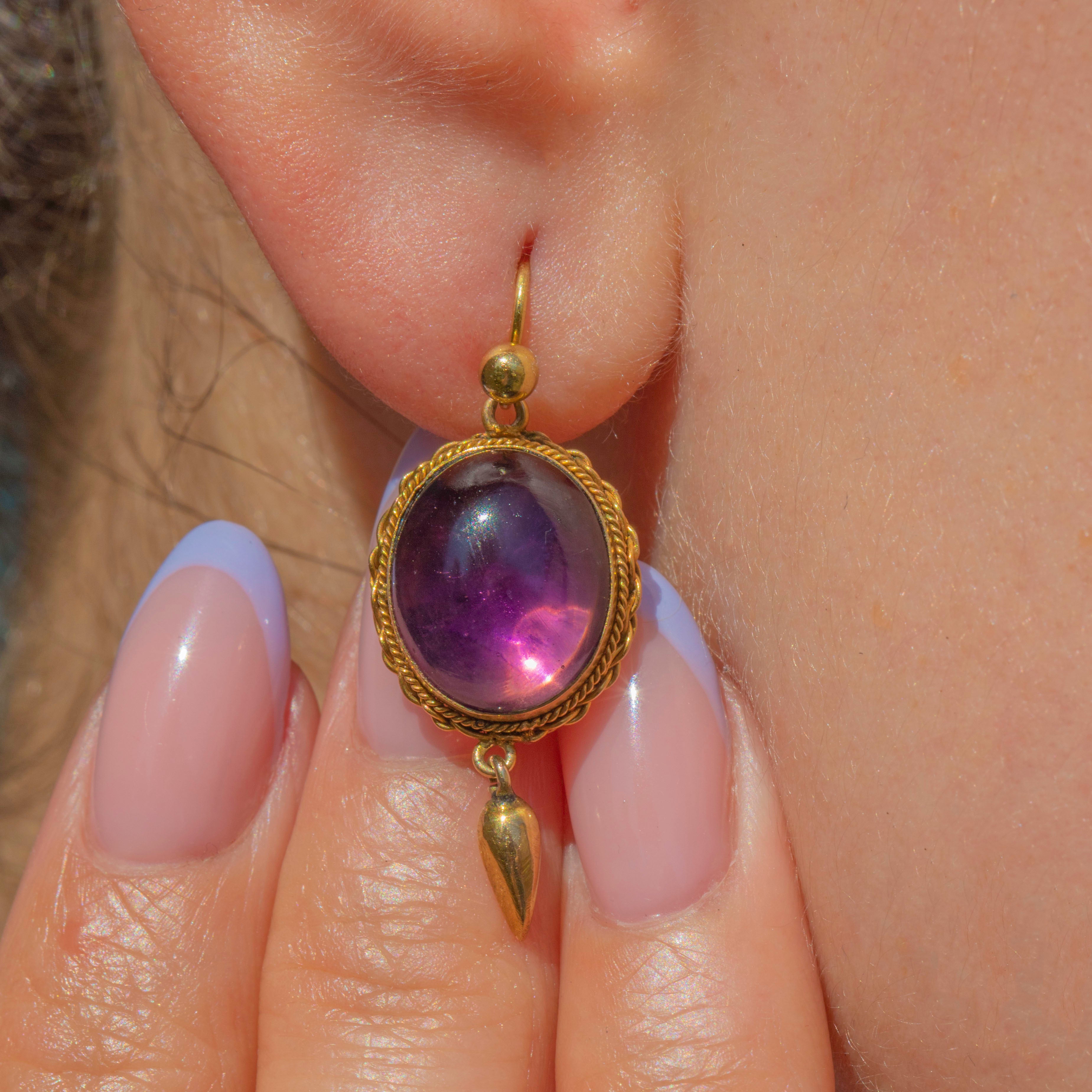 Each Victorian earring boasts a plump Amethyst Paste, radiating deep royal purple hues. They are set within buttery 15ct Gold rope bezels and complete with a drop detailing, adding a lovely movement to the pair.