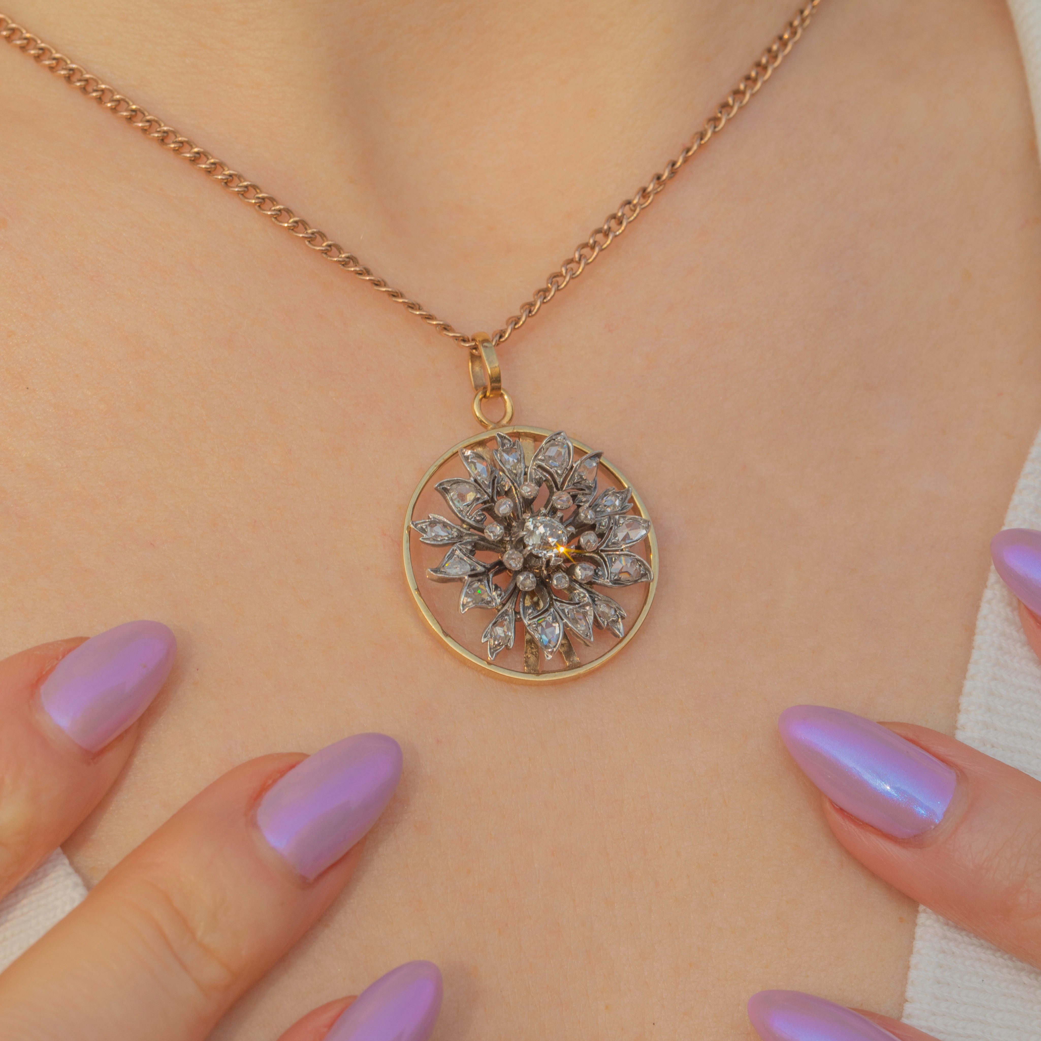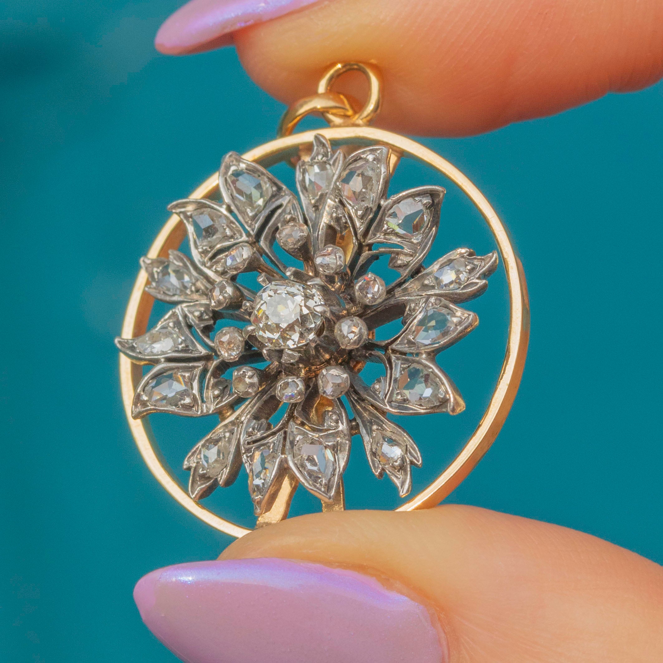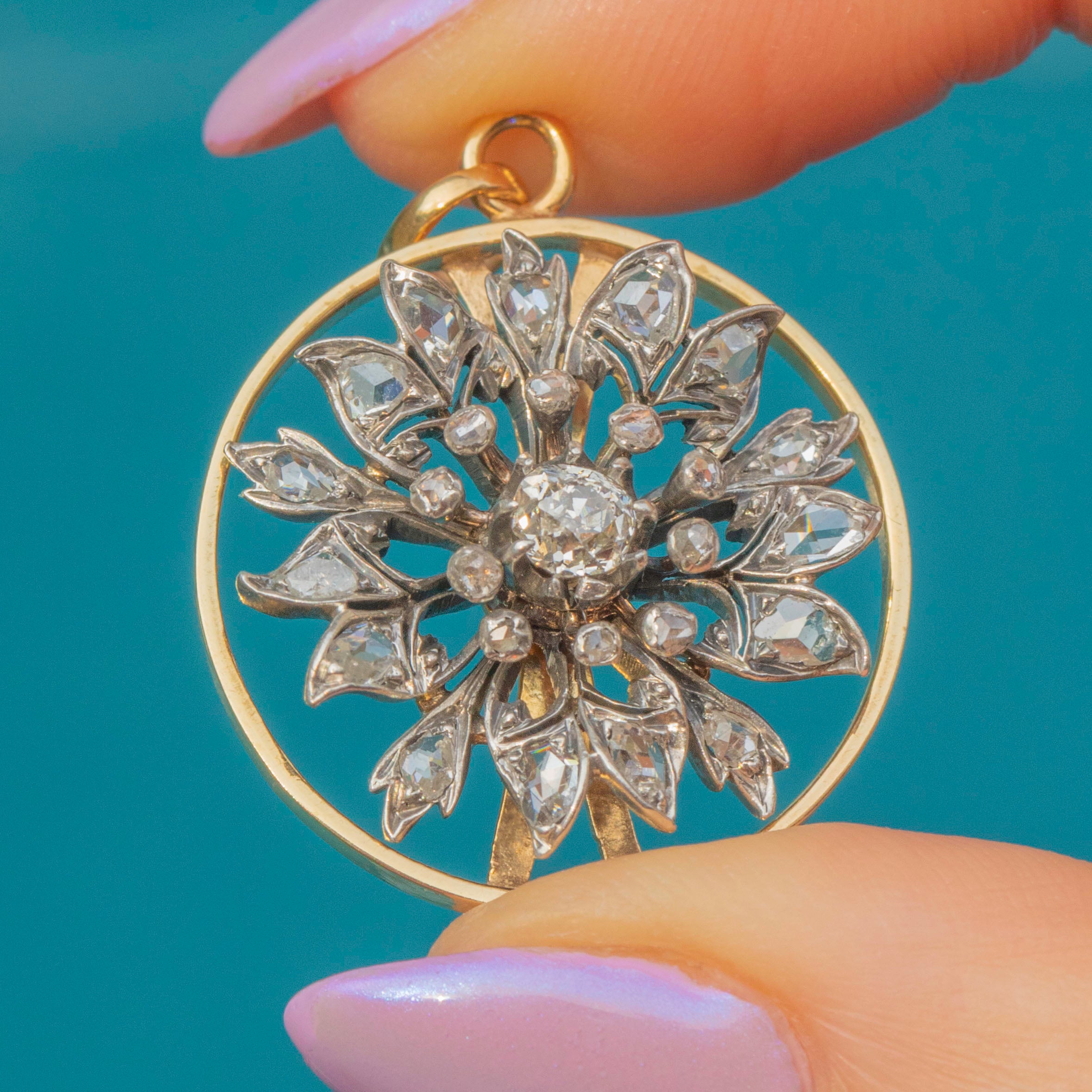This antique 15ct Gold Diamond flower pendant embodies Victorian glamour! In the very centre rests a crisp 0.25ct Diamond in a large flower motif, surrounded by a further 0.60cts extremely bright and lively antique Diamonds.