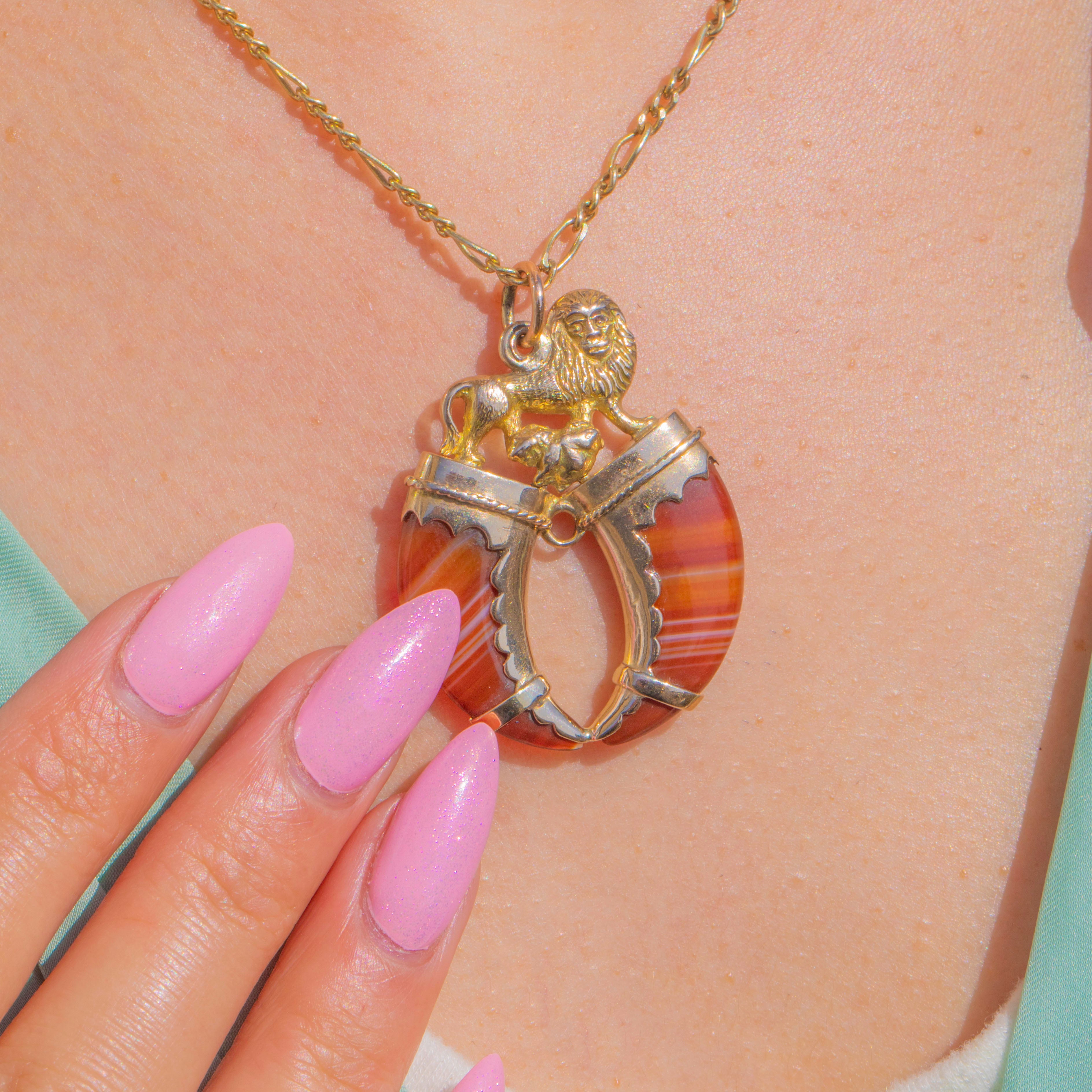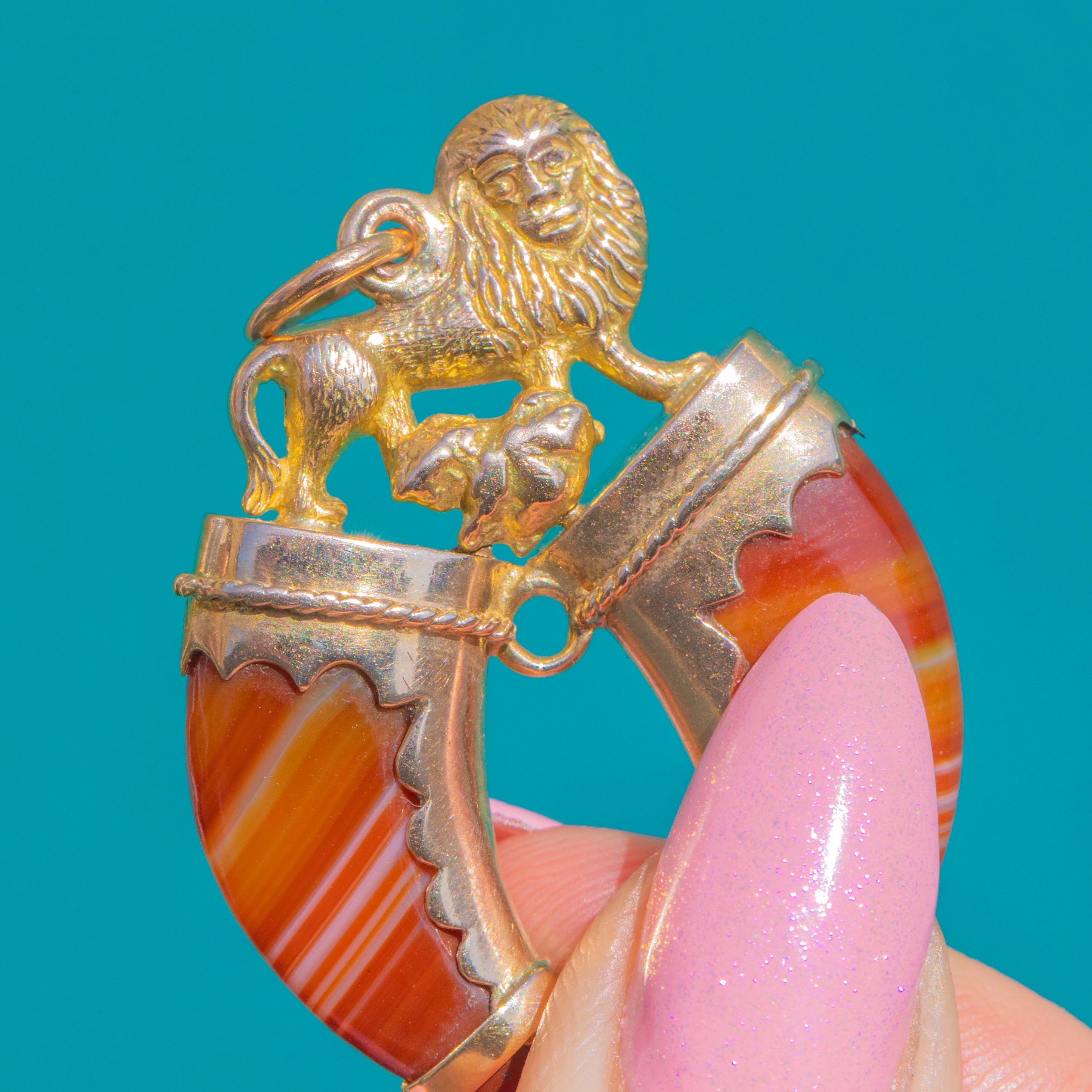 Ein eindrucksvoller Victorian Doppel-Talons-Anhänger, kunstvoll gefertigt aus 15ct Gold und besetzt mit zwei polierten, gebänderten Achaten in warmen Karamell- bis Rosttönen. Die gespiegelten „Talon“-Loben sind von gewellten Zargen mit feiner Kordelrand-Verzierung eingefasst; ihre natürlichen creme- und toffeefarbenen Streifen verleihen dem Schmuckstück wunderbare Bewegung und Tiefe.